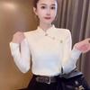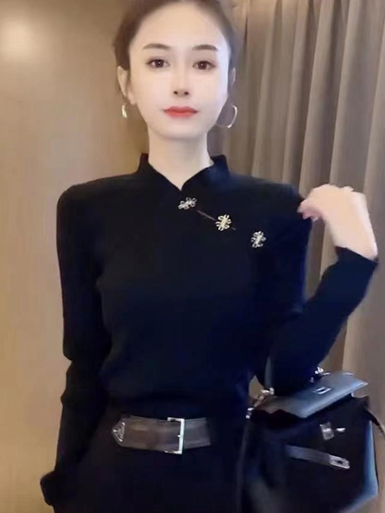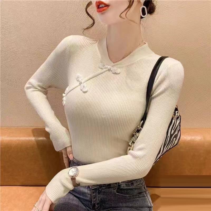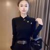 2024 Diseño de estilo chino temperamento moda estilo nacional hebilla color sólido ajustado camiseta básica manga larga top de punto para mujer