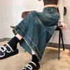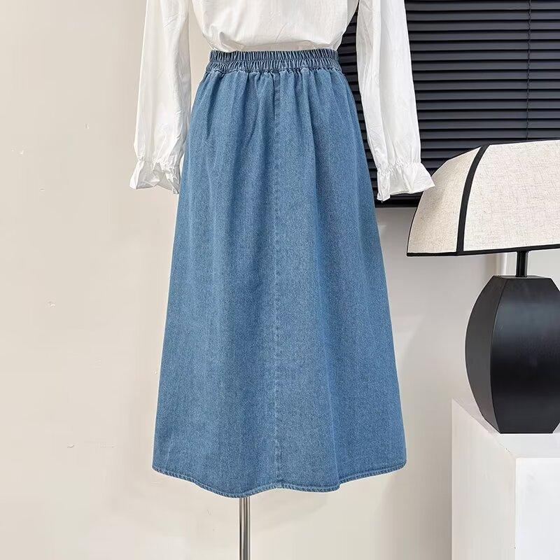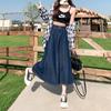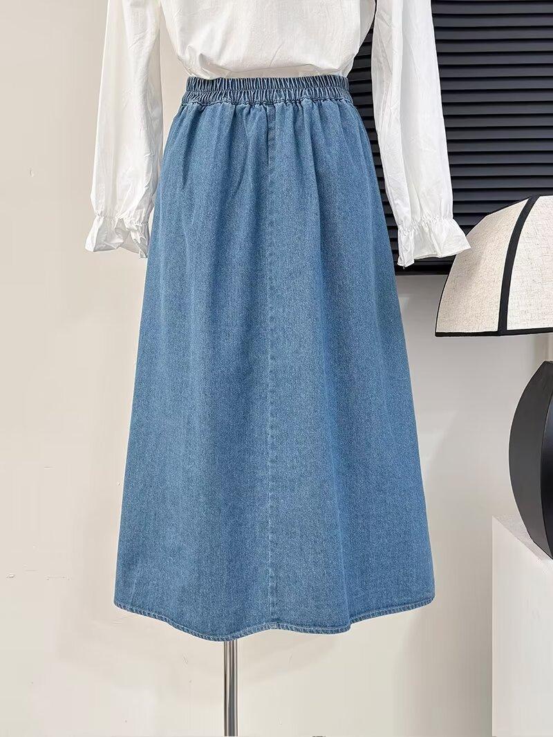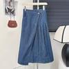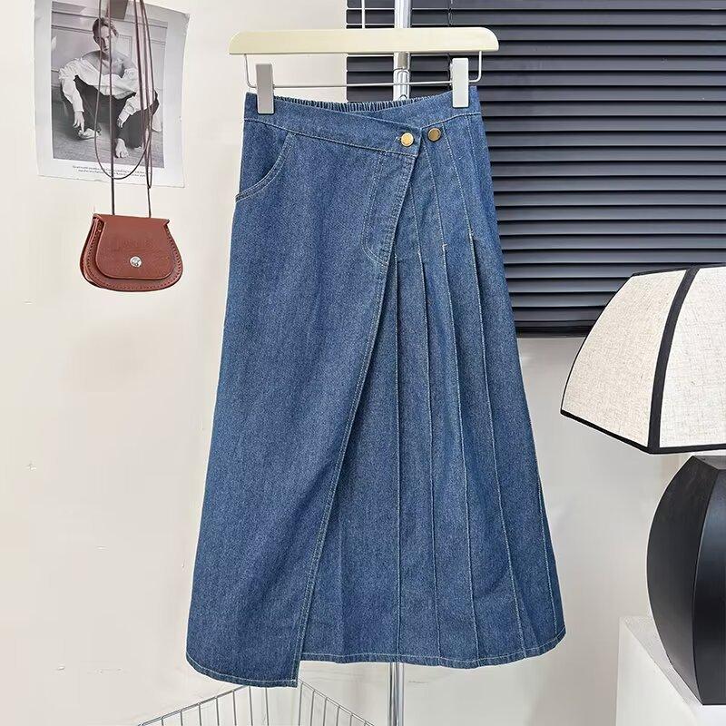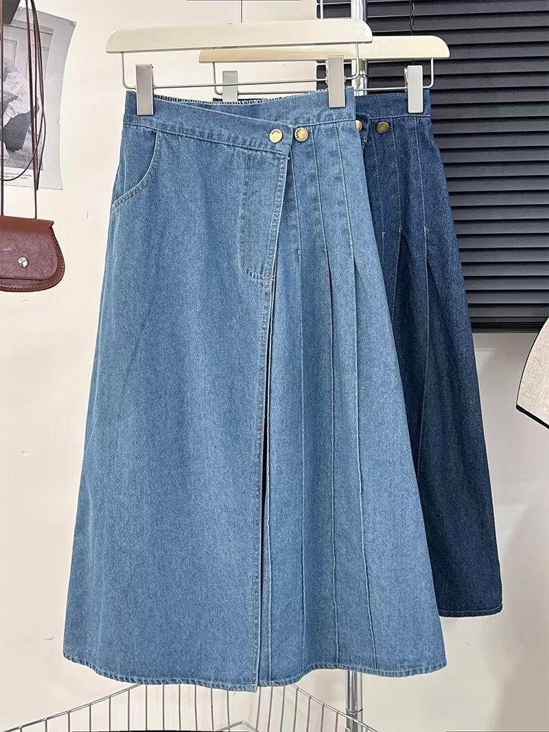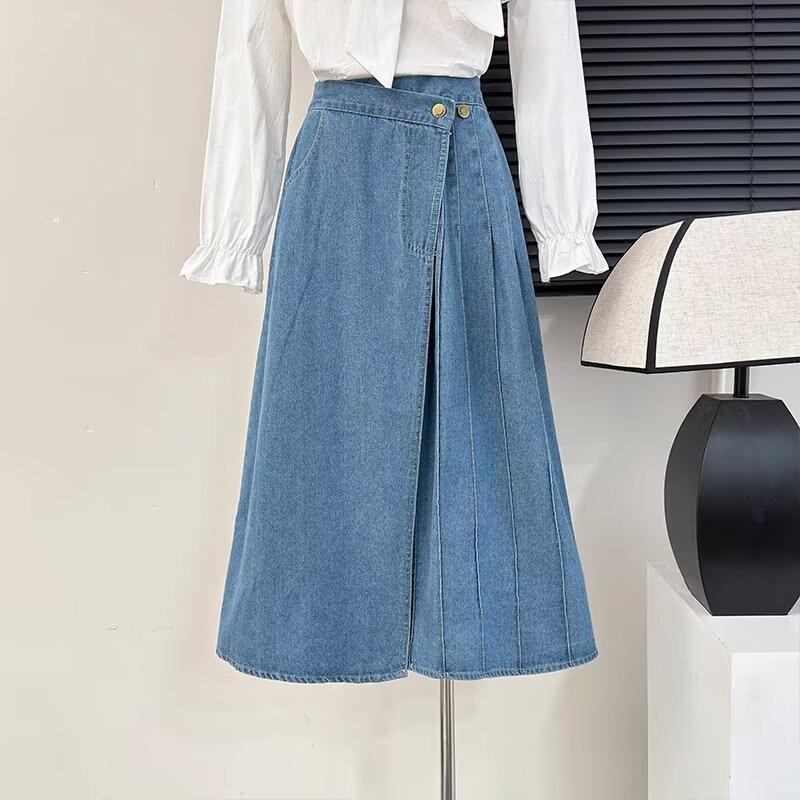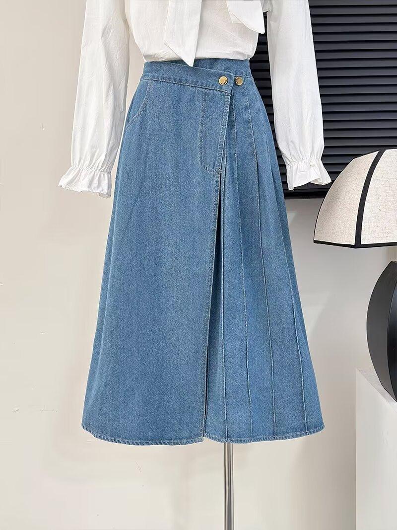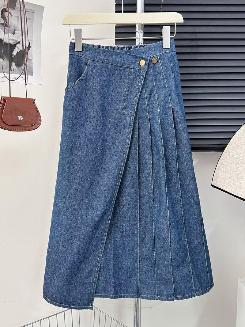 Falda Midi Plisada con Diseño de Otoño Asimétrica de Mezclilla para Mujer Casual Cintura Alta Ajustada Línea A Paraguas