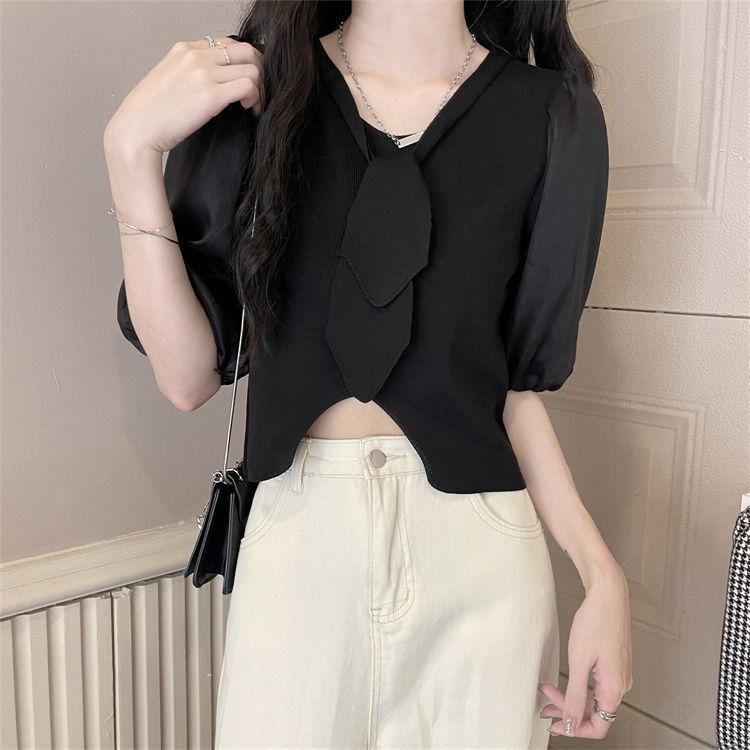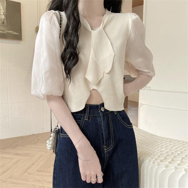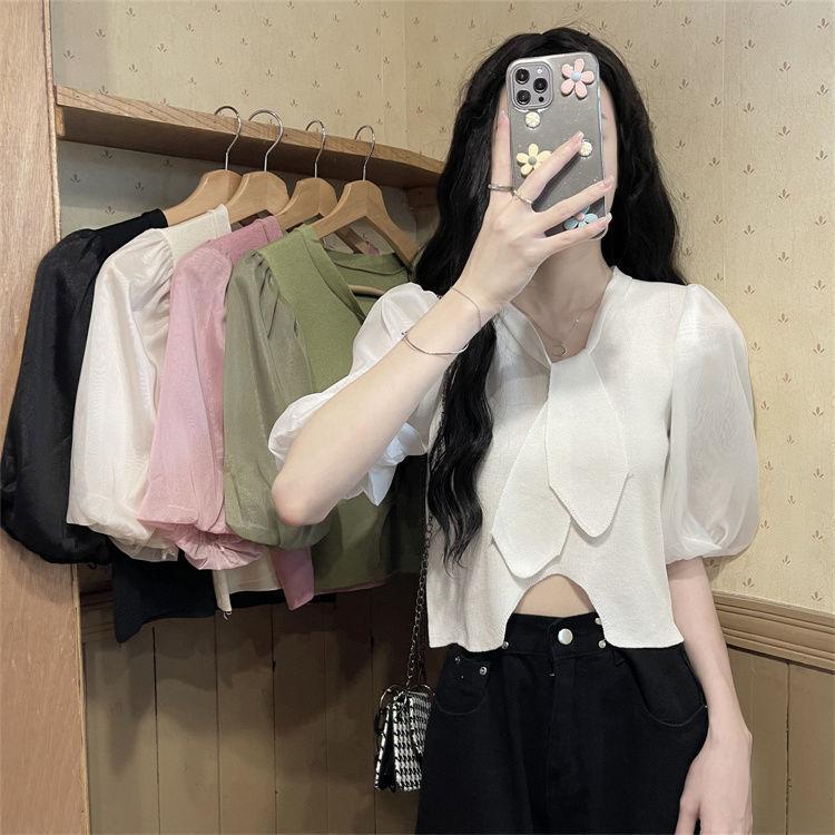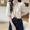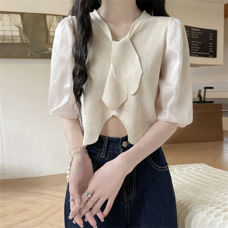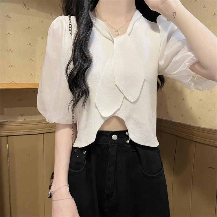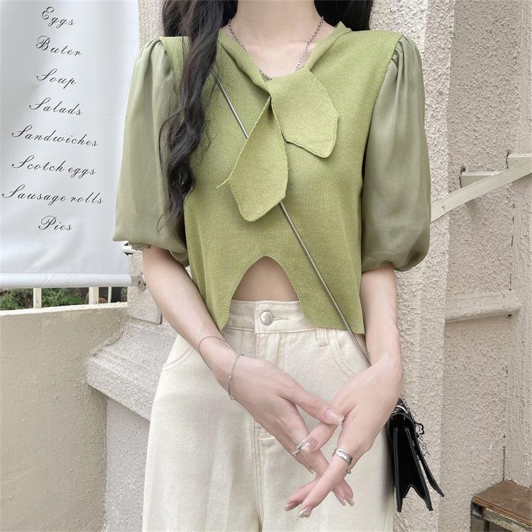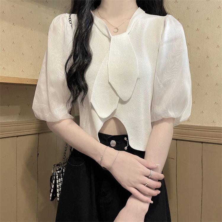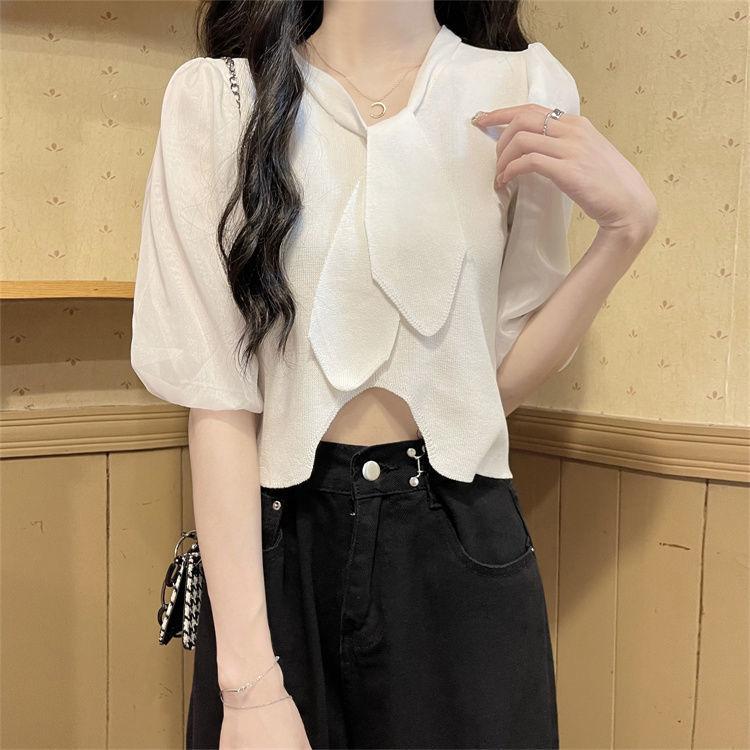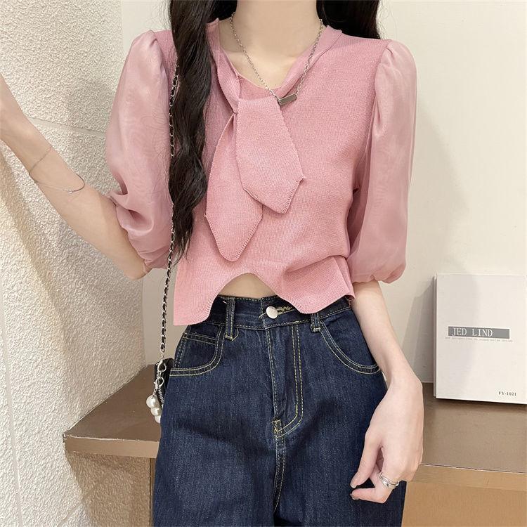 Suéter de manga corta de verano 2024, nuevo, diseño de nicho, estilo occidental, con cordones, temperamento suave, top corto que combina con todo.