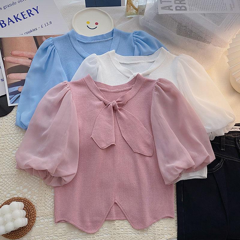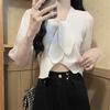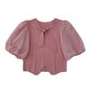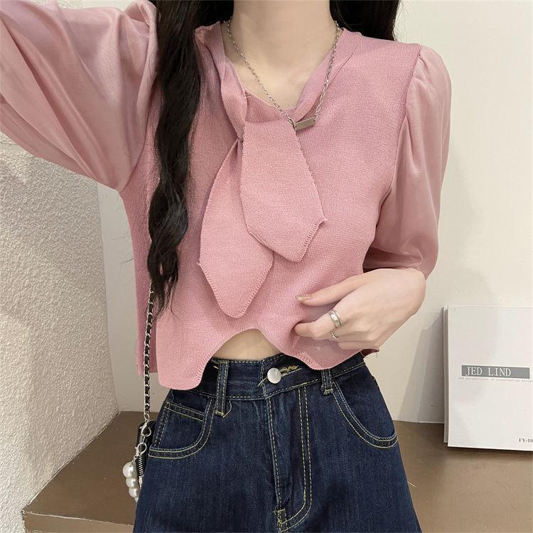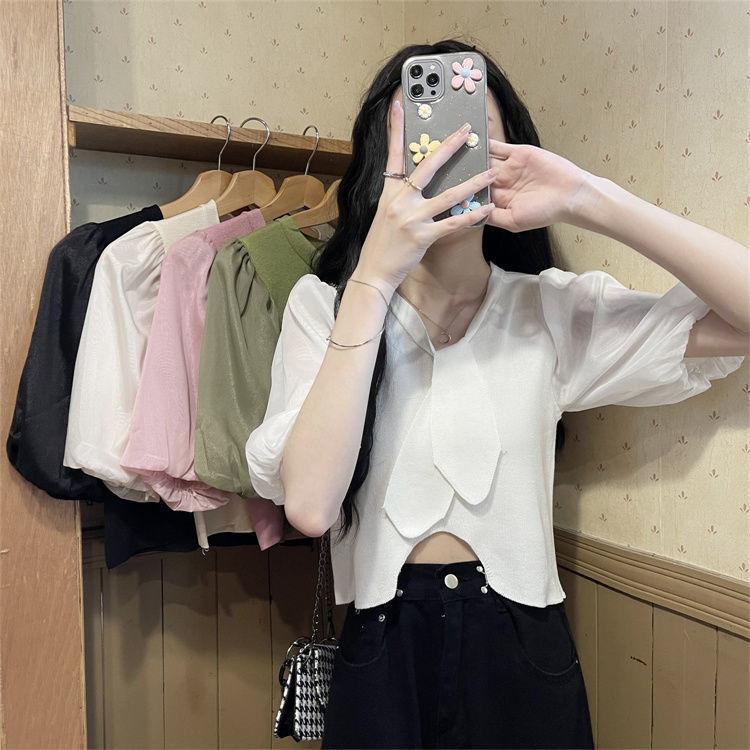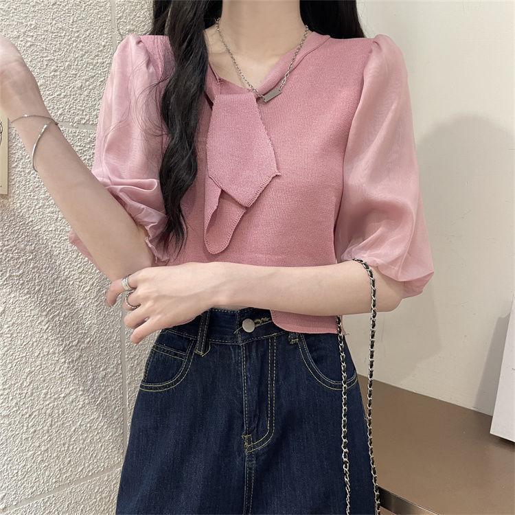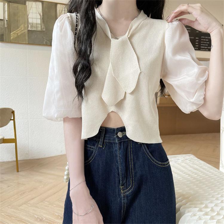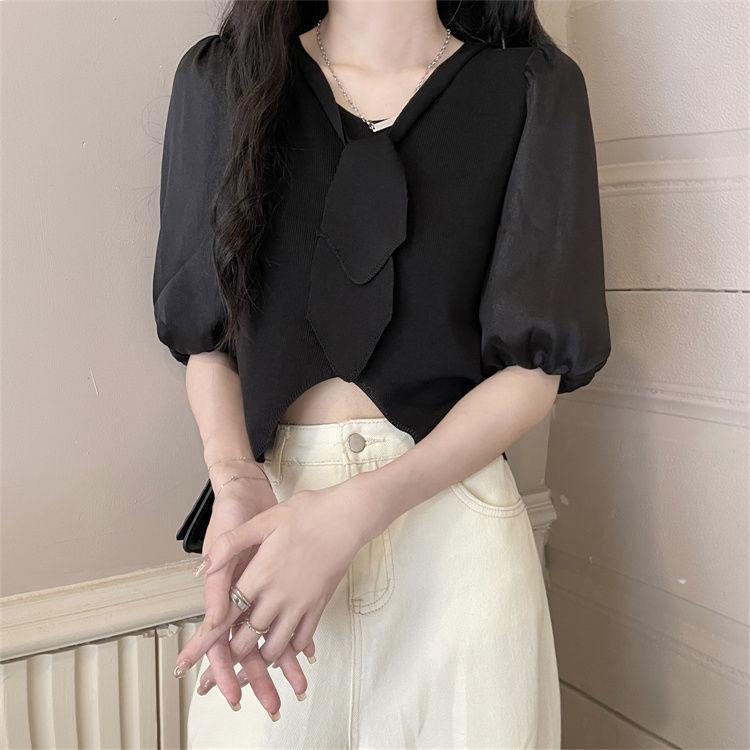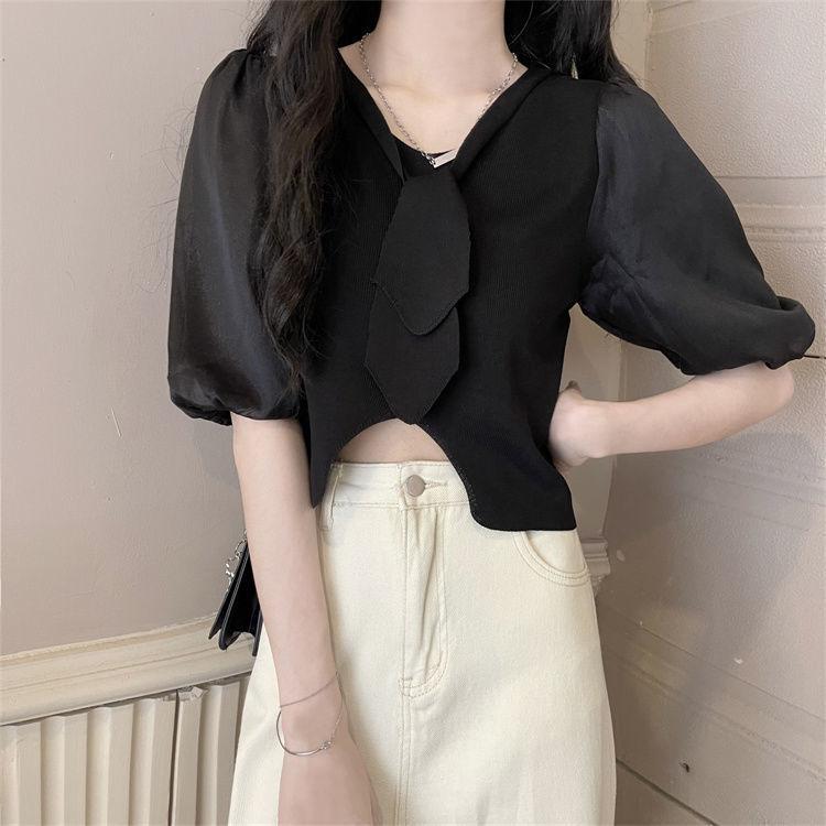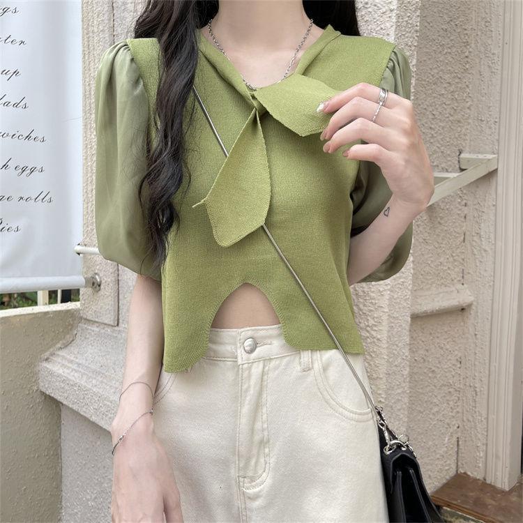 Suéter de manga corta de verano 2024, nuevo, diseño de nicho, estilo occidental, con cordones, temperamento suave, top corto que combina con todo.