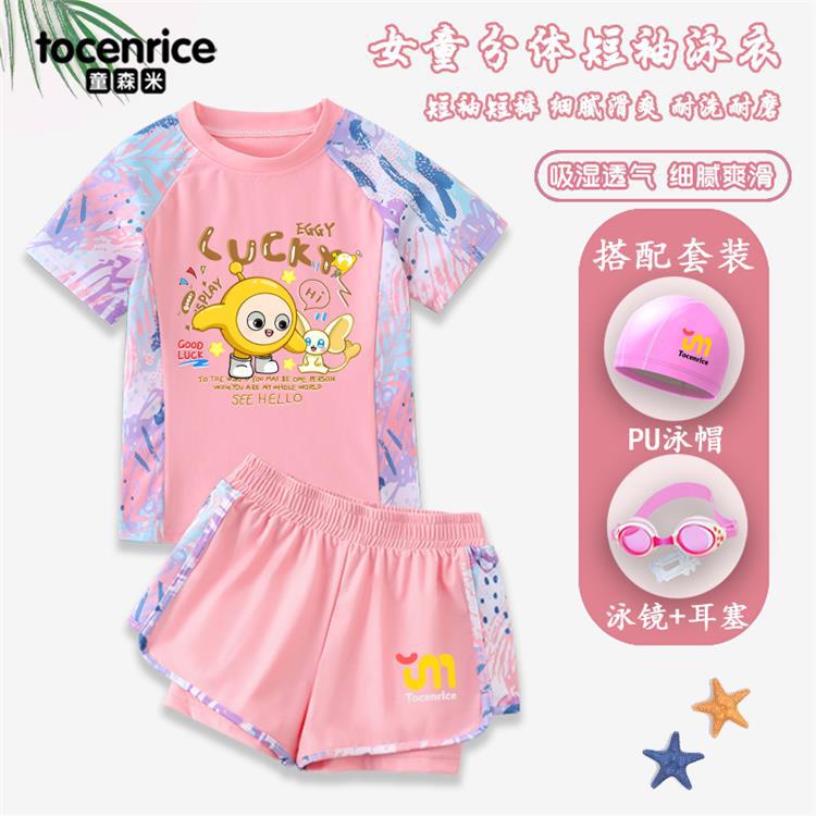 Pink split swimsuit (pu swimming cap), Pink split swimsuit (swimming goggles + pu swimming cap + earplugs), Pu...