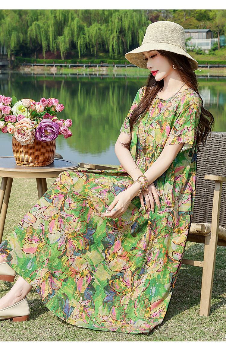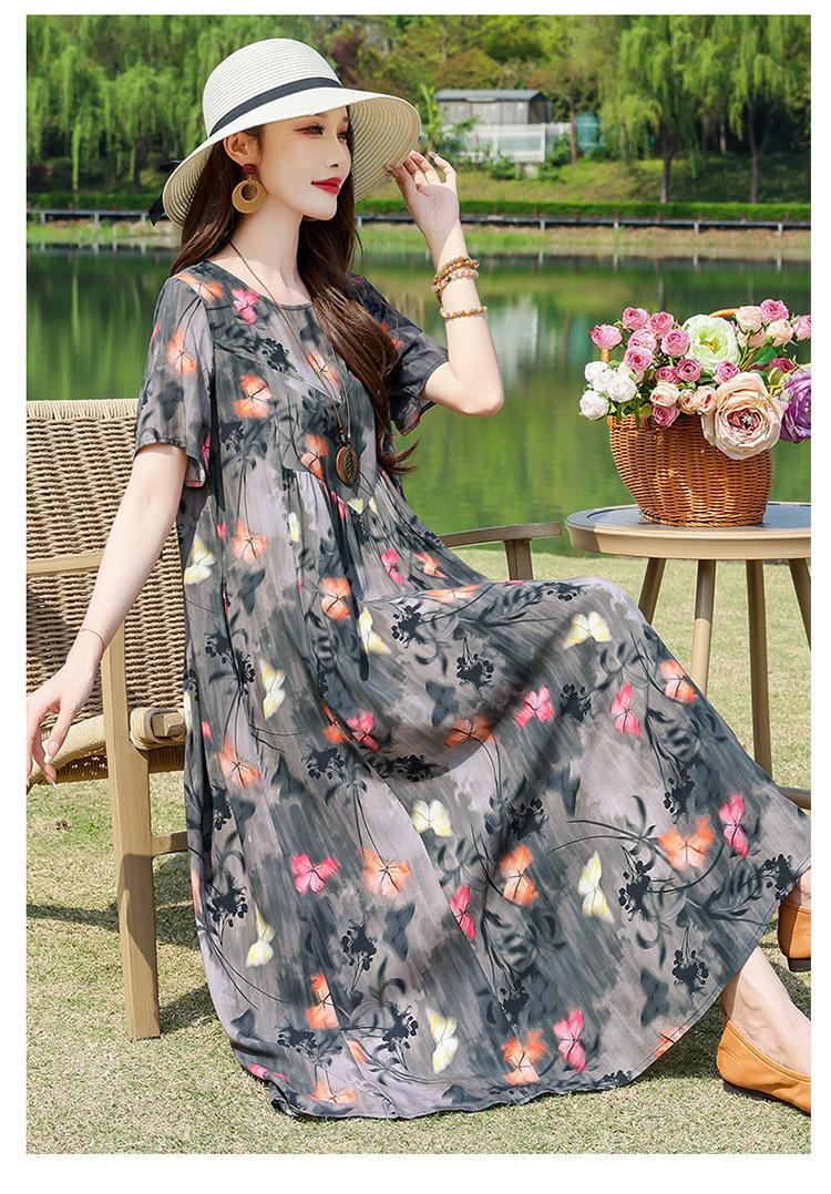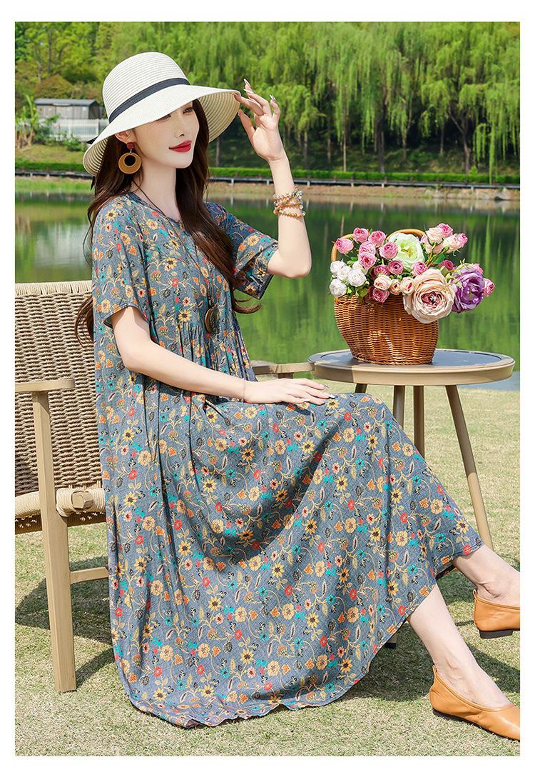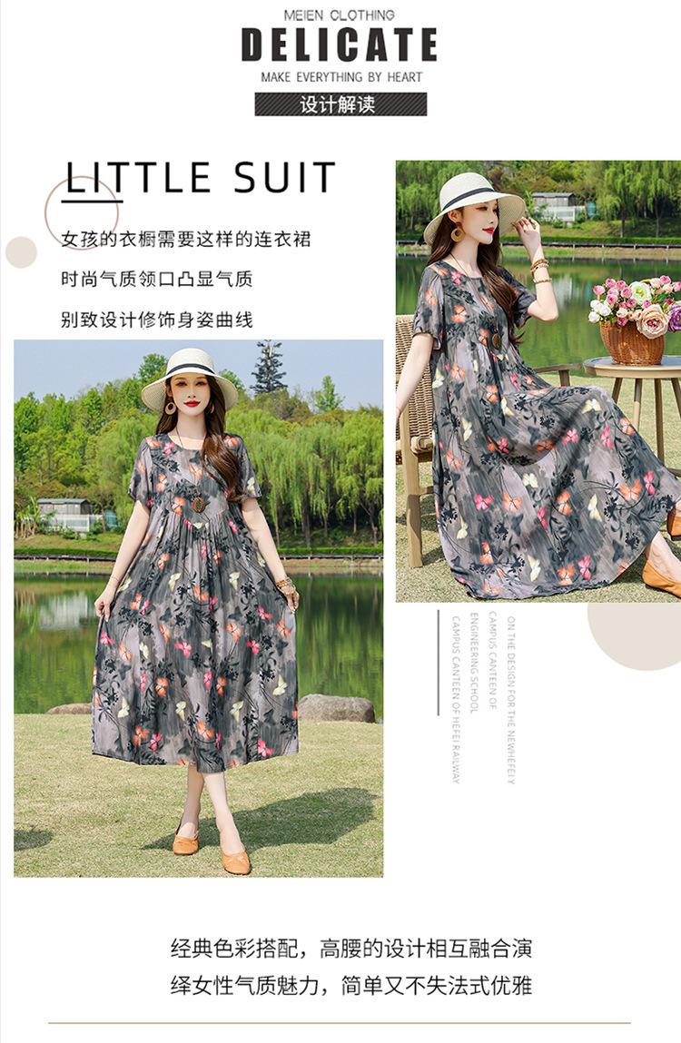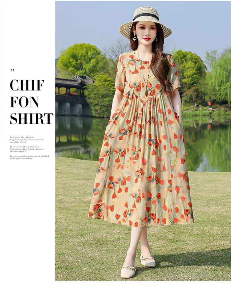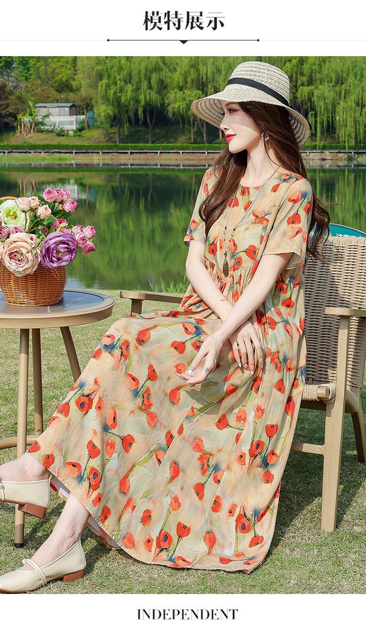 Nuevo vestido de verano de alta gama de algodón y seda para mujer, de longitud media, de moda, estilo occidental, falda de seda con flores artificiales de algodón.