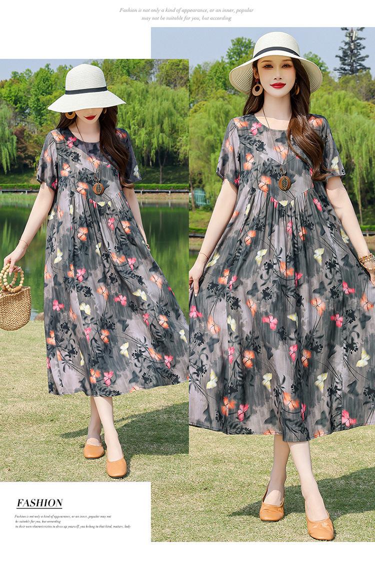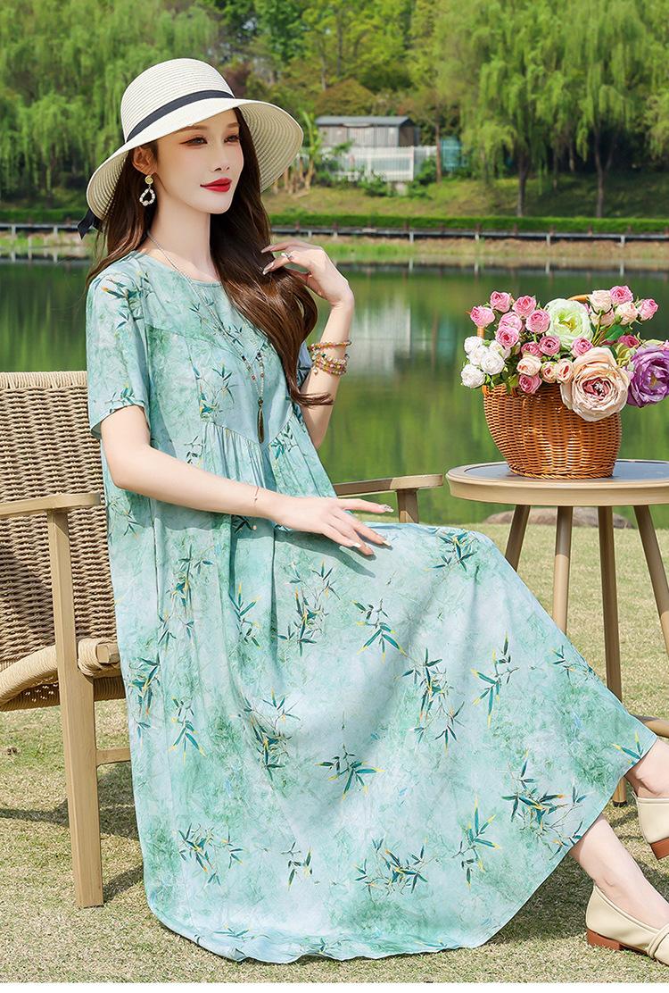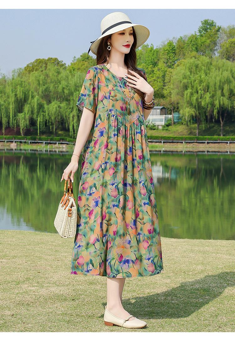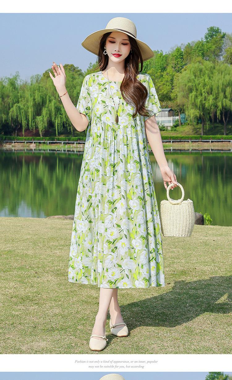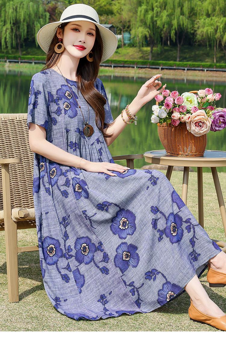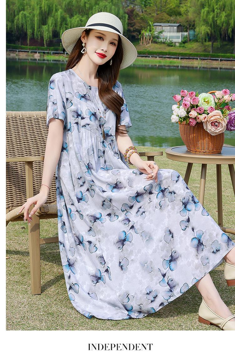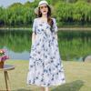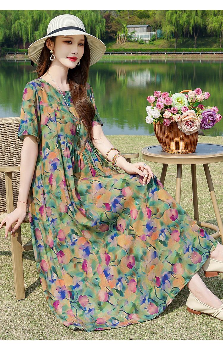 Nuevo vestido de verano de alta gama de algodón y seda para mujer, de longitud media, de moda, estilo occidental, falda de seda con flores artificiales de algodón.