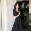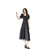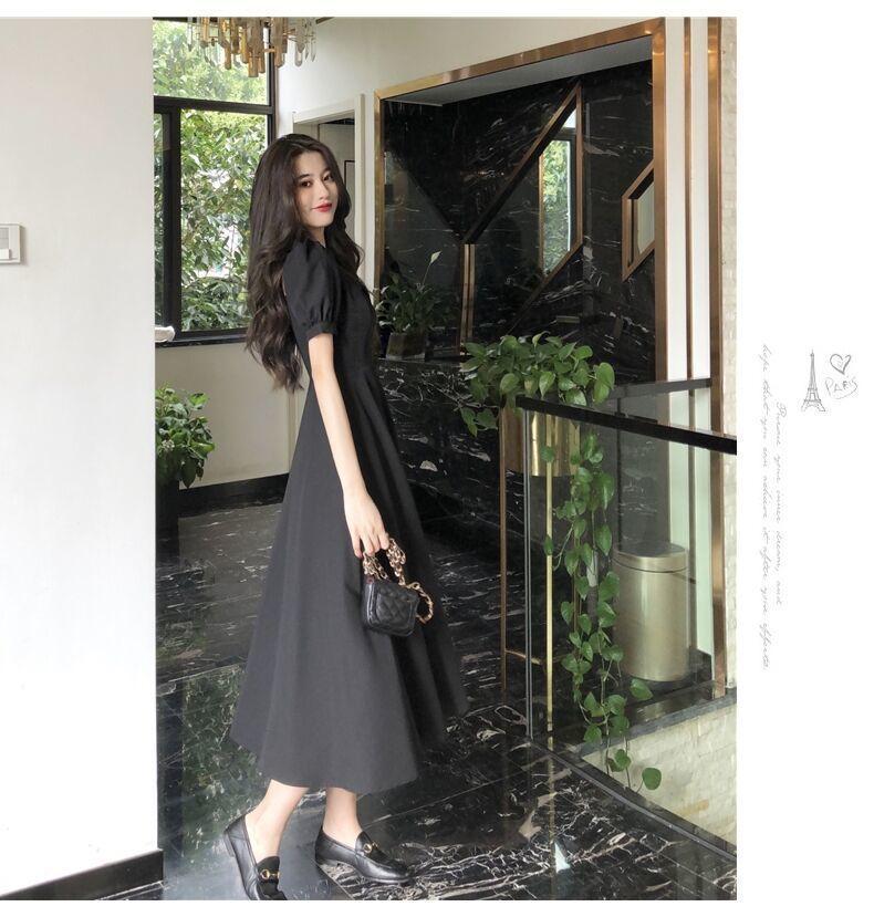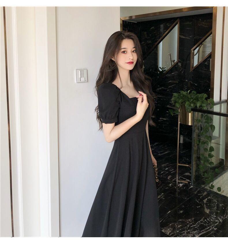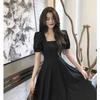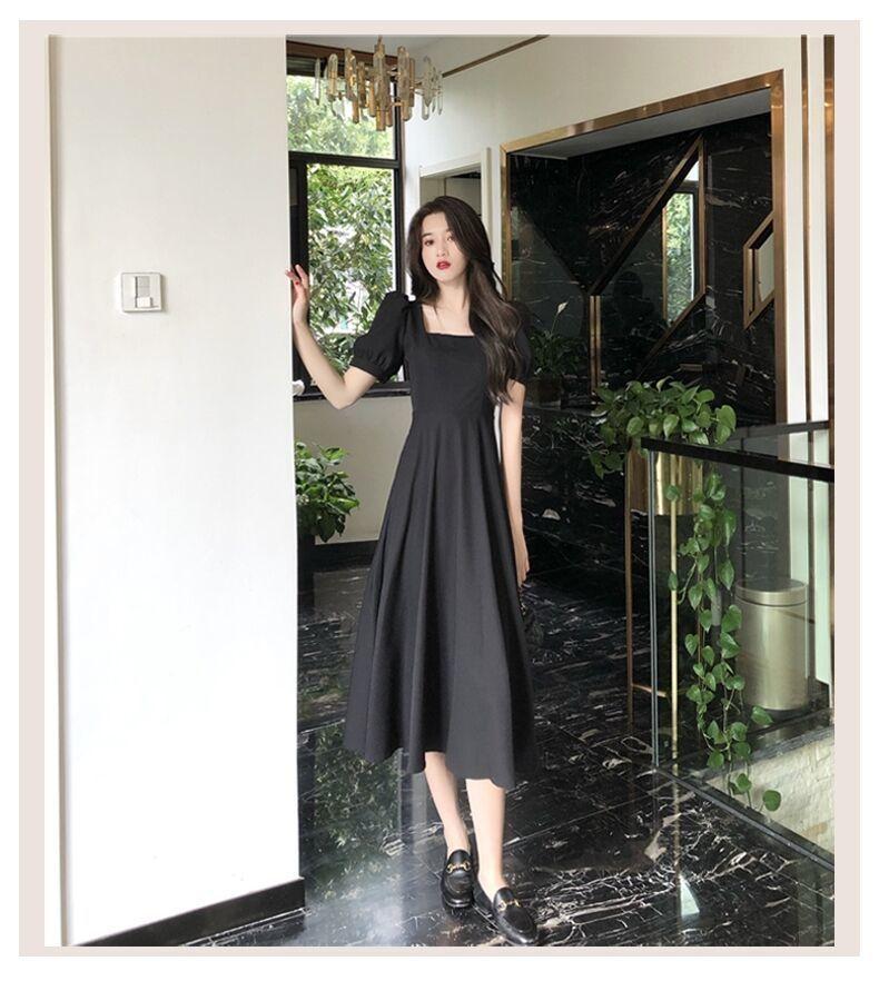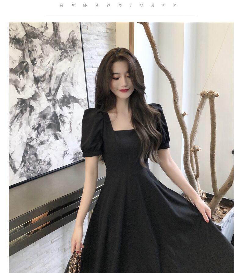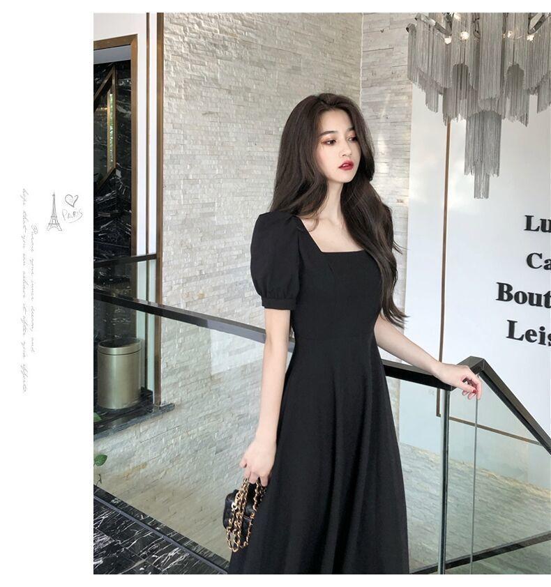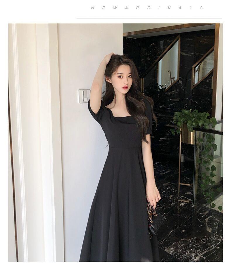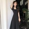 Vestido Estilo Hepburn para Mujer 2025 Nuevo Verano Look Adelgazante de Cintura Vestidito Negro Cuello Cuadrado Francés Falda Larga hasta la Rodilla Negro