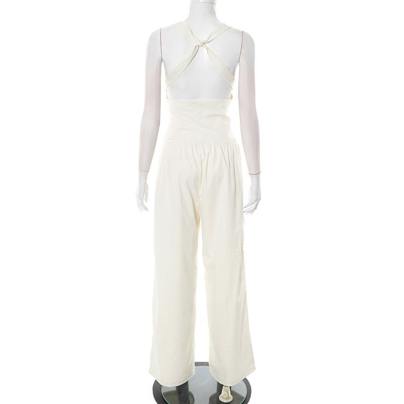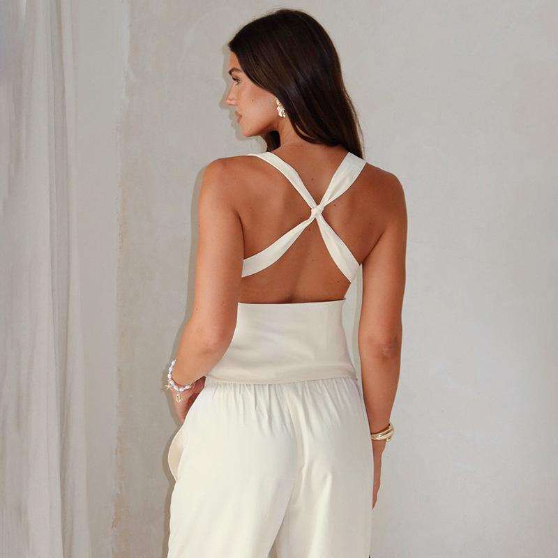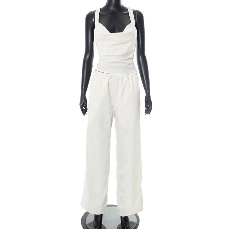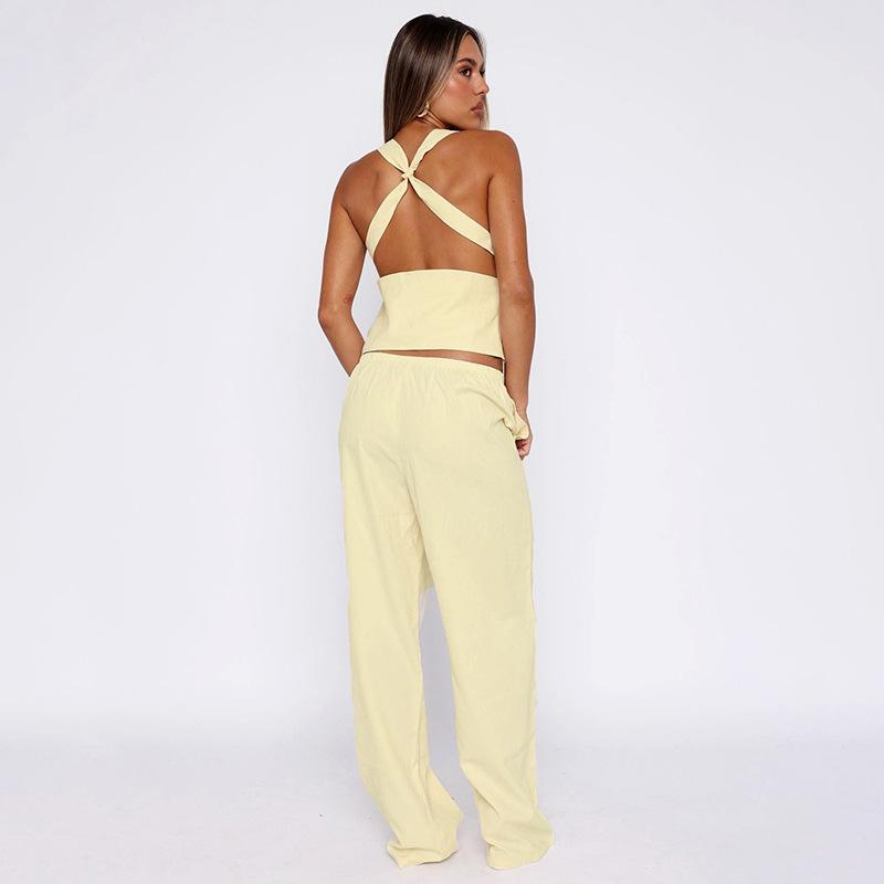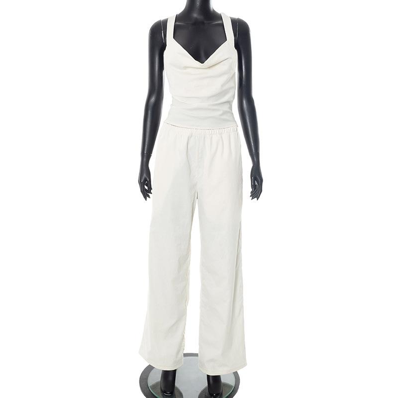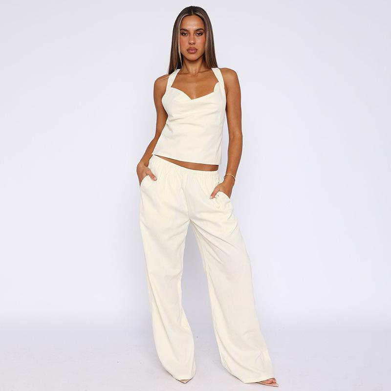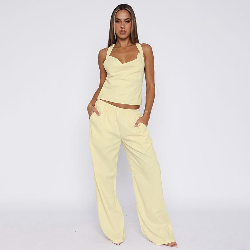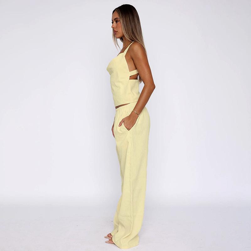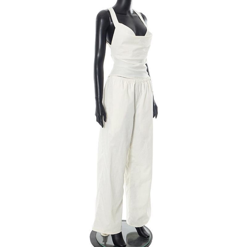 Amazon 2025 Nuevo Traje de Verano para Mujer Europeo y Americano Nuevo Color Sólido Sin Mangas Tirantes Cruzados Pantalón Recto para Mujer