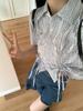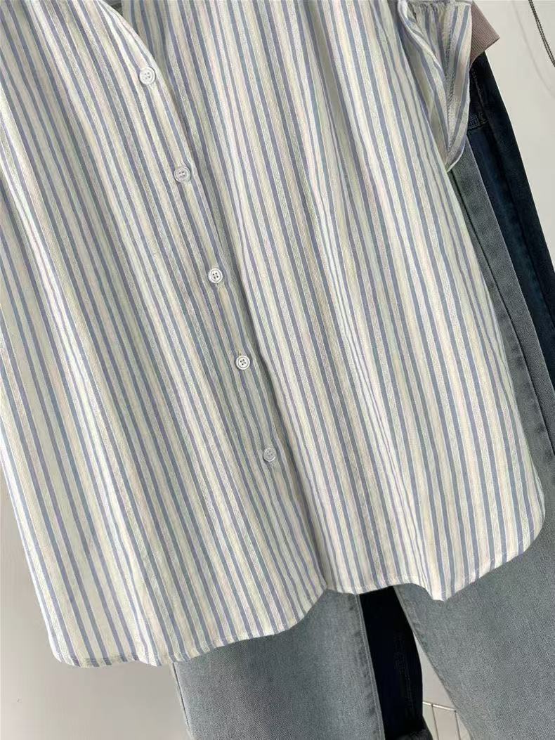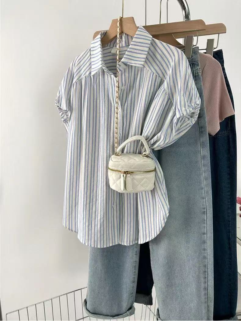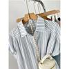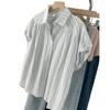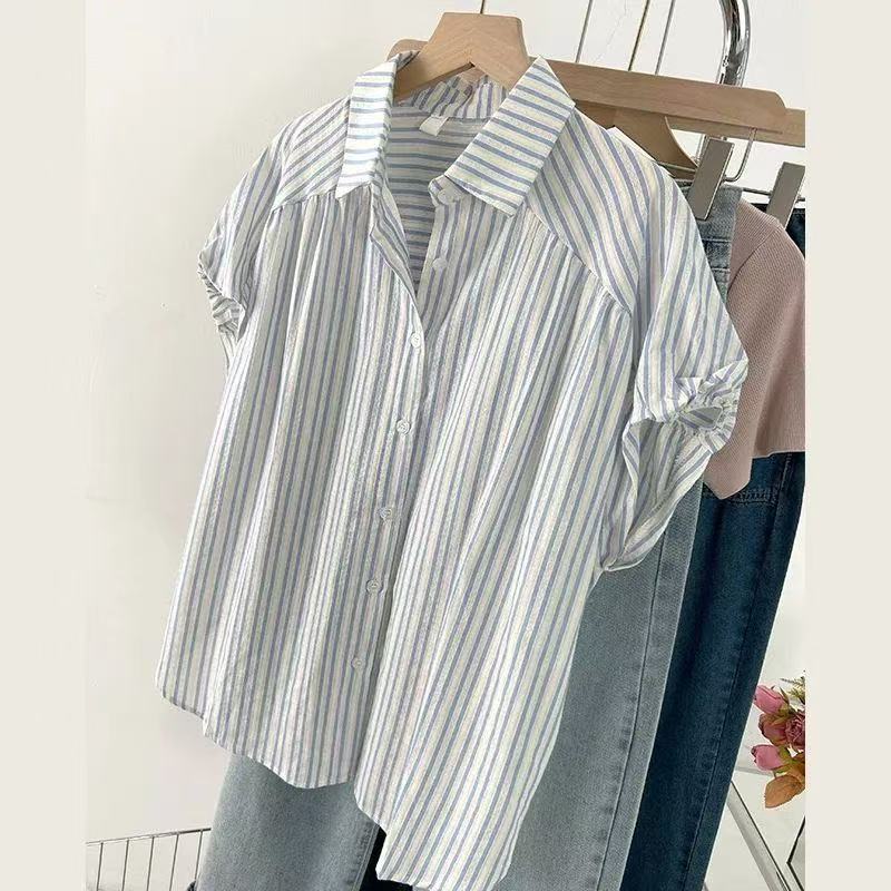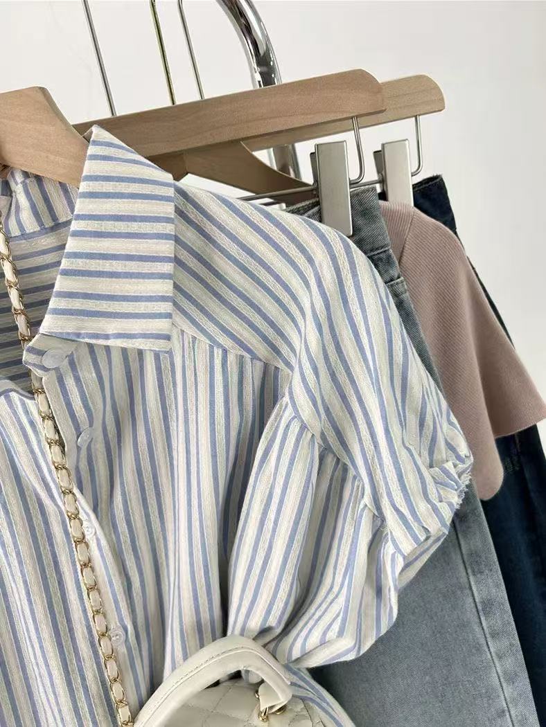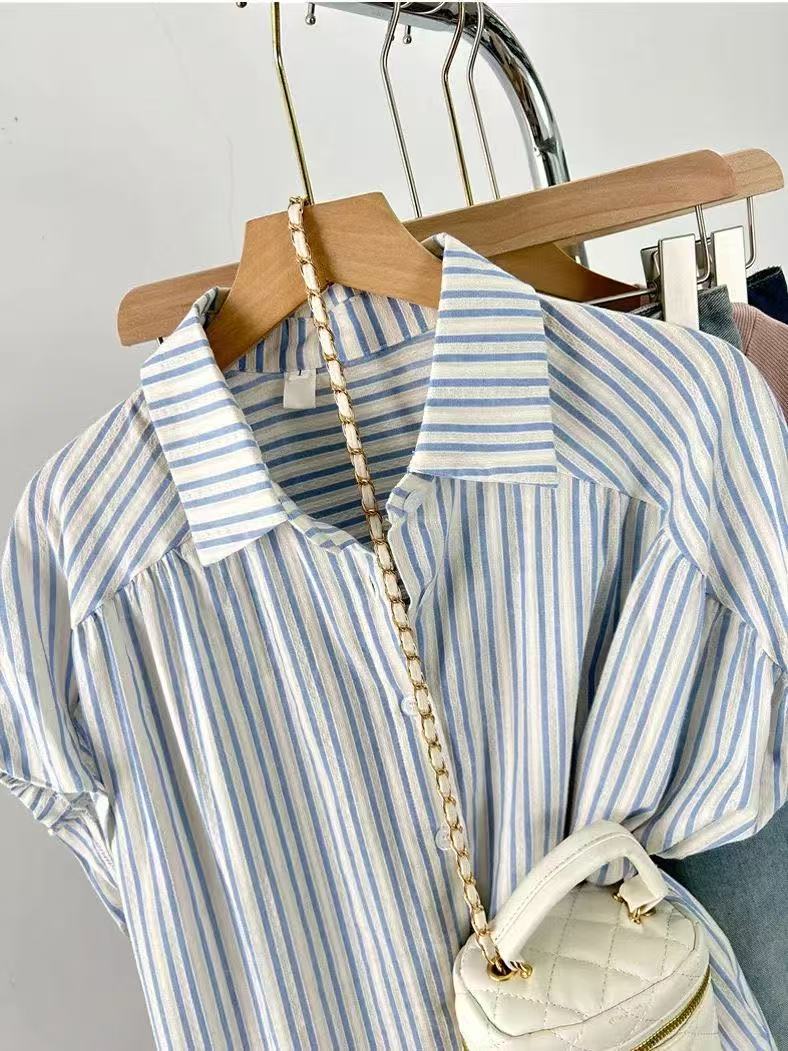 Camisa de Rayas Francesa de Manga Corta para Mujer 2025 Verano Sentido del Diseño Nicho Chic Manga Pequeña de Vuelo Algodón Lino Top Dulce