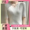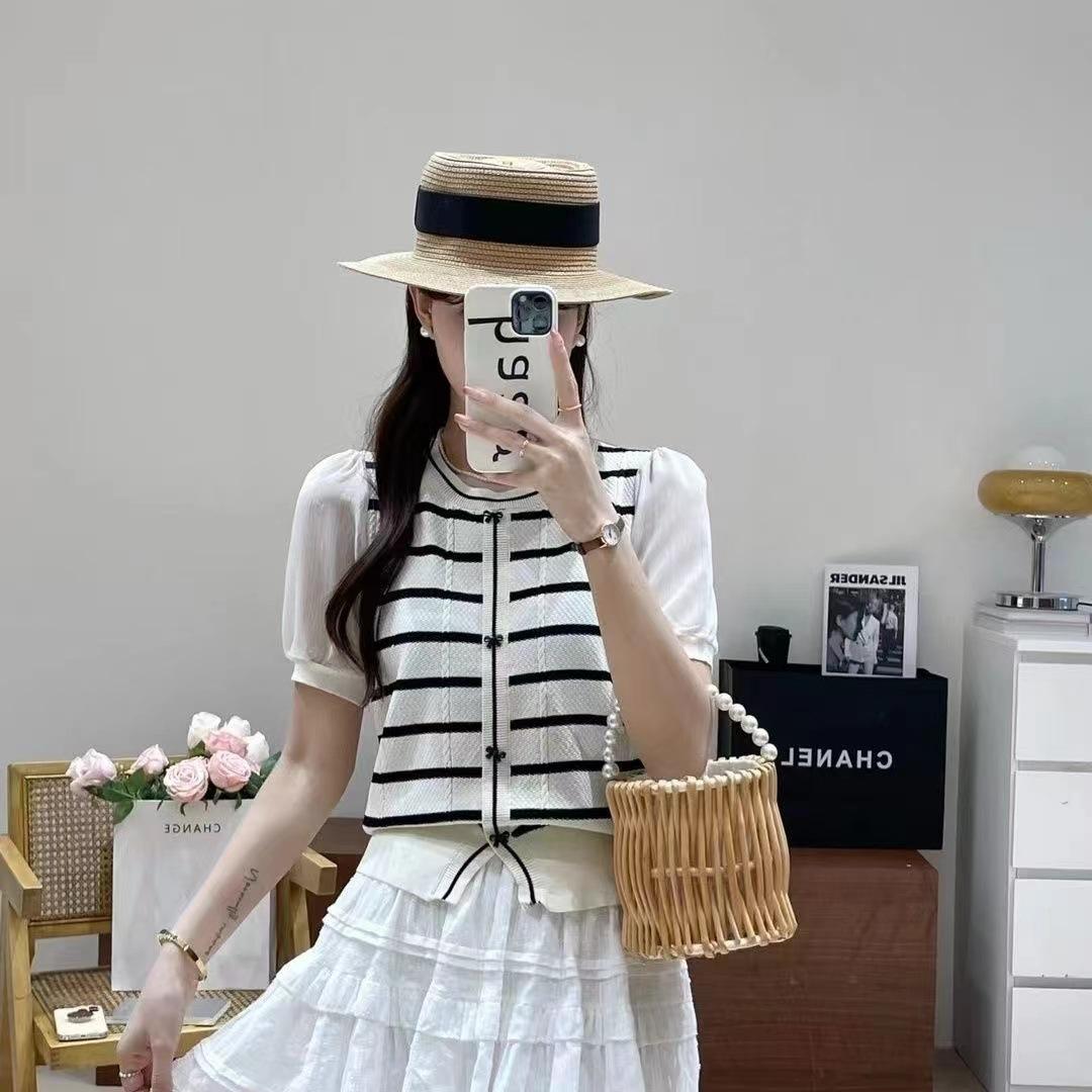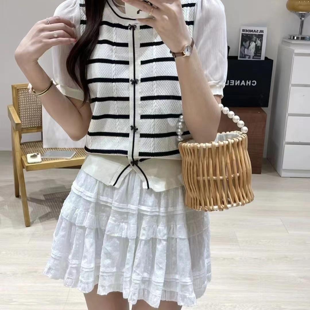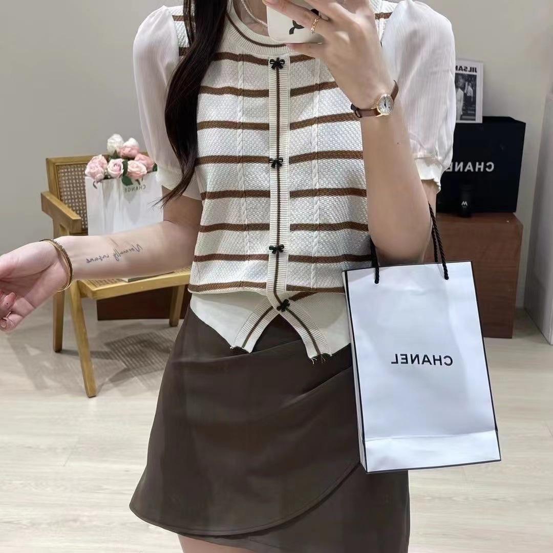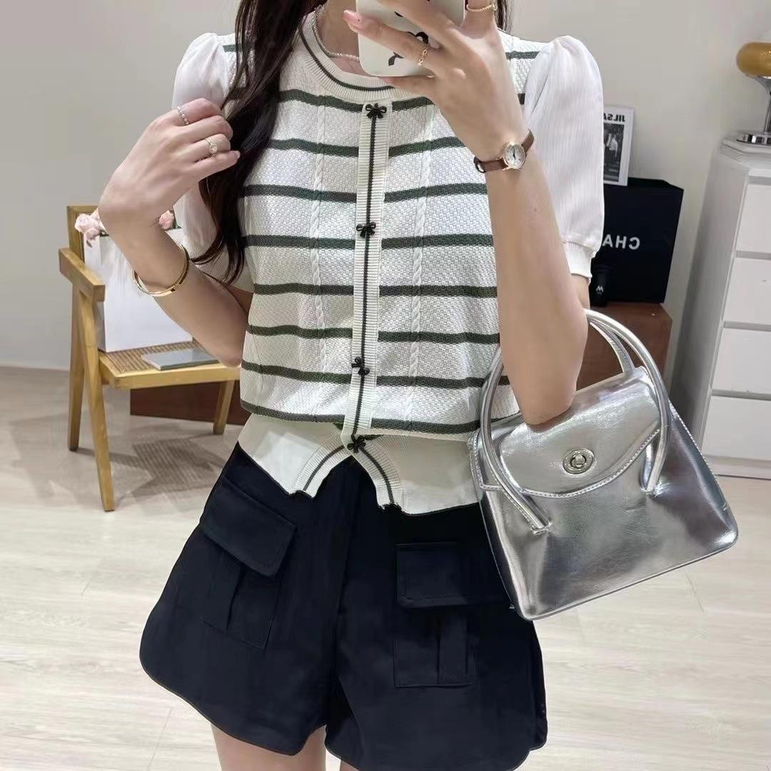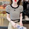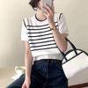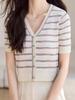 Suéter de manga corta estilo francés para mujer, de verano, de punto fino, nuevo, con costuras a juego, manga de gasa, top a rayas con cuello en V