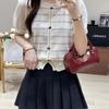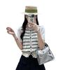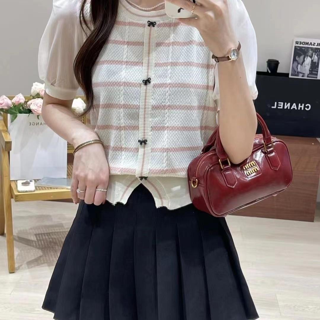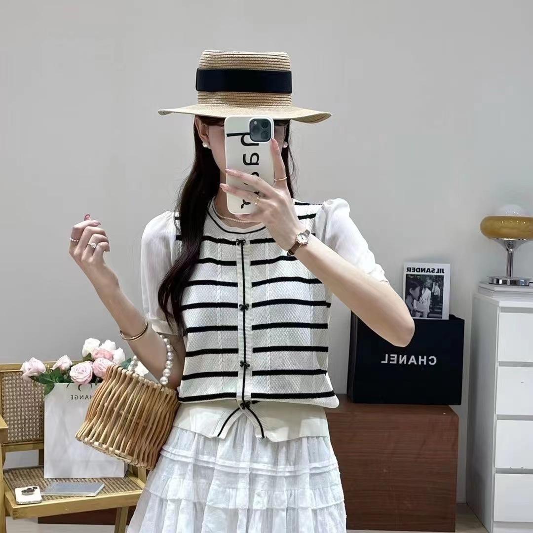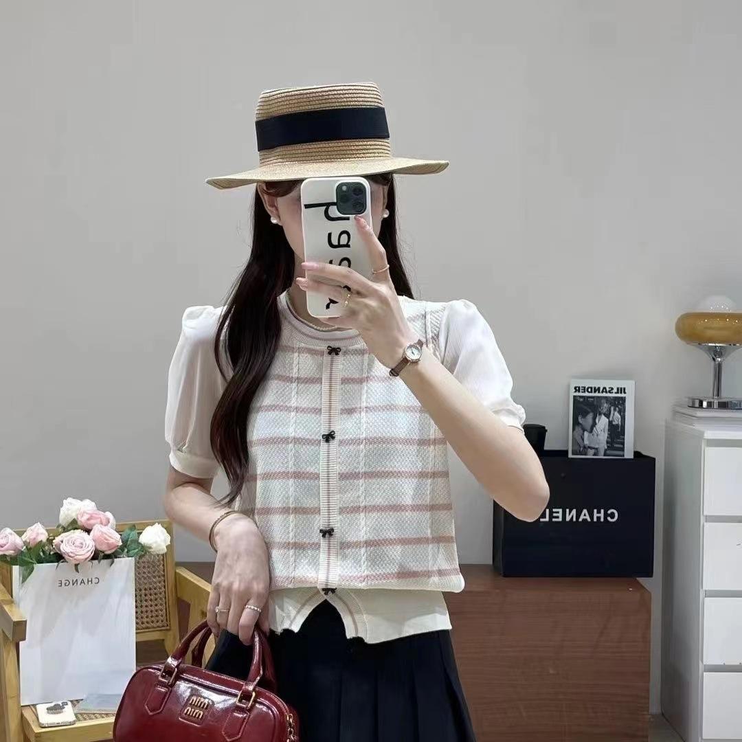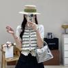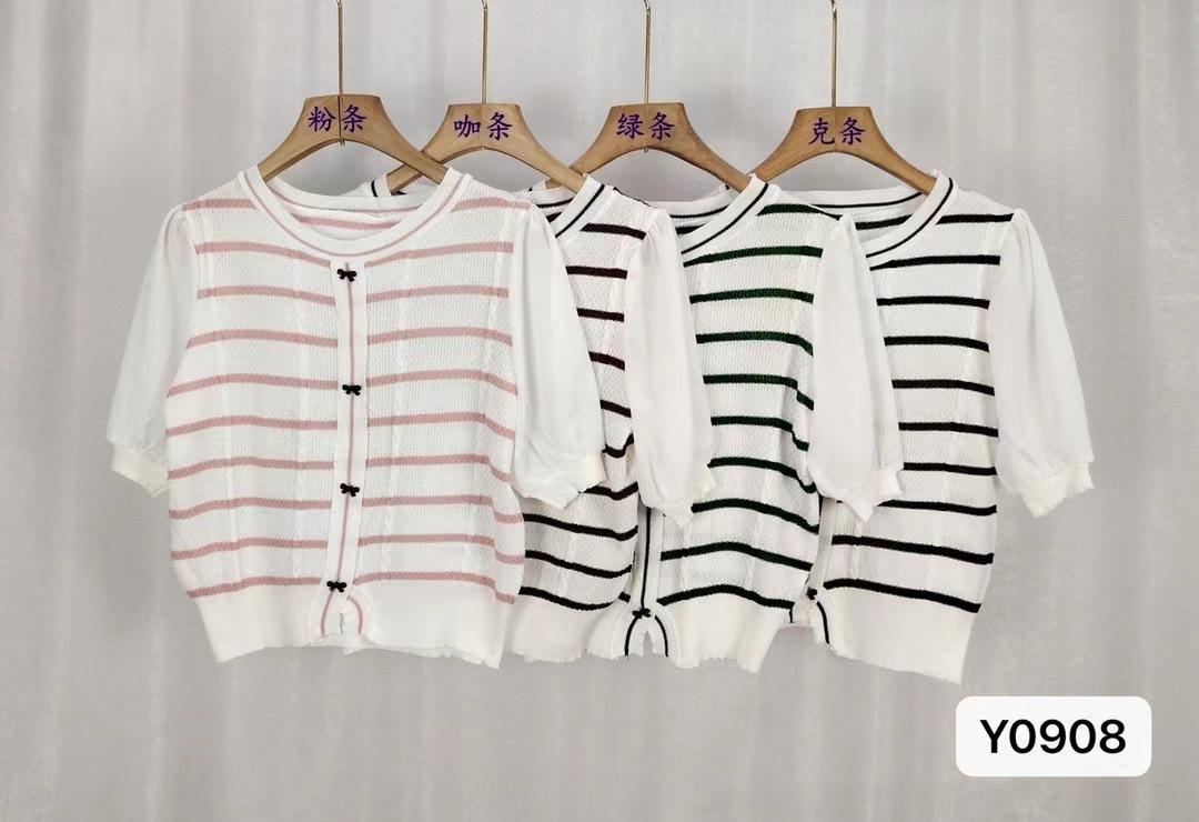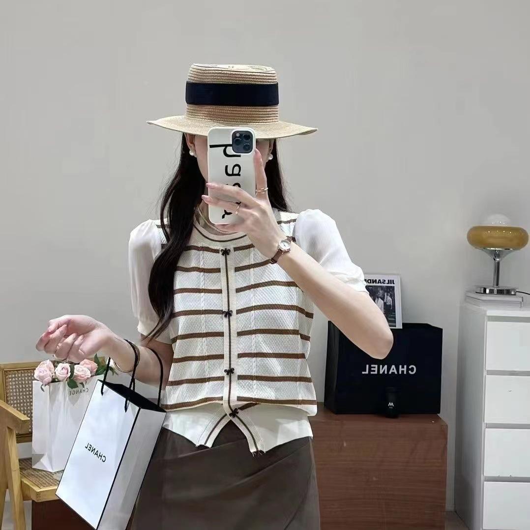 Suéter de manga corta estilo francés para mujer, de verano, de punto fino, nuevo, con costuras a juego, manga de gasa, top a rayas con cuello en V