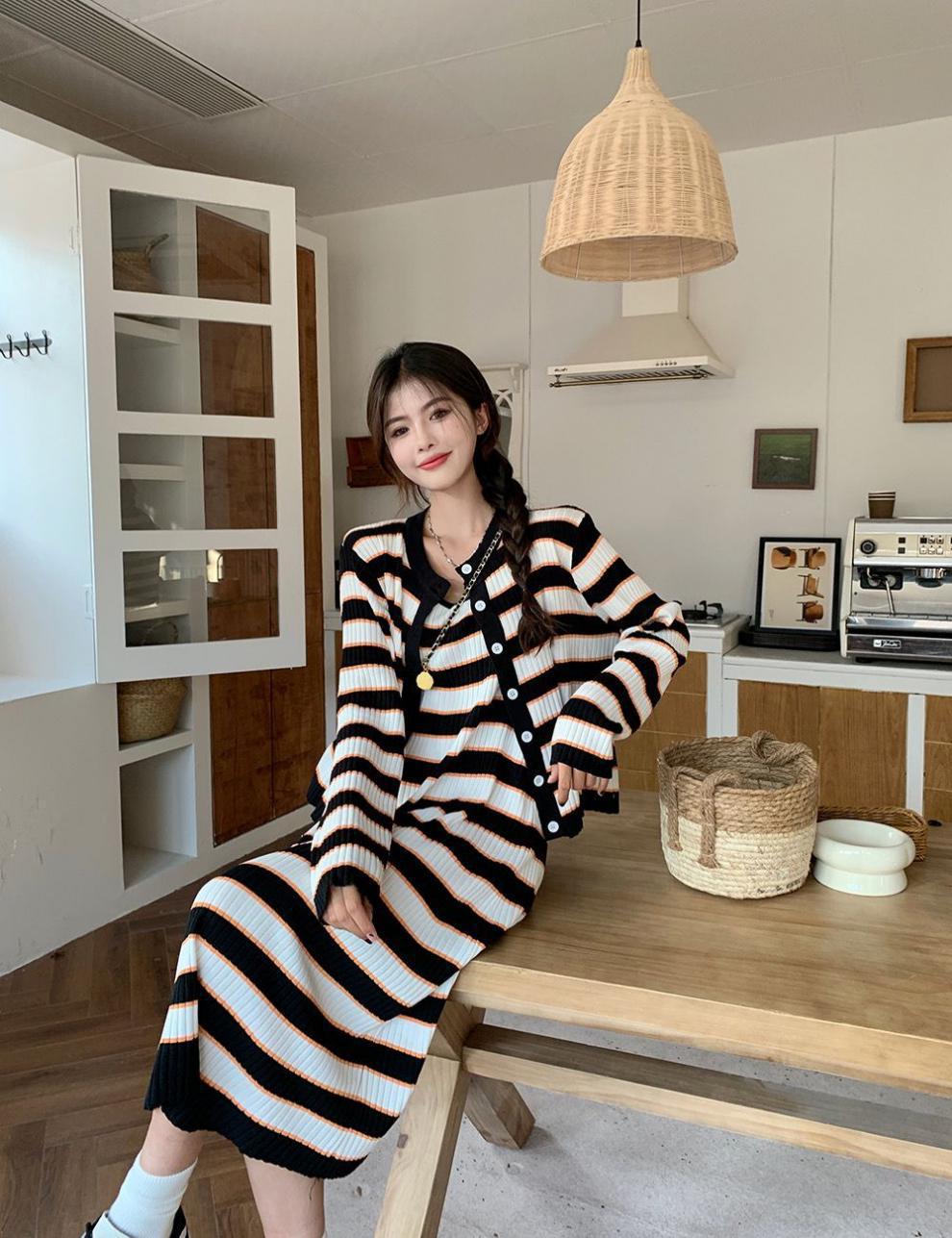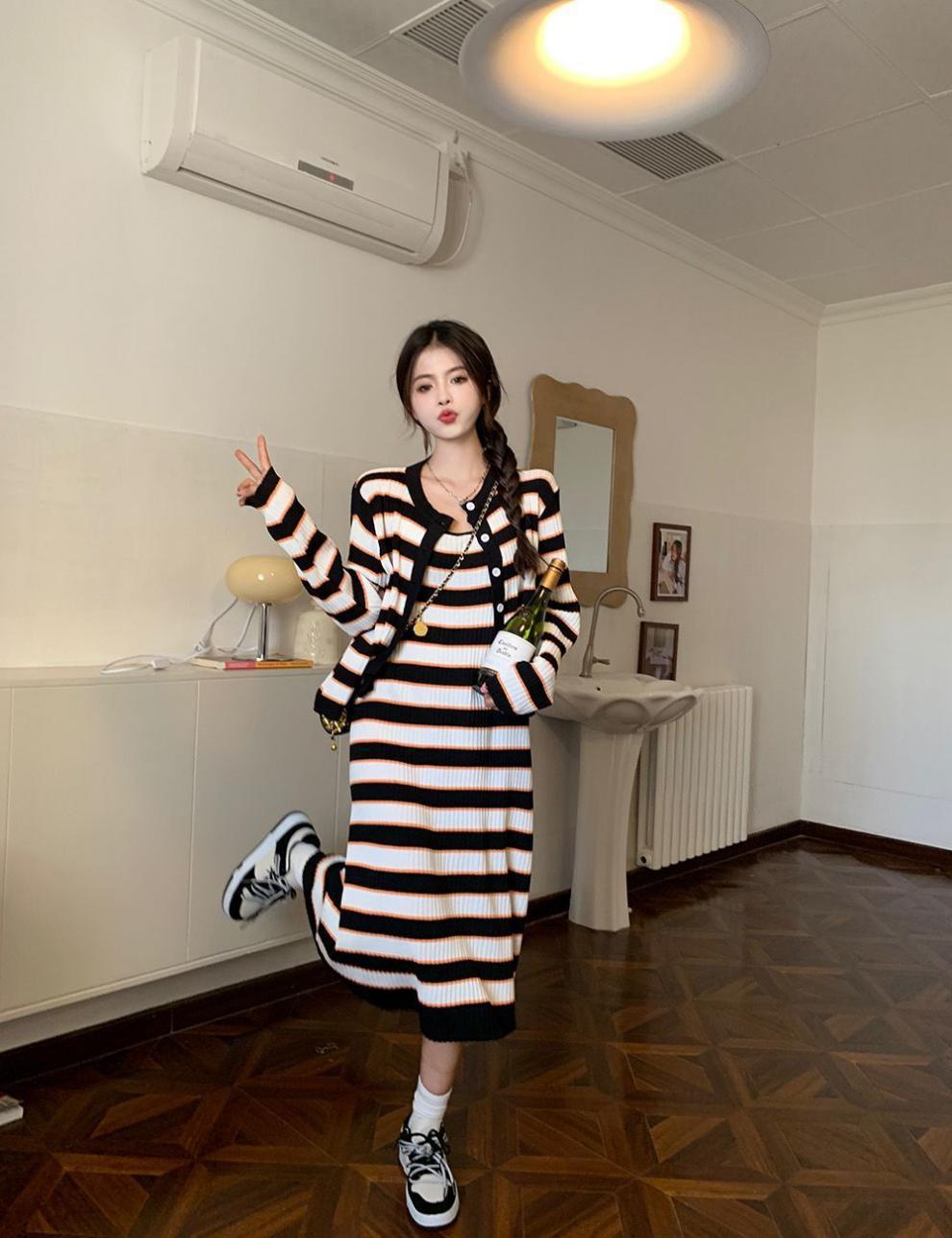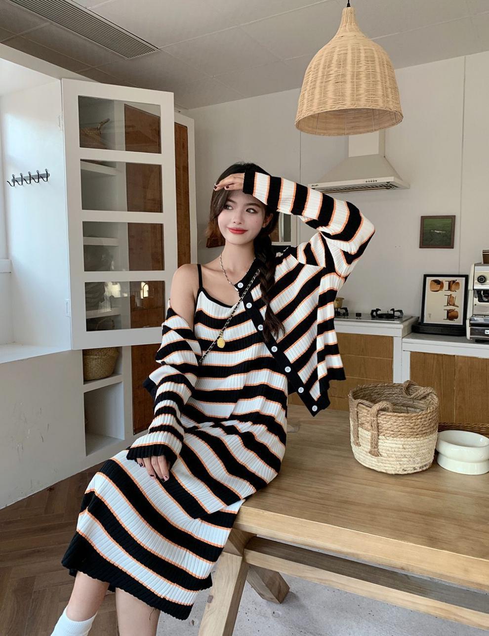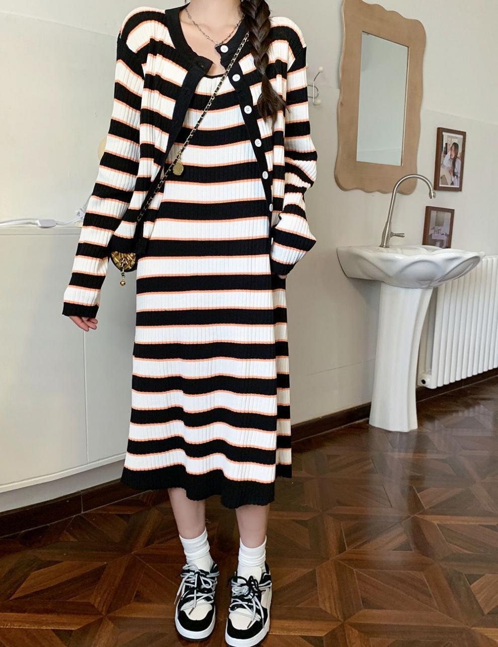 Popular transfronterizo traje a rayas vestido con tirantes cárdigan de punto conjunto de dos piezas 2023 nuevo adelgazante versátil