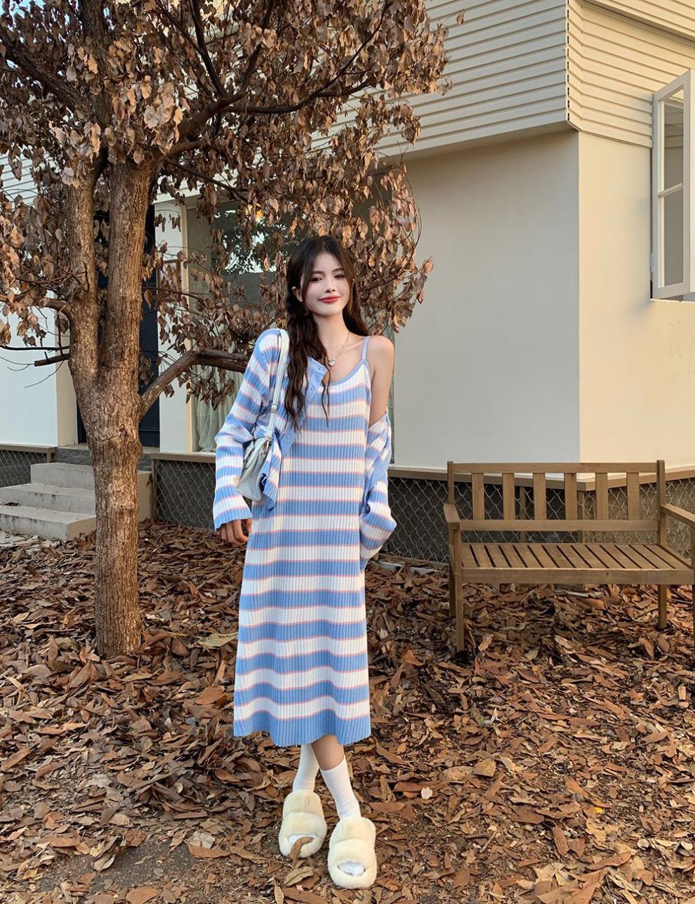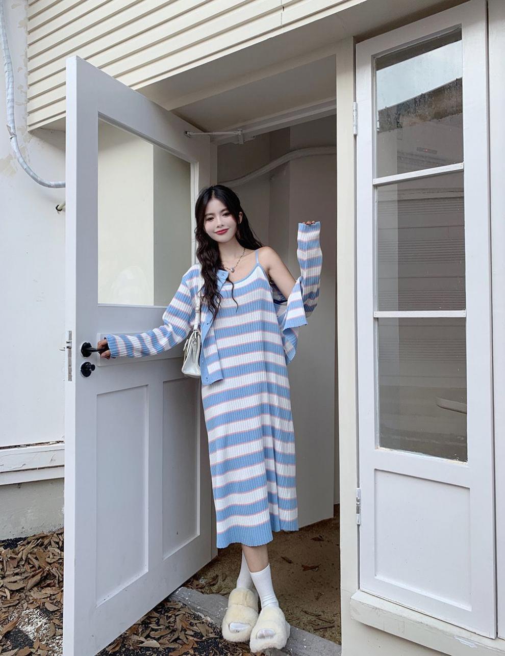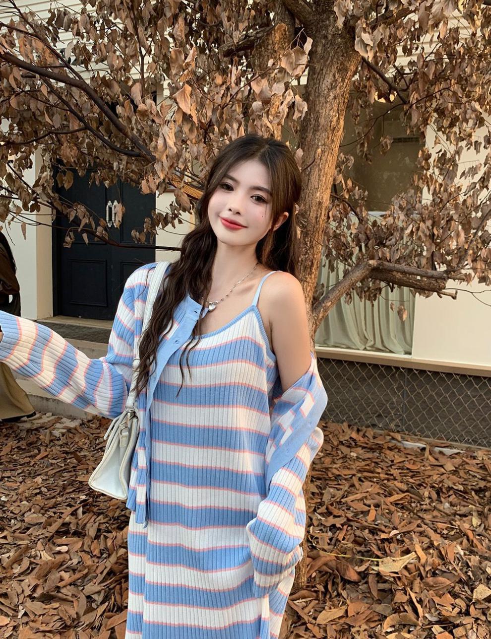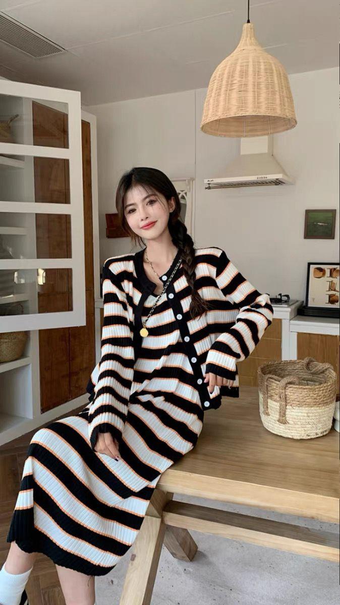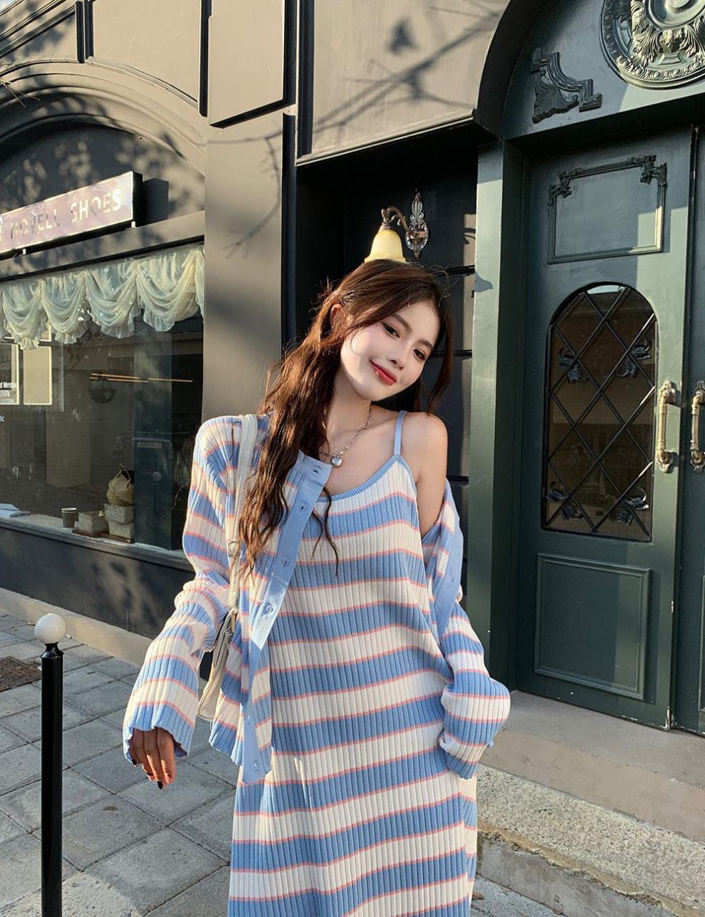 Popular transfronterizo traje a rayas vestido con tirantes cárdigan de punto conjunto de dos piezas 2023 nuevo adelgazante versátil