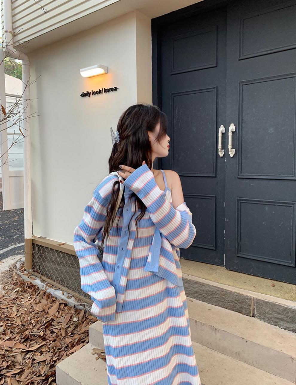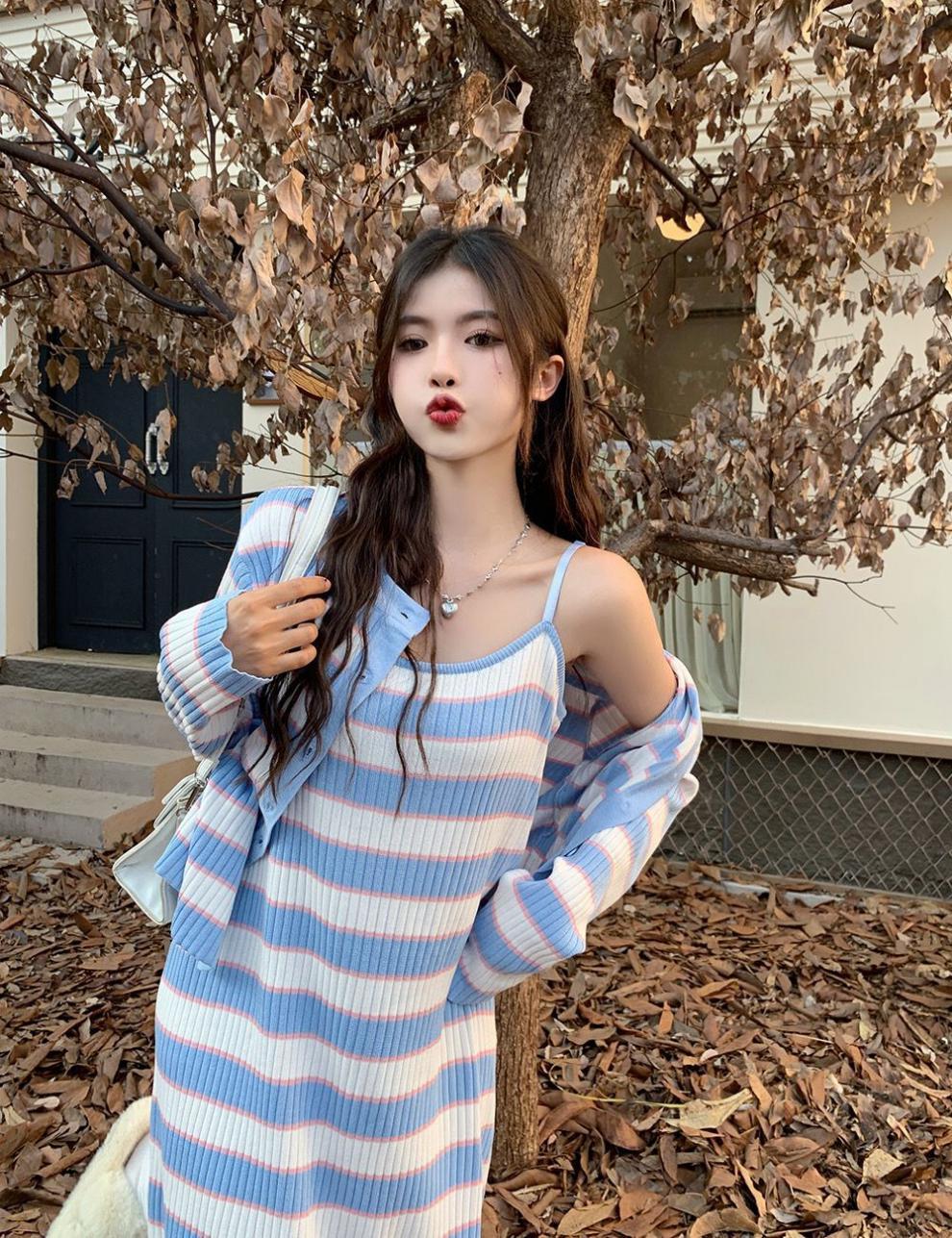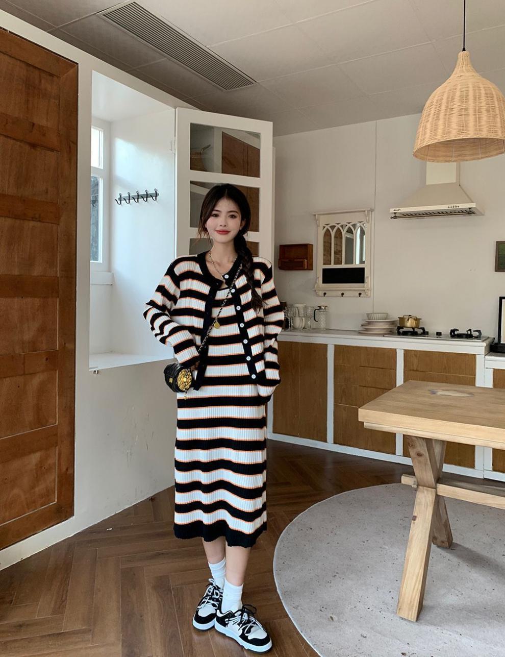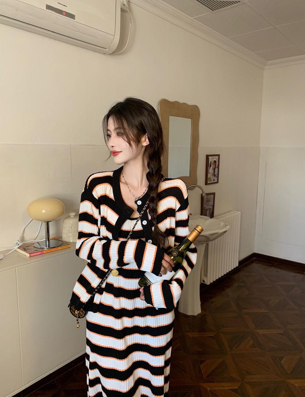 Popular transfronterizo traje a rayas vestido con tirantes cárdigan de punto conjunto de dos piezas 2023 nuevo adelgazante versátil