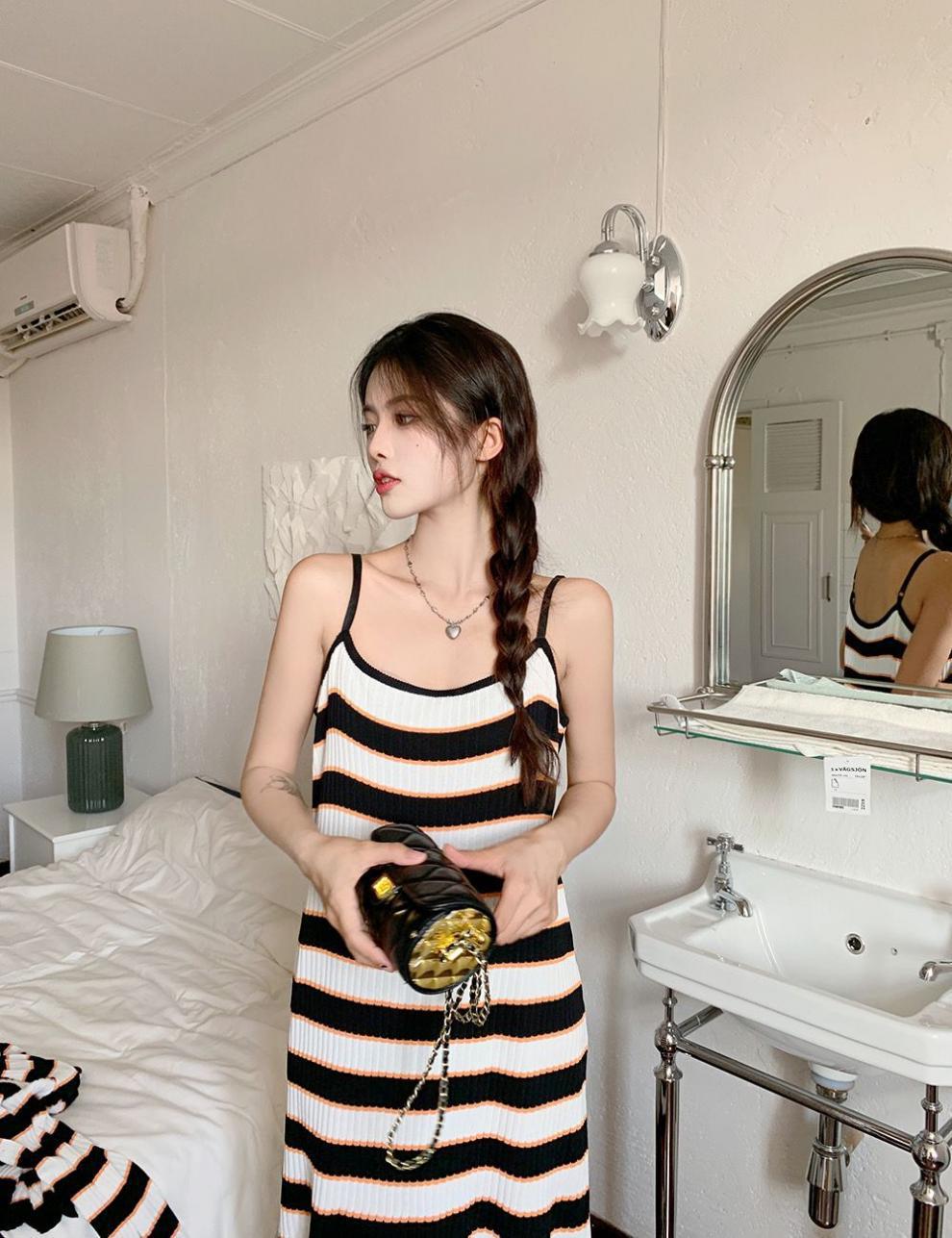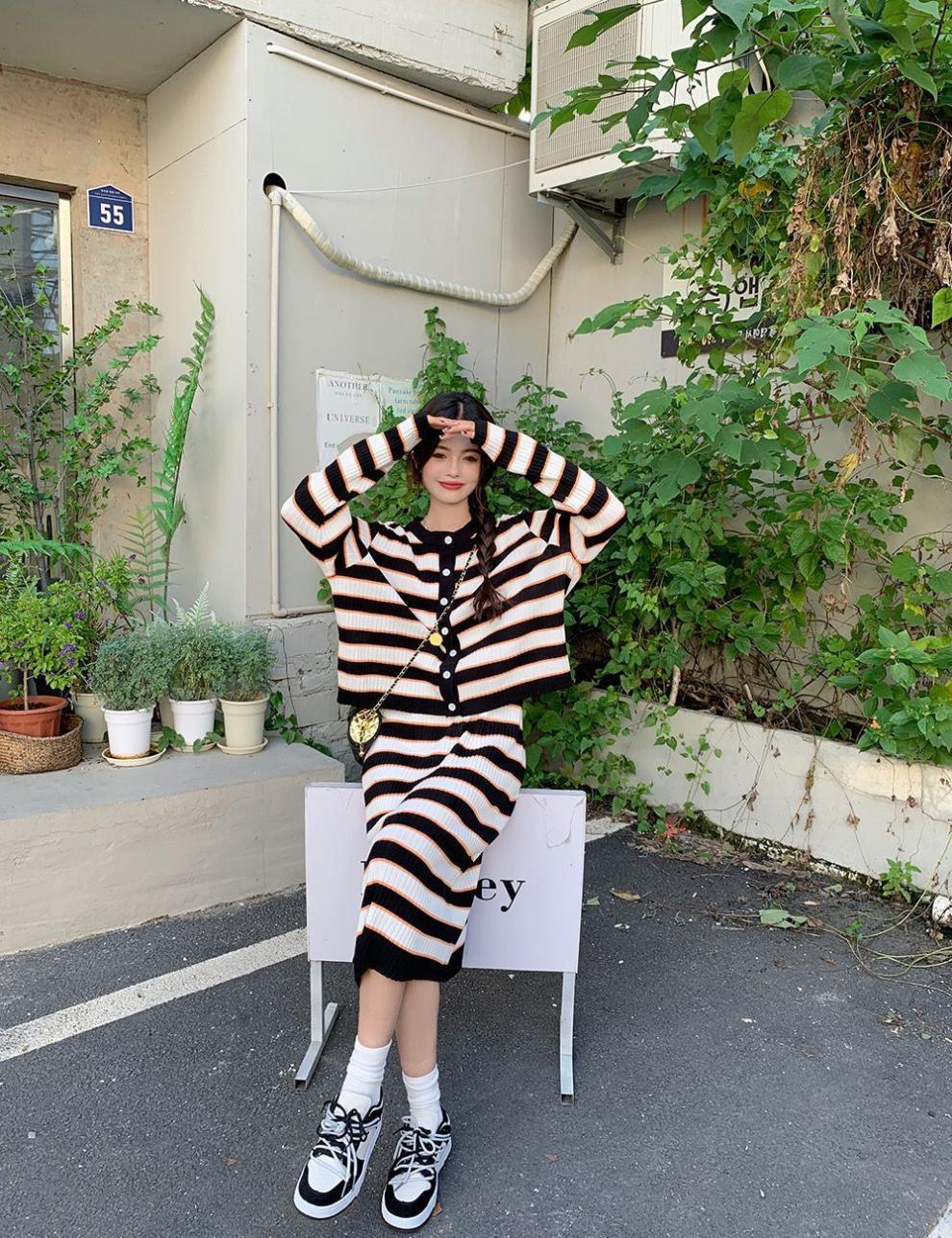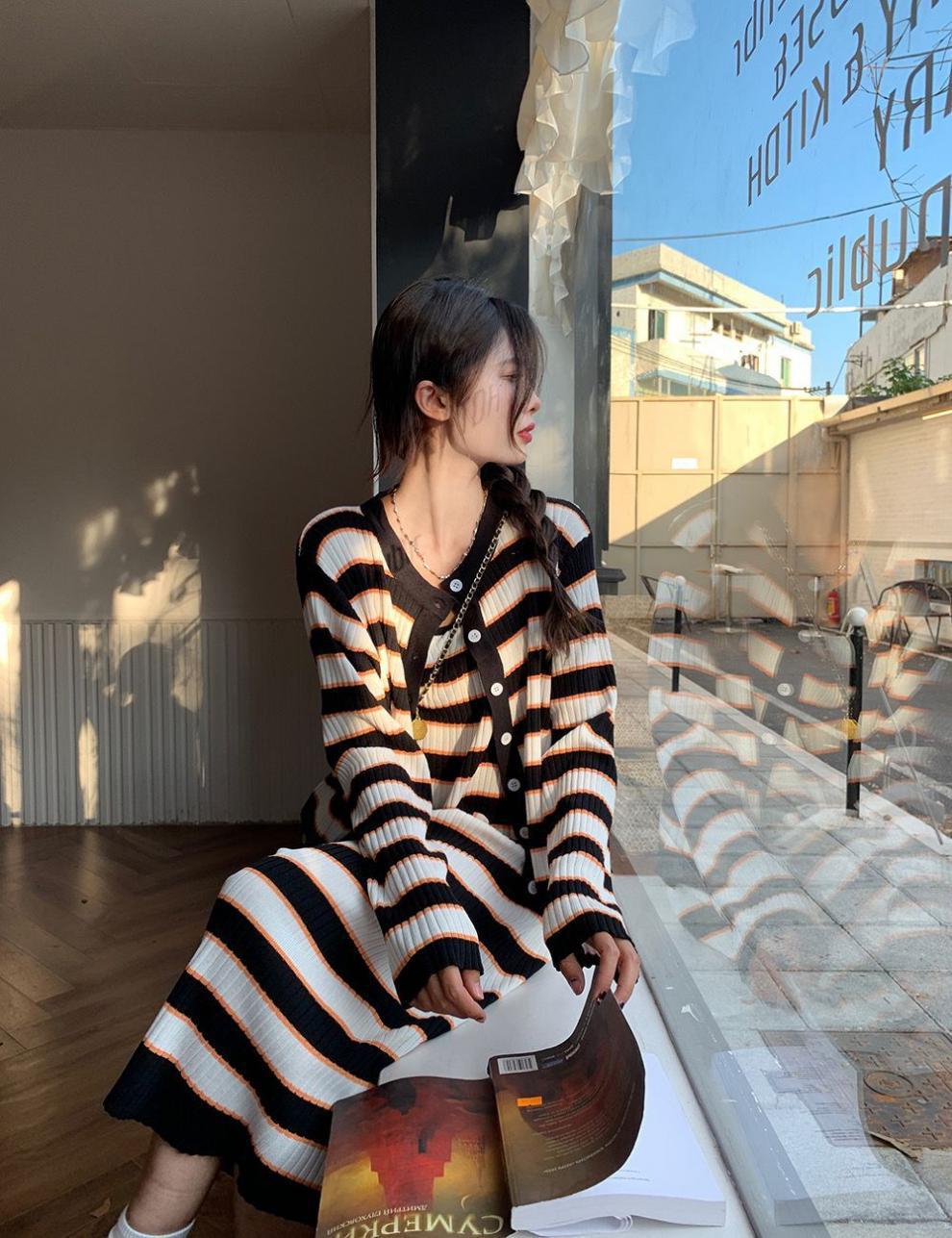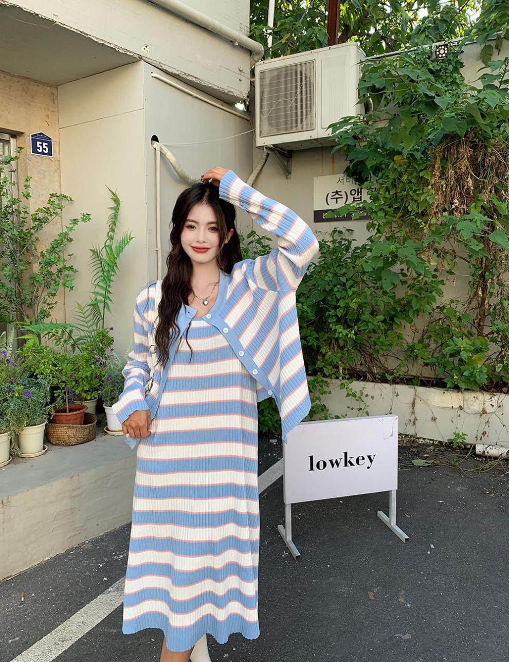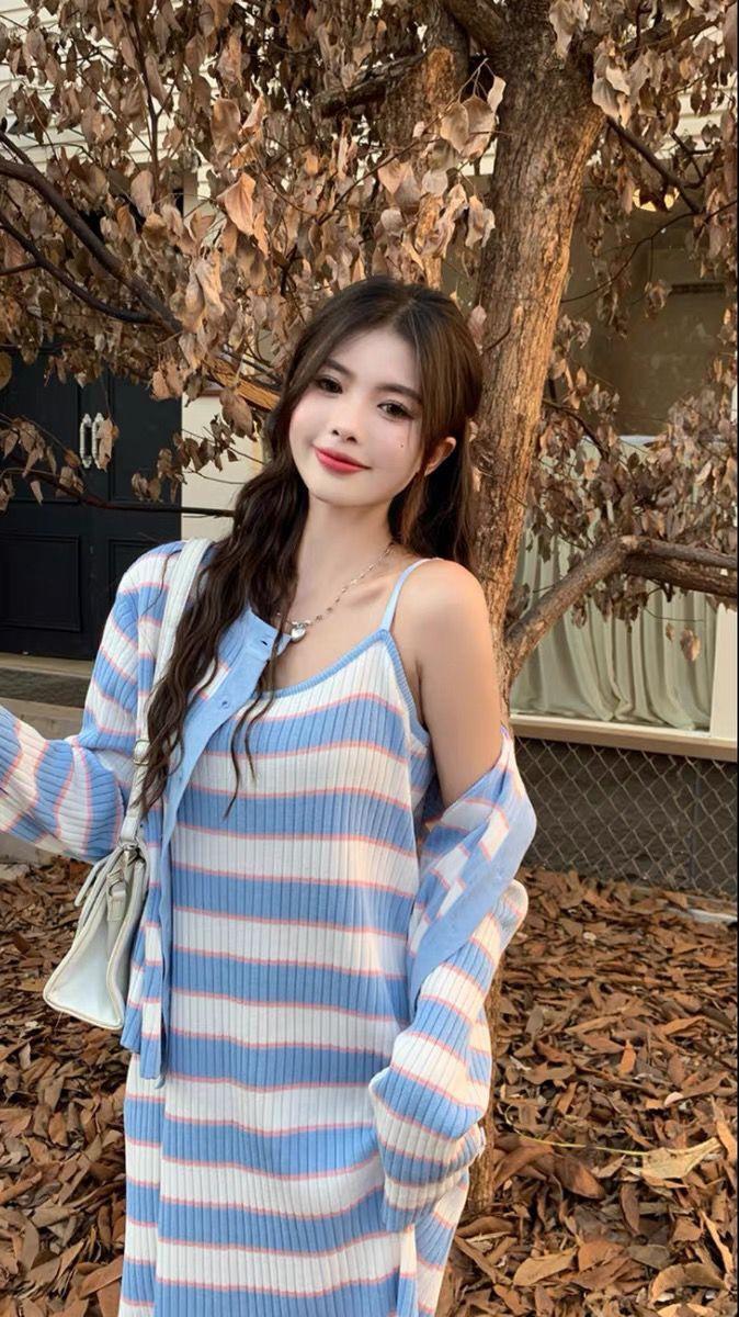 Popular transfronterizo traje a rayas vestido con tirantes cárdigan de punto conjunto de dos piezas 2023 nuevo adelgazante versátil