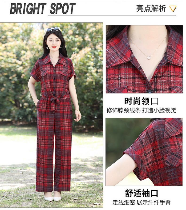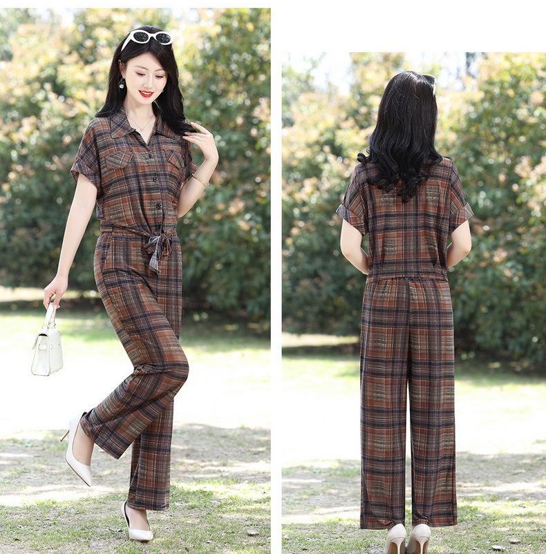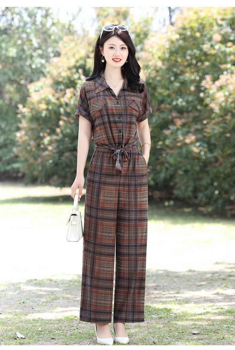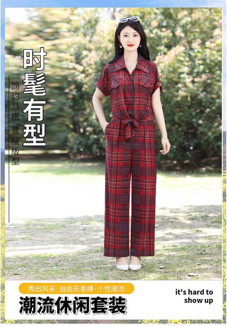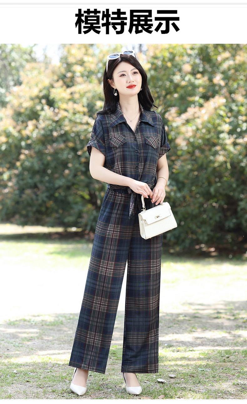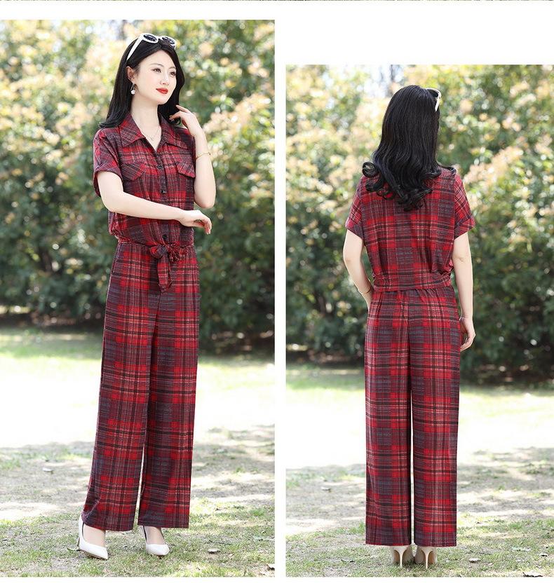 Traje de Moda de Verano para Madre Conjunto de Dos Piezas para Mujer 2025 Nuevo Elegante Camisa de Cuadros de Manga Corta Top Pantalones de Pierna Ancha