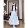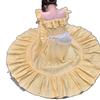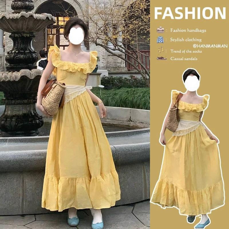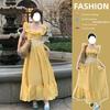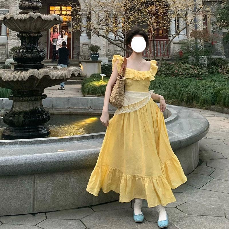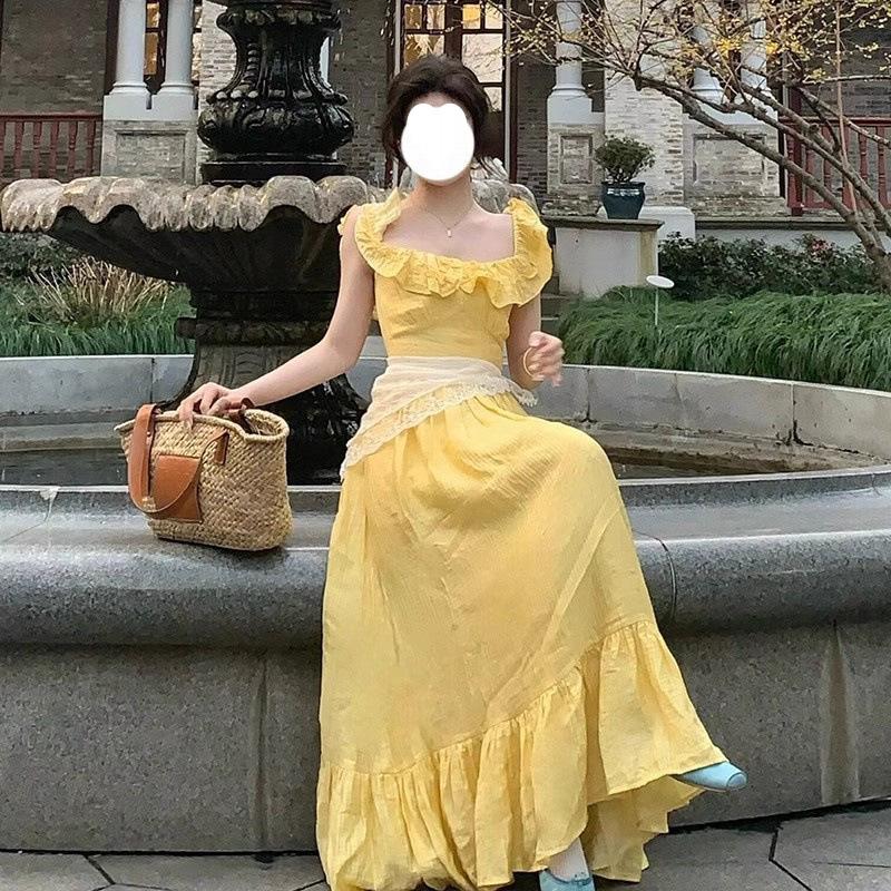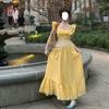 Vestido Amarillo Pequeño de Manga Corta con Volantes para Descanso del Té Francés para Mujer Verano Falda Larga hasta la Rodilla