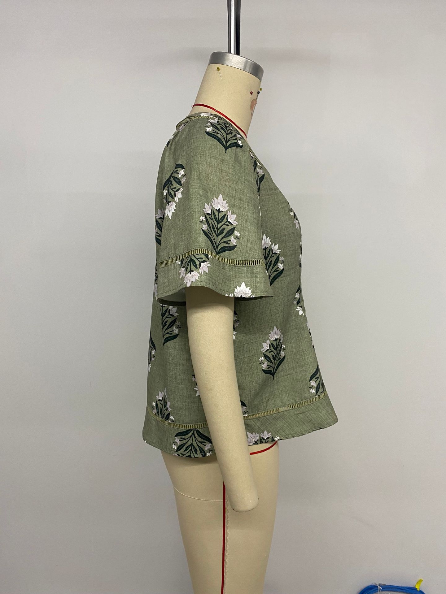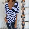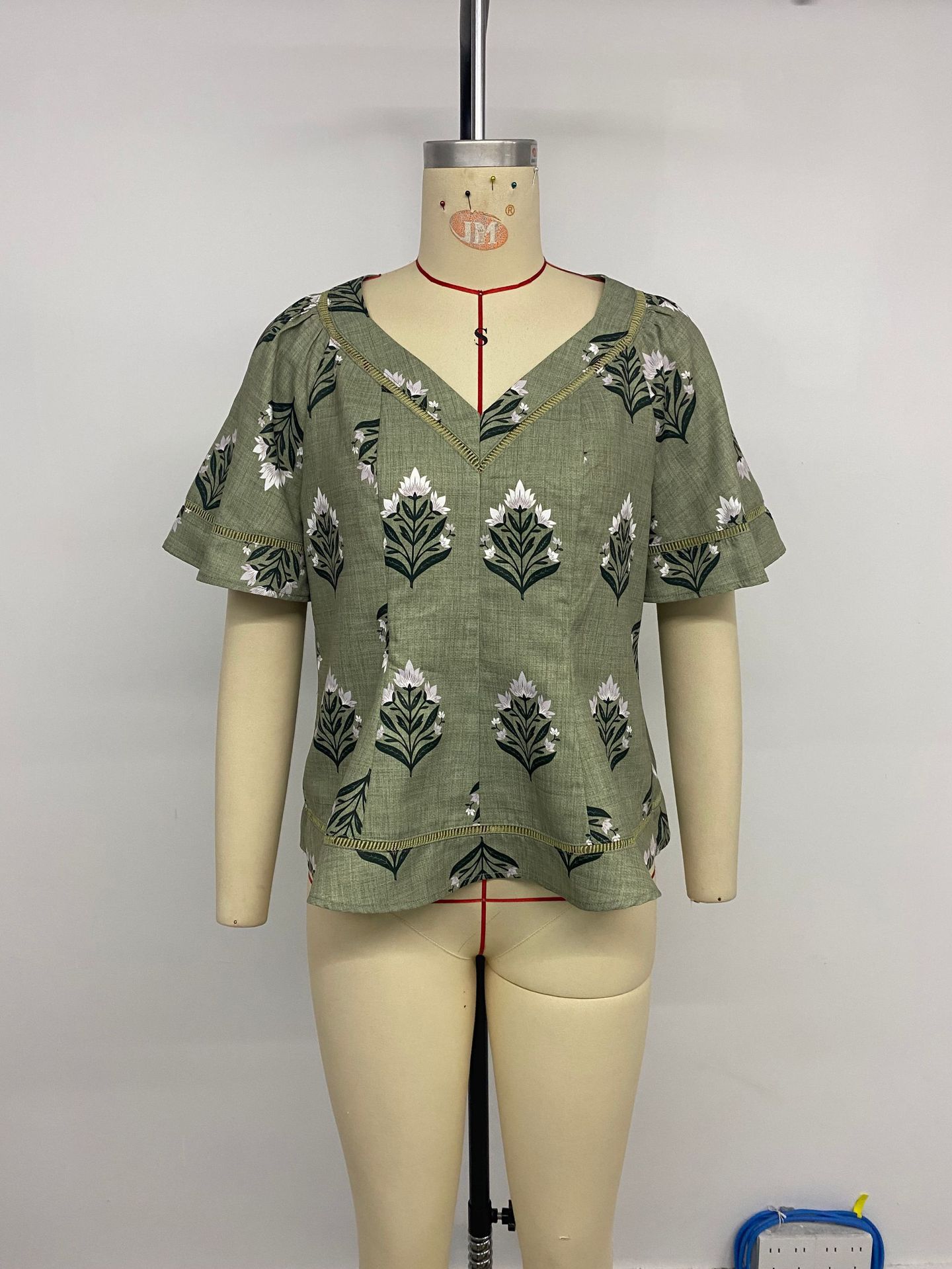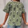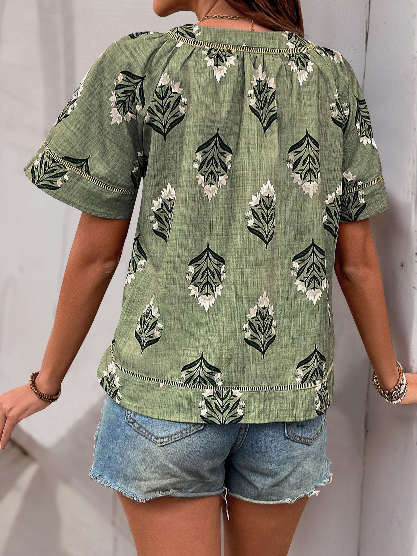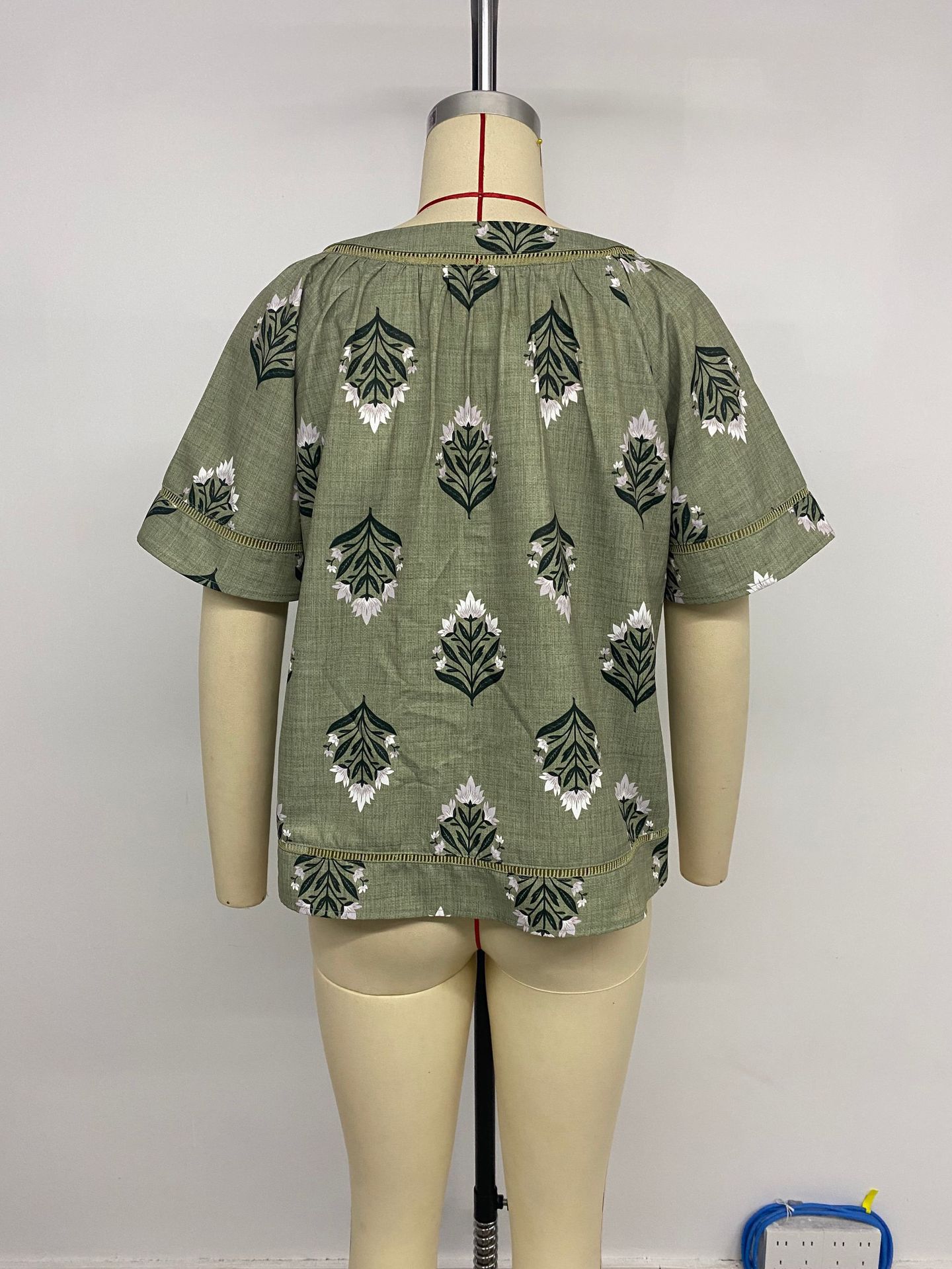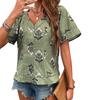 Amazon 2025 Nuevo Top Casual Europeo y Americano Transfronterizo Cuello en V Estilo Fresco Camiseta de Manga Corta con Estampado de Plantas para Mujer