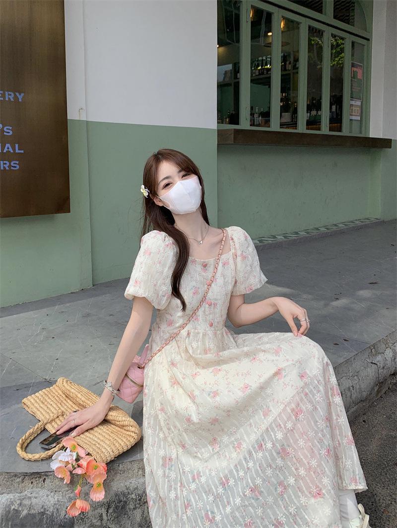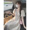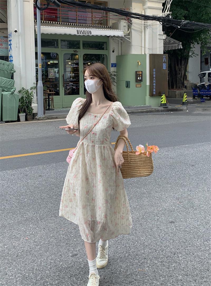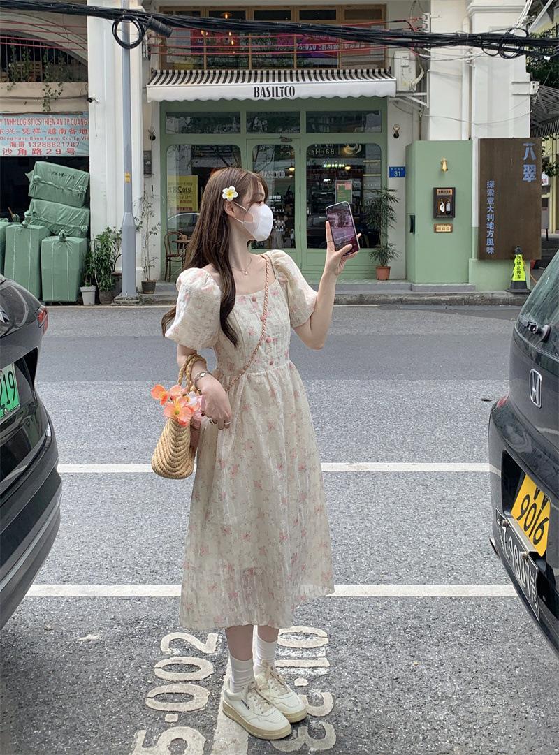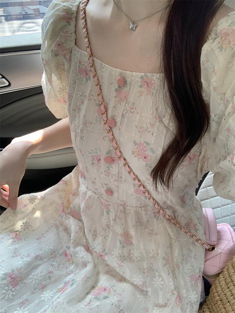 Vestido de Estilo Francés con Cuello Cuadrado Suave, Manga Abullonada, para Mujer, Primavera y Otoño, Nuevo, Cintura Ajustada, Adelgazante, Dulce, Floral, Vestido Largo