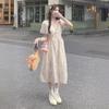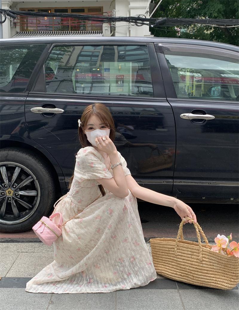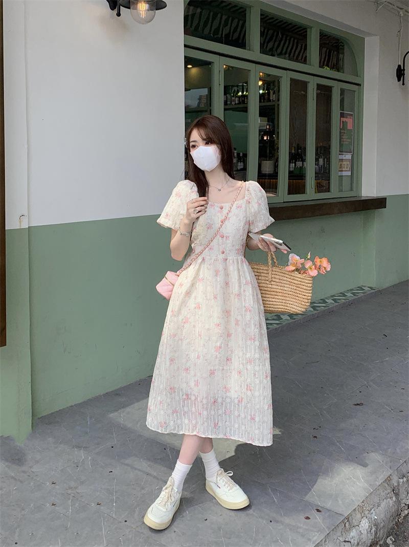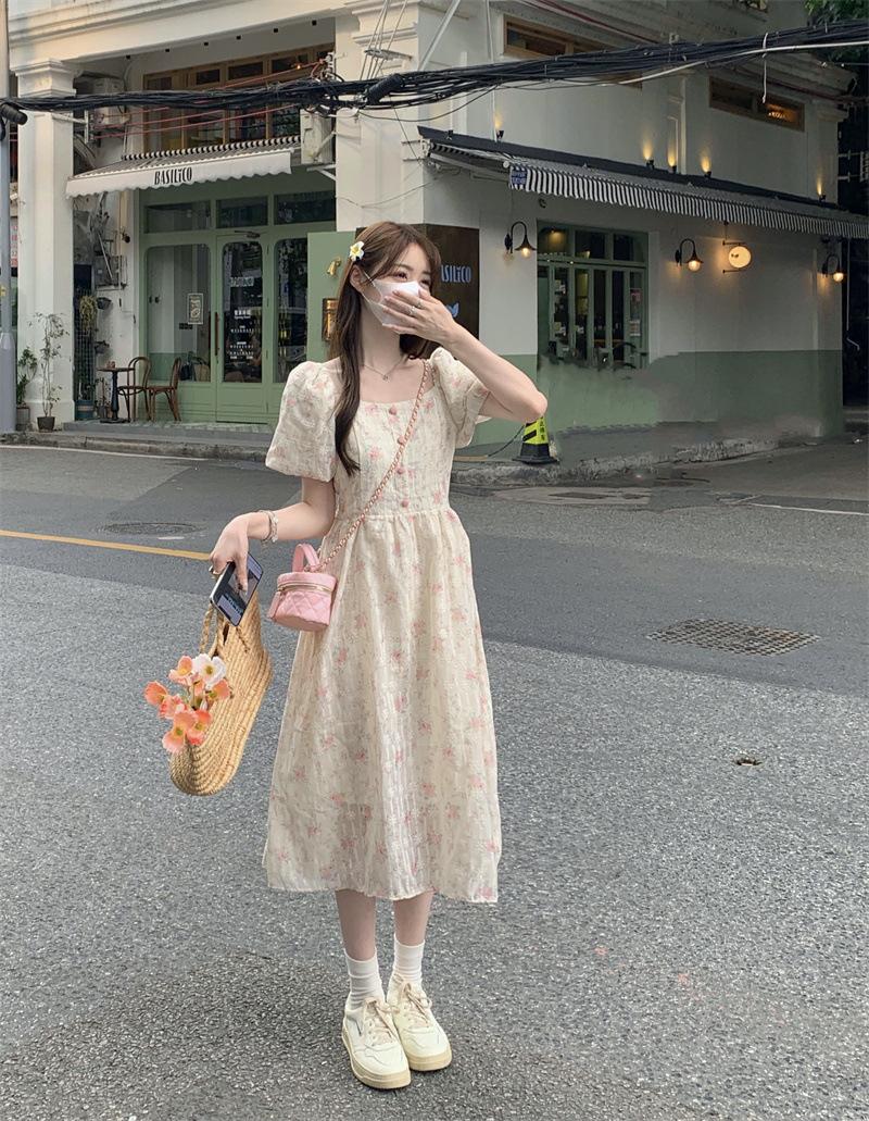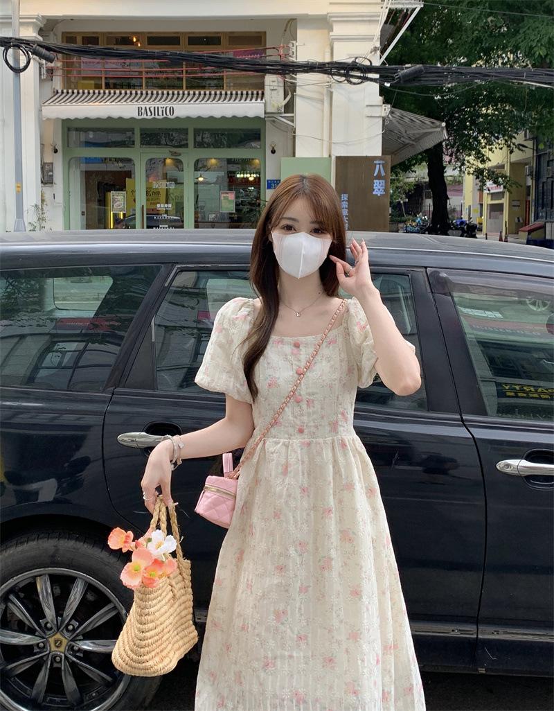 Vestido de Estilo Francés con Cuello Cuadrado Suave, Manga Abullonada, para Mujer, Primavera y Otoño, Nuevo, Cintura Ajustada, Adelgazante, Dulce, Floral, Vestido Largo