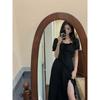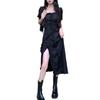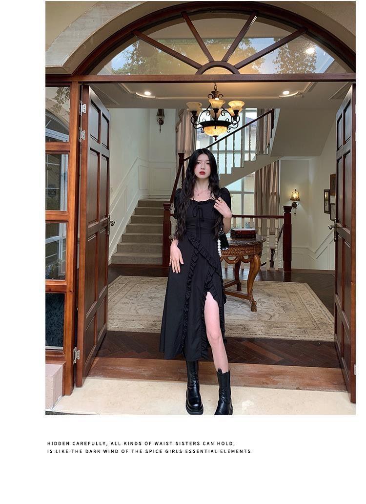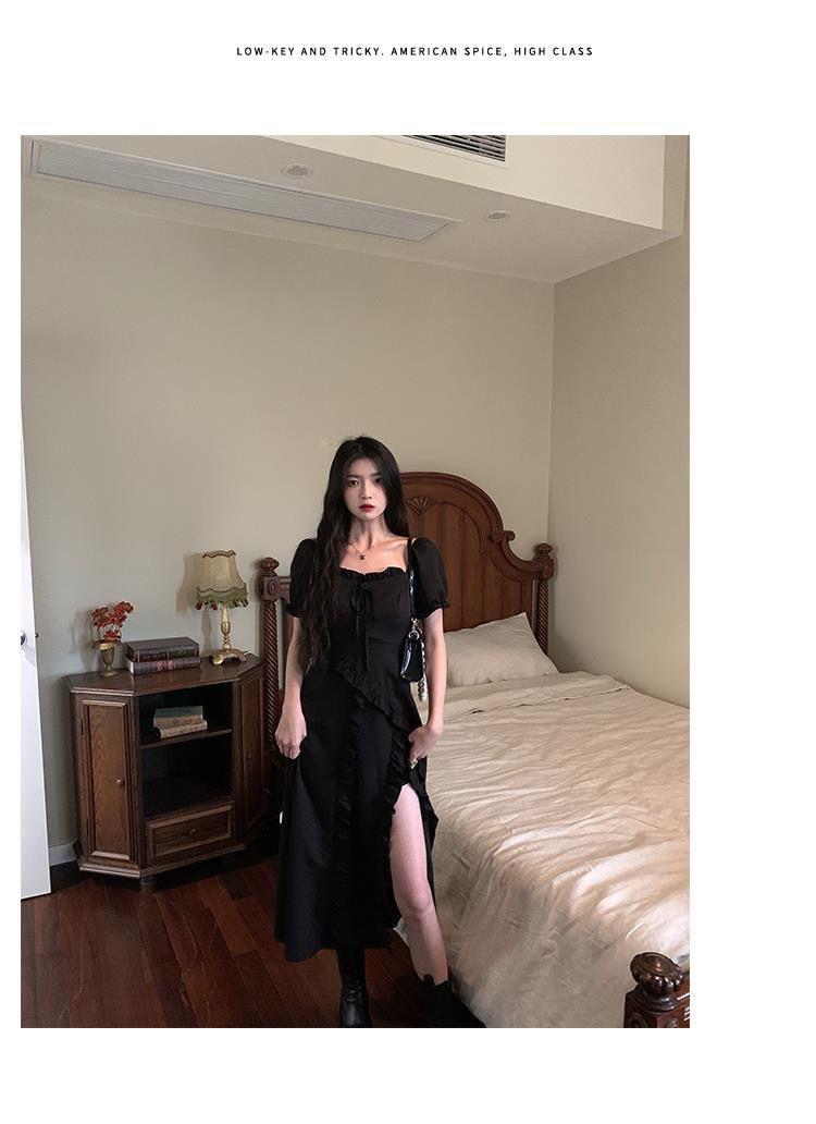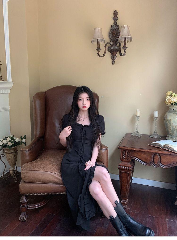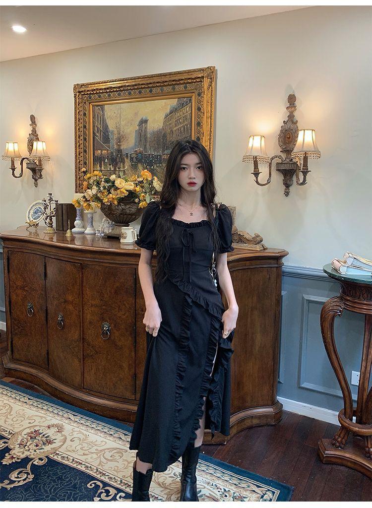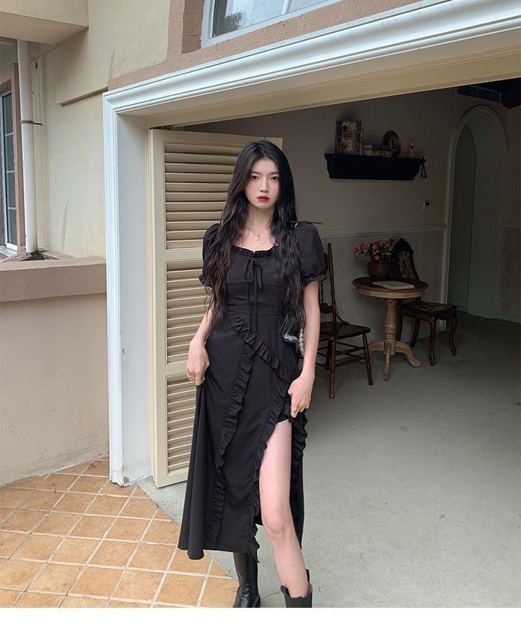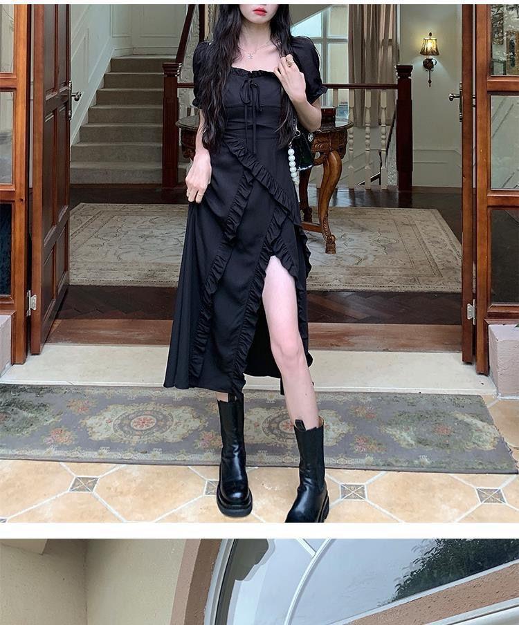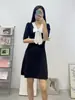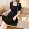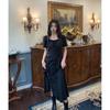 Vestido de mujer con cuello cuadrado irregular y cordones franceses, primavera 2024, nuevo vestido de corte A entallado con abertura y talle alto.