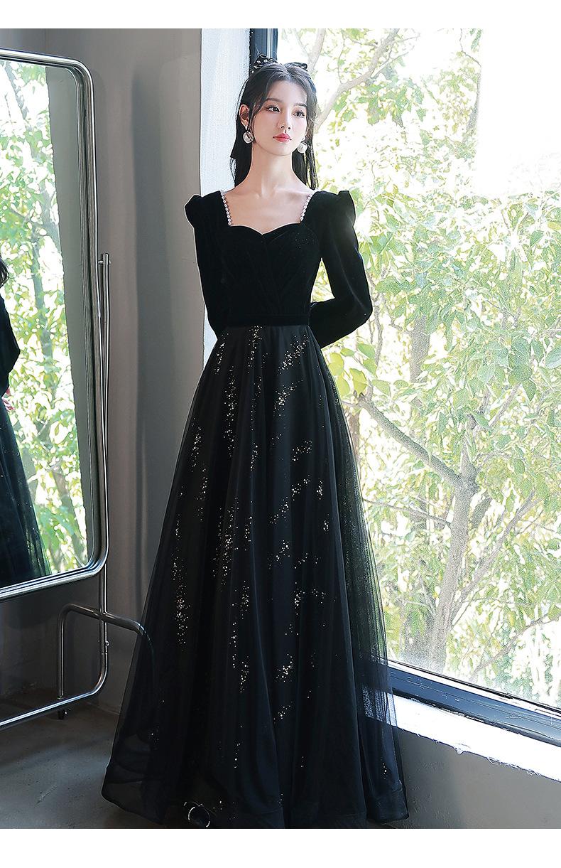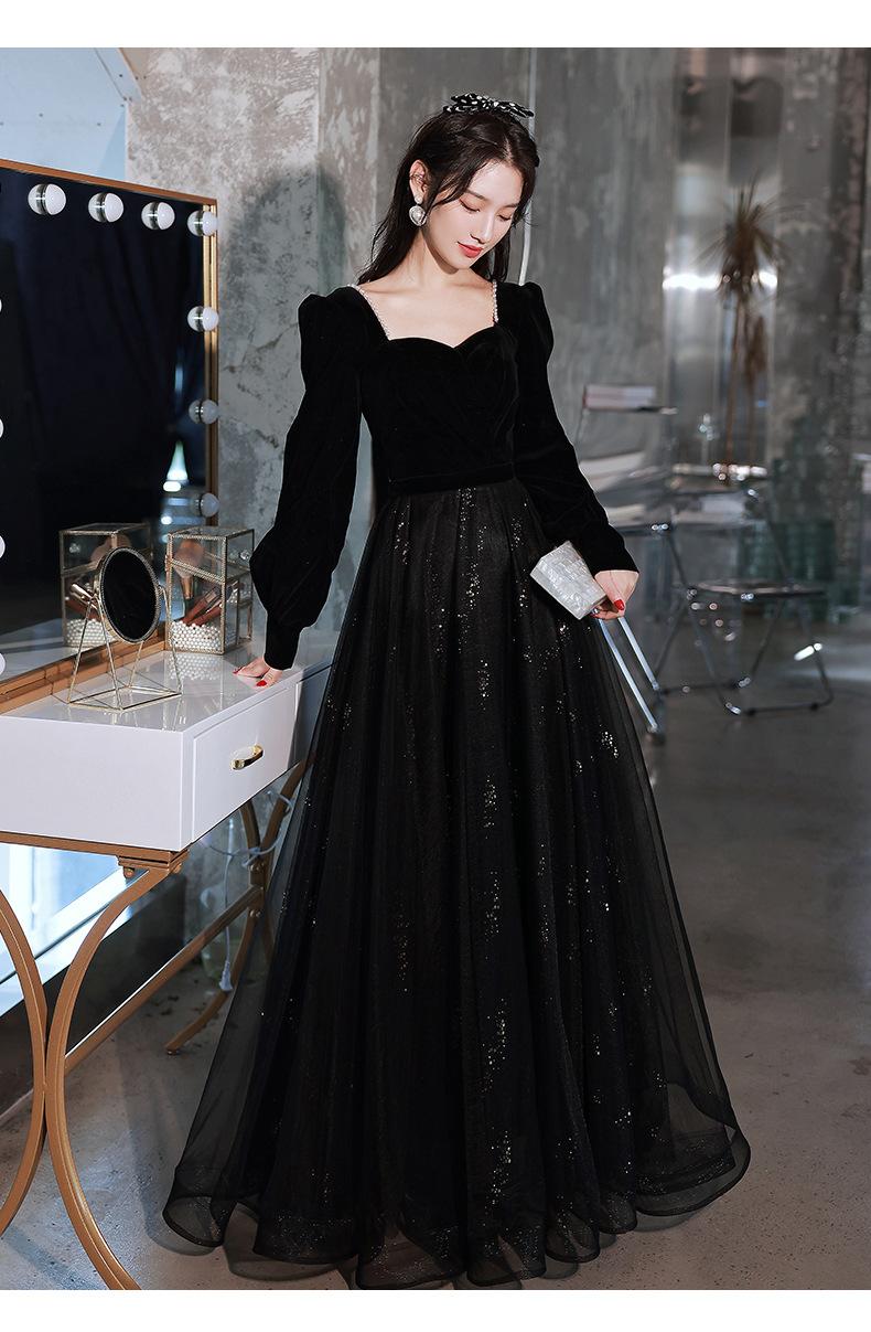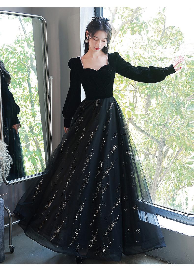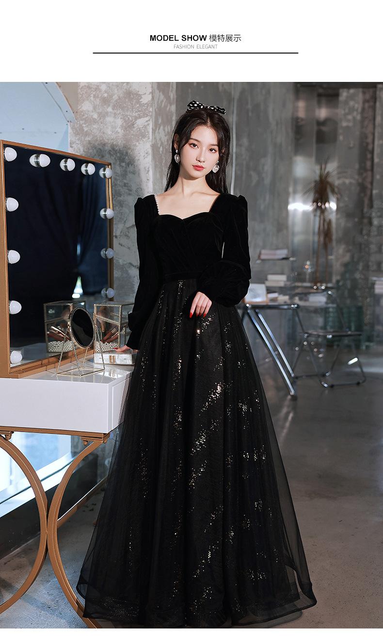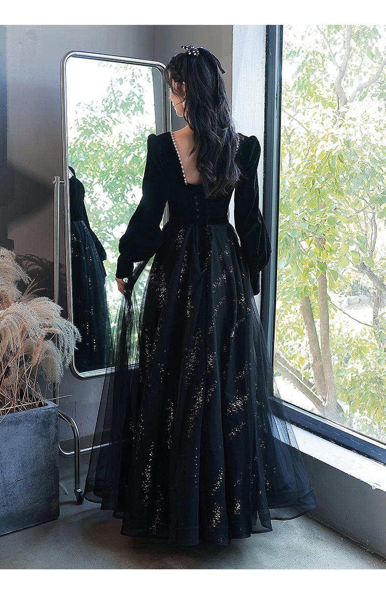 Vestido de Noche Negro para Mujer 2025 Nuevo Verano Banquete Elegante Celebridad Arte Vestido de Examen Manga Larga Vestido Fiesta Anual