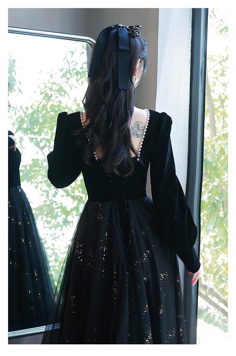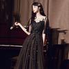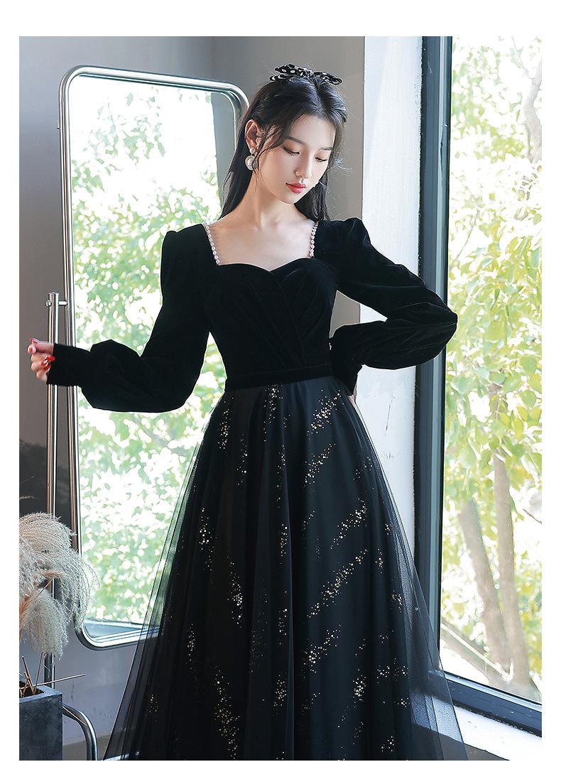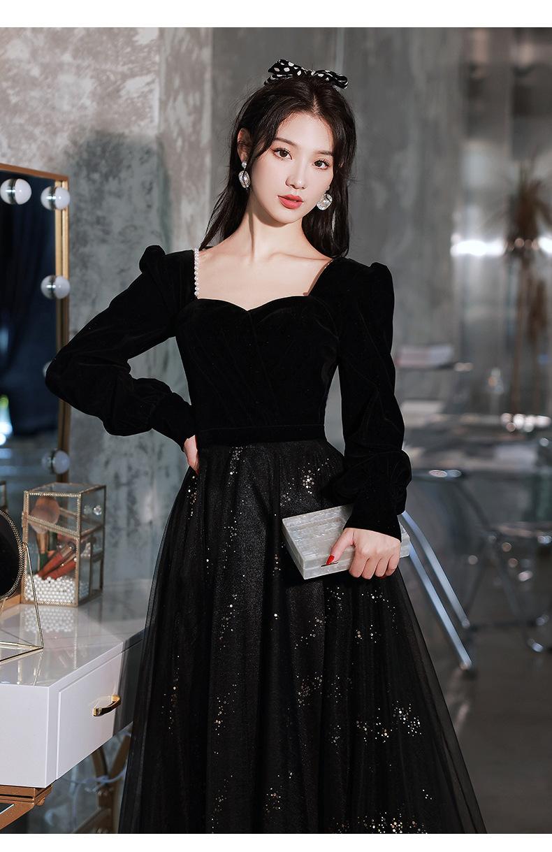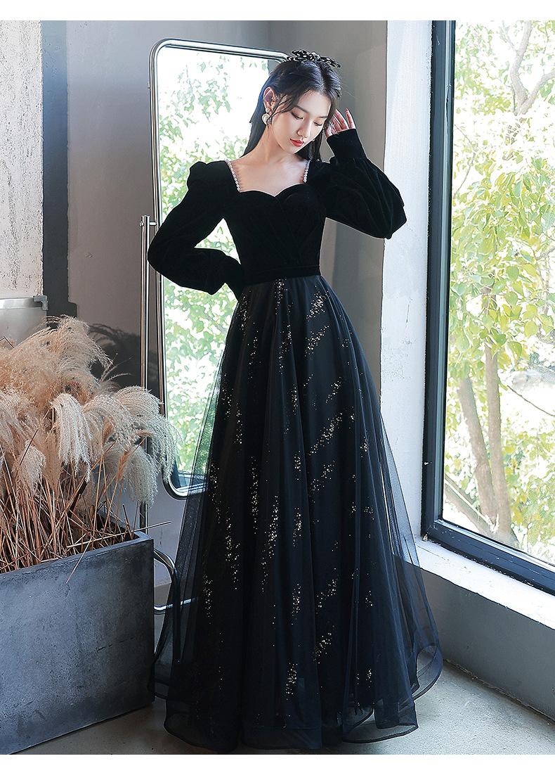Vestido de Noche Negro para Mujer 2025 Nuevo Verano Banquete Elegante Celebridad Arte Vestido de Examen Manga Larga Vestido Fiesta Anual