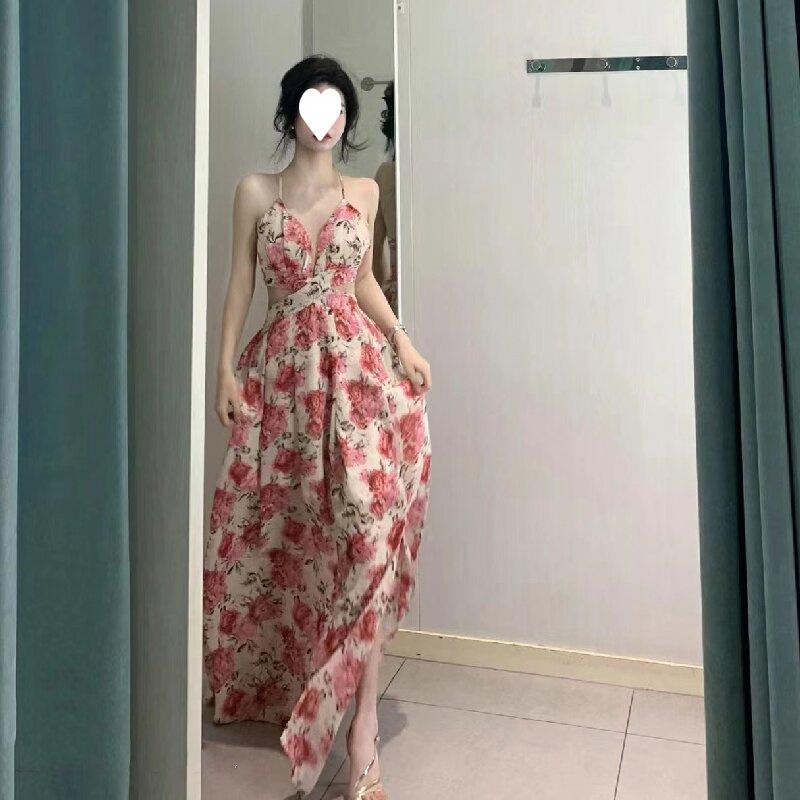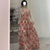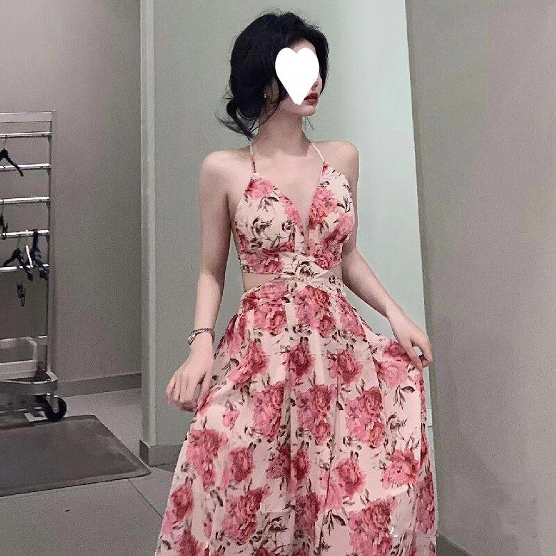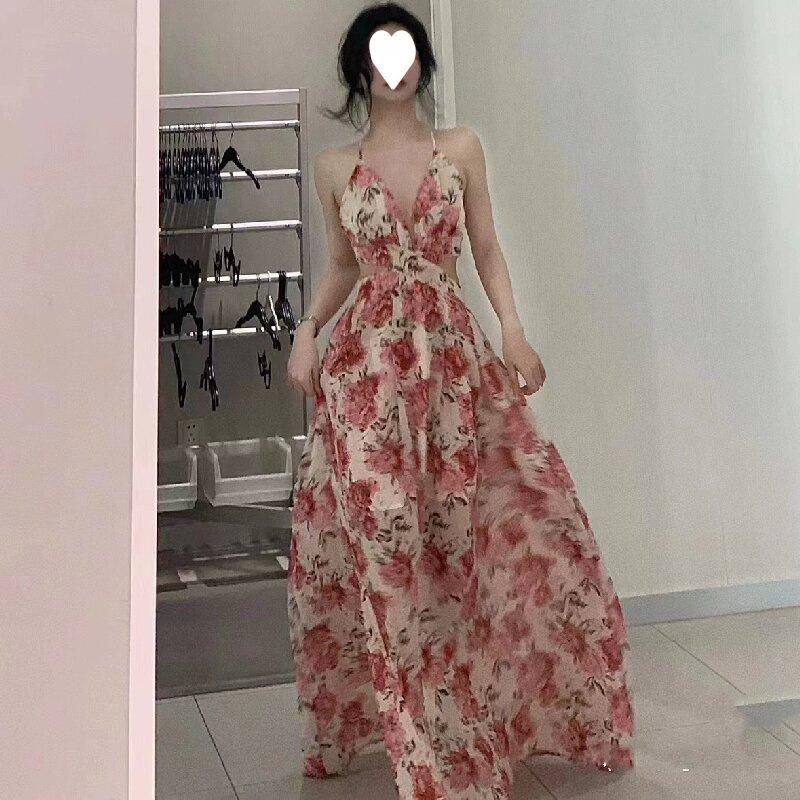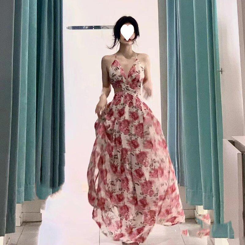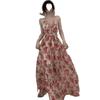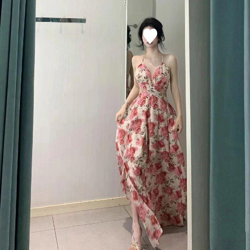 Vestido Largo Elegante Floral Francés con Cintura y Tirantes hasta el Tobillo Vestido de Vacaciones junto al Mar Vestido de Playa sin Espalda
