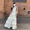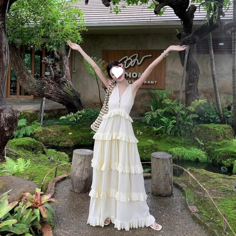 Falda con volantes y escote en V profundo para mujer, falda de playa para vacaciones junto al mar, falda larga de pastel sin mangas, vestido a la cintura, verano