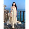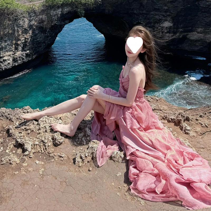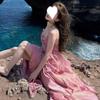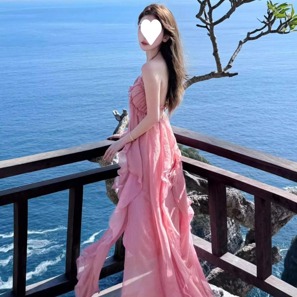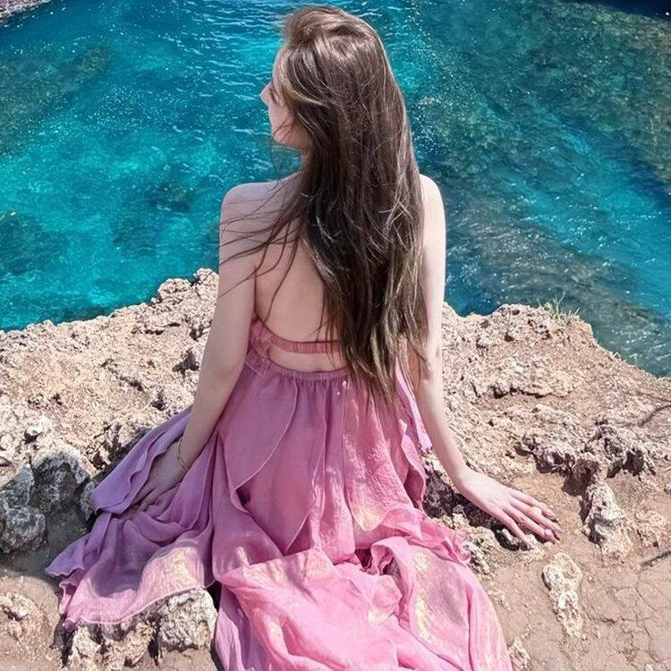 Vestido Rosa con Volantes en la Espalda Descubierta Halter de Tirantes para Mujer Verano Vacaciones en la Playa Foto Falda