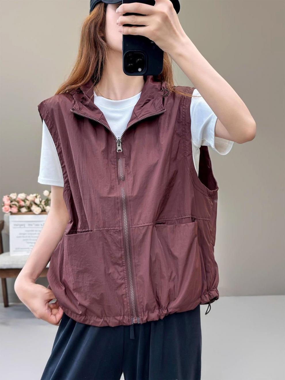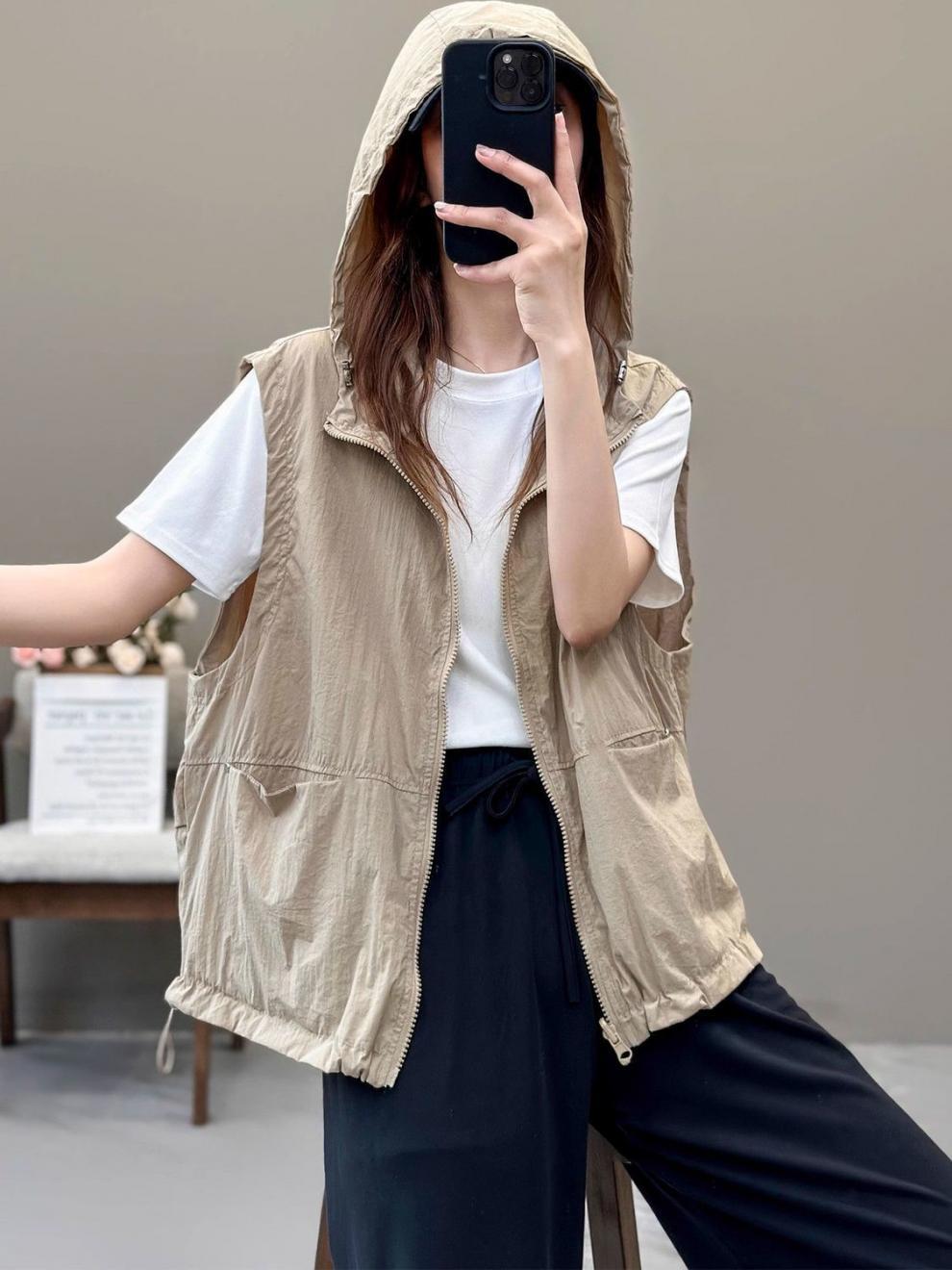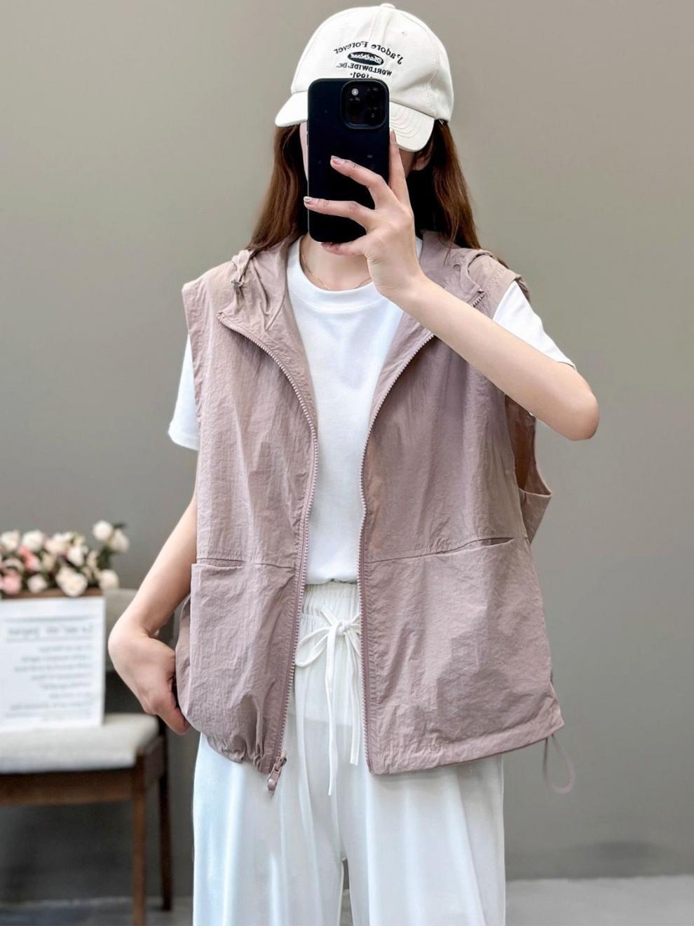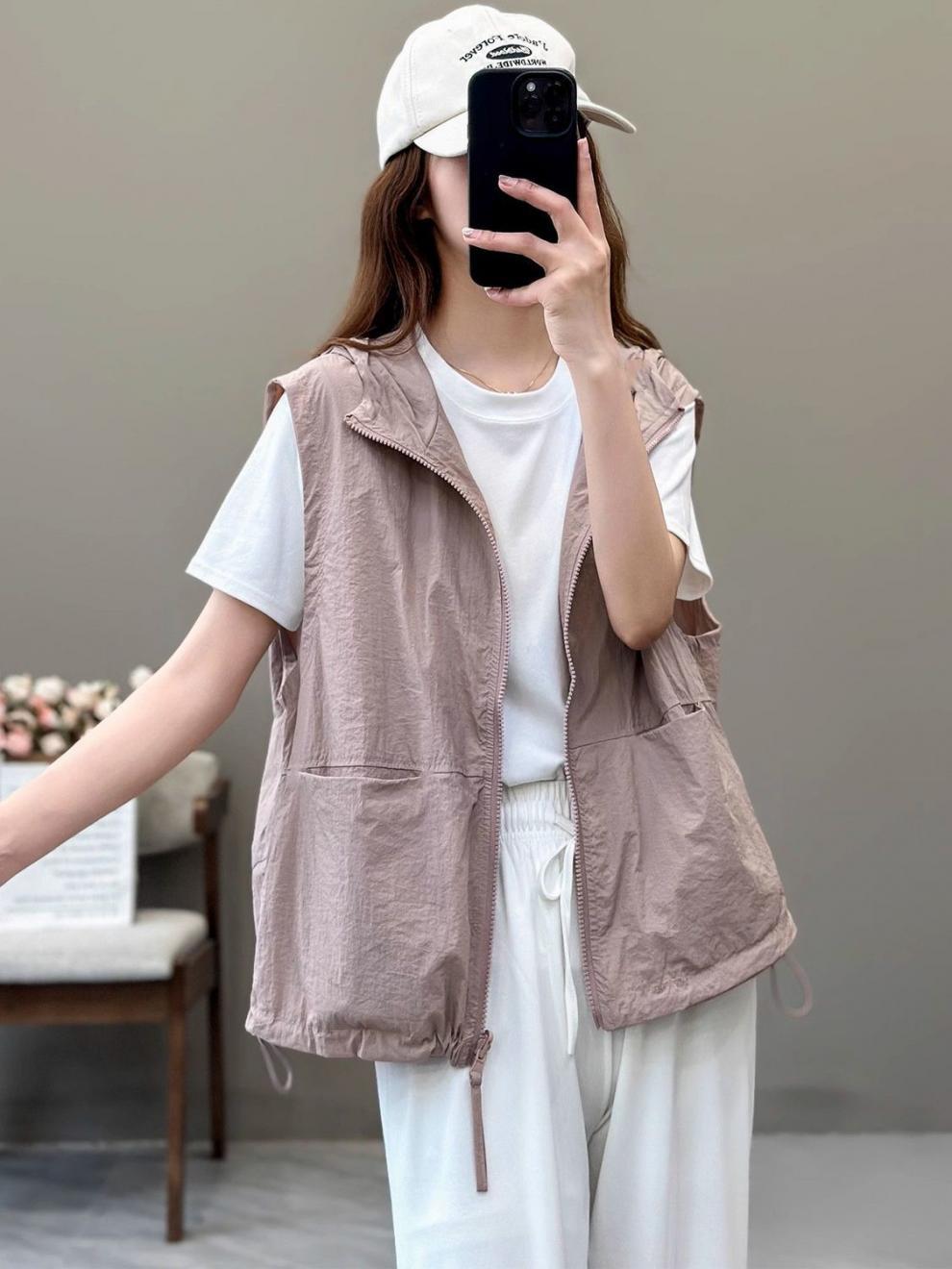 Chaleco con capucha deportivo casual delgado de primavera y verano de un solo lado para exterior, chaleco sin mangas moderno que combina con todo, chaqueta de moda para mujer