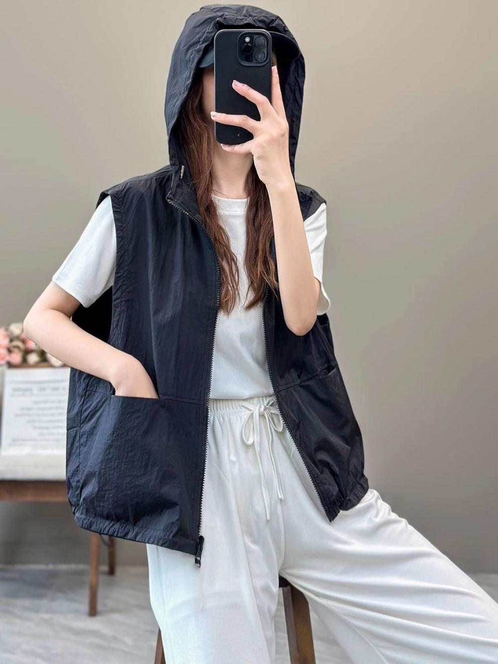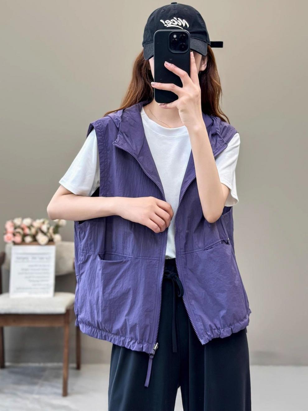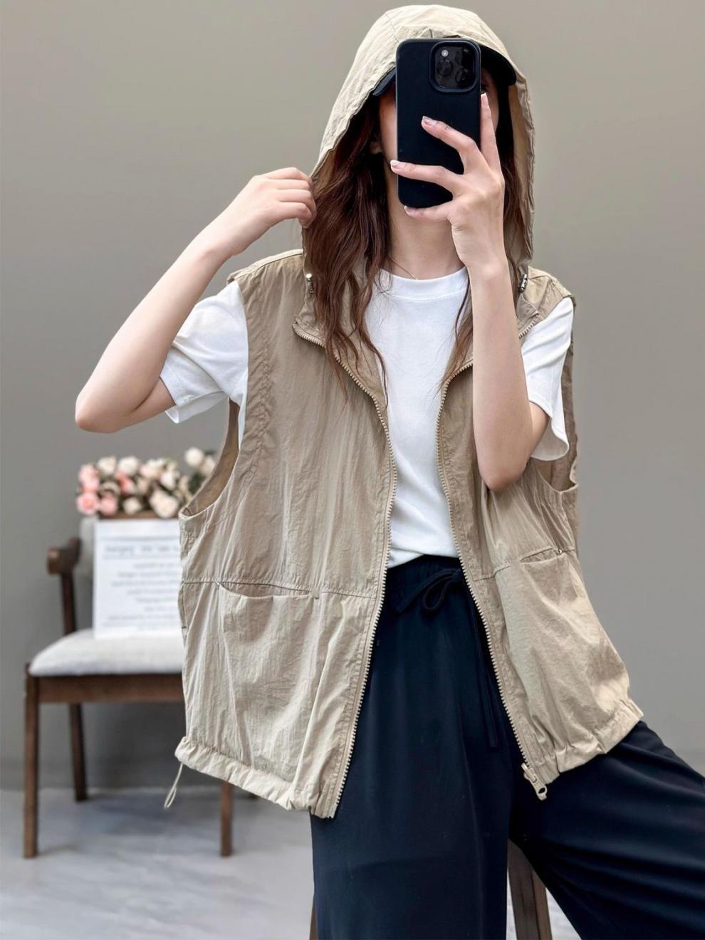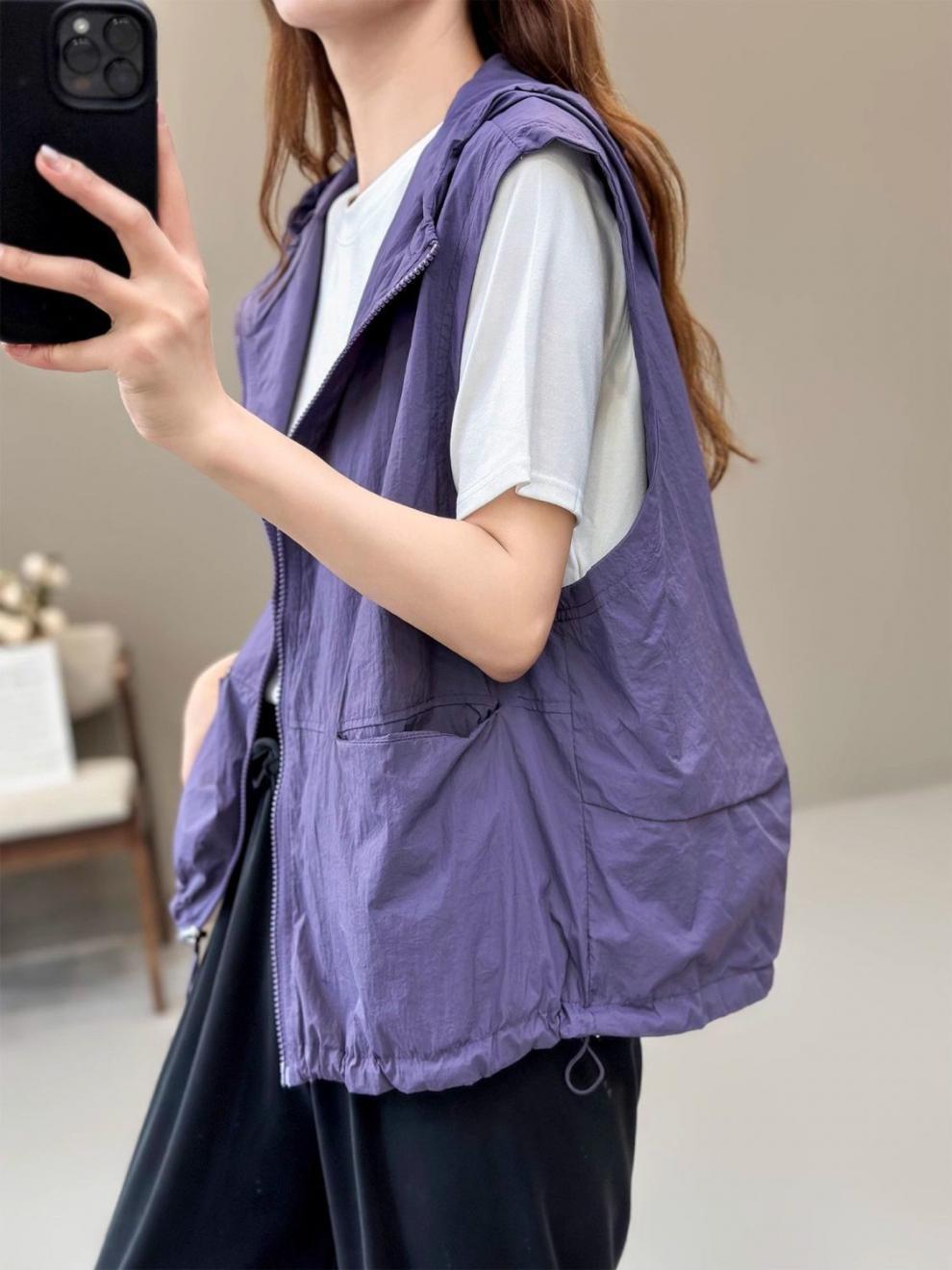 Chaleco con capucha deportivo casual delgado de primavera y verano de un solo lado para exterior, chaleco sin mangas moderno que combina con todo, chaqueta de moda para mujer
