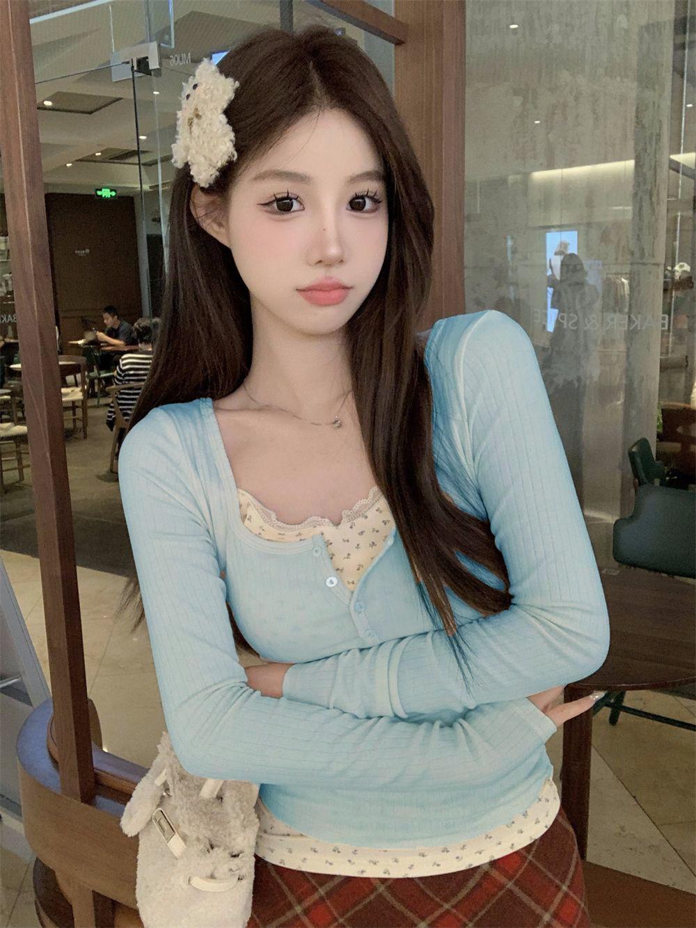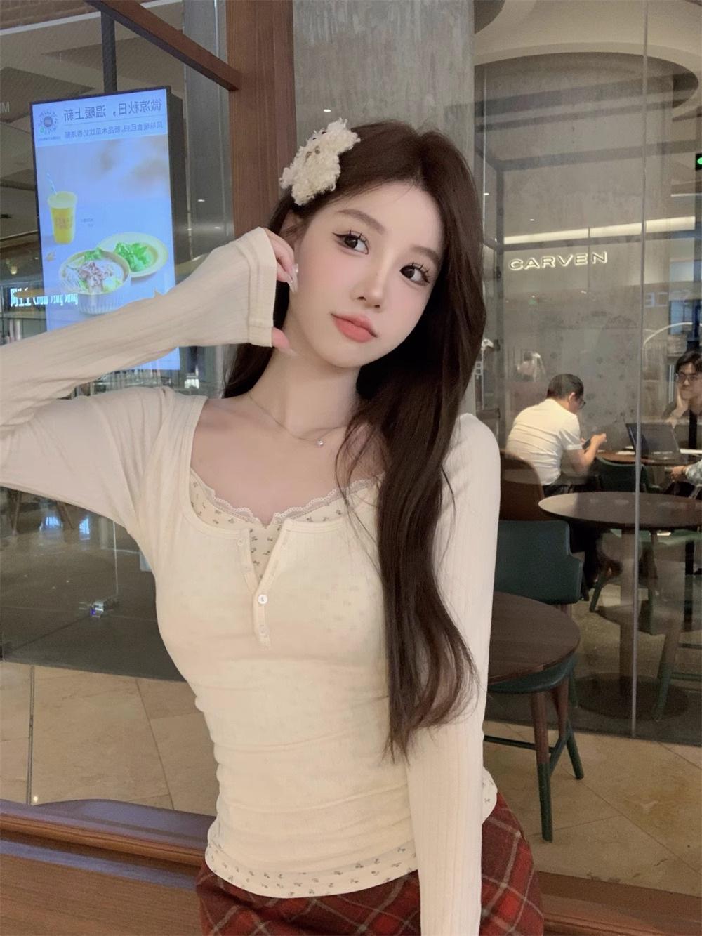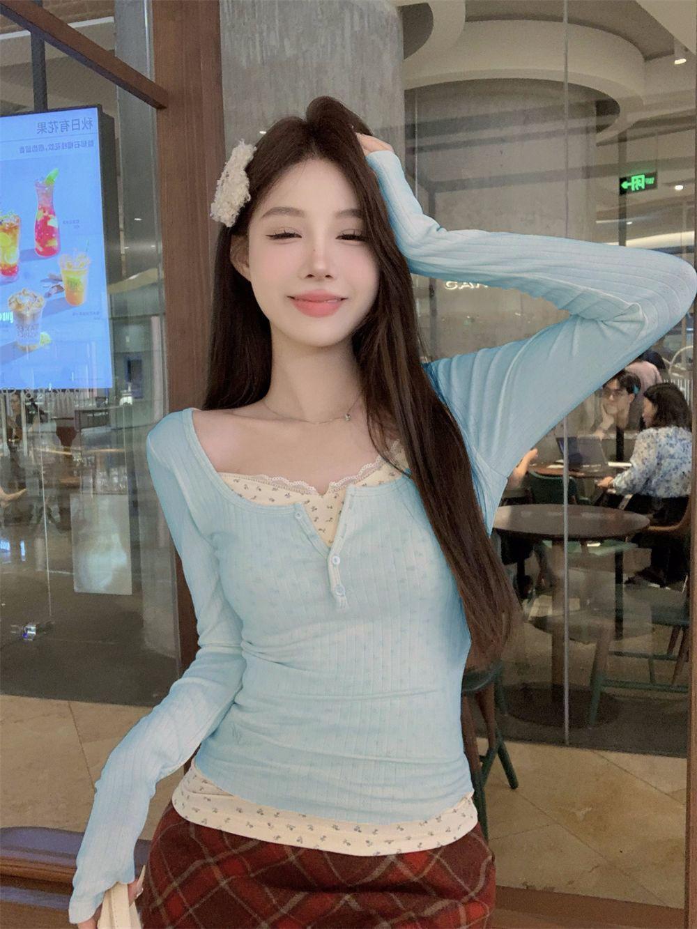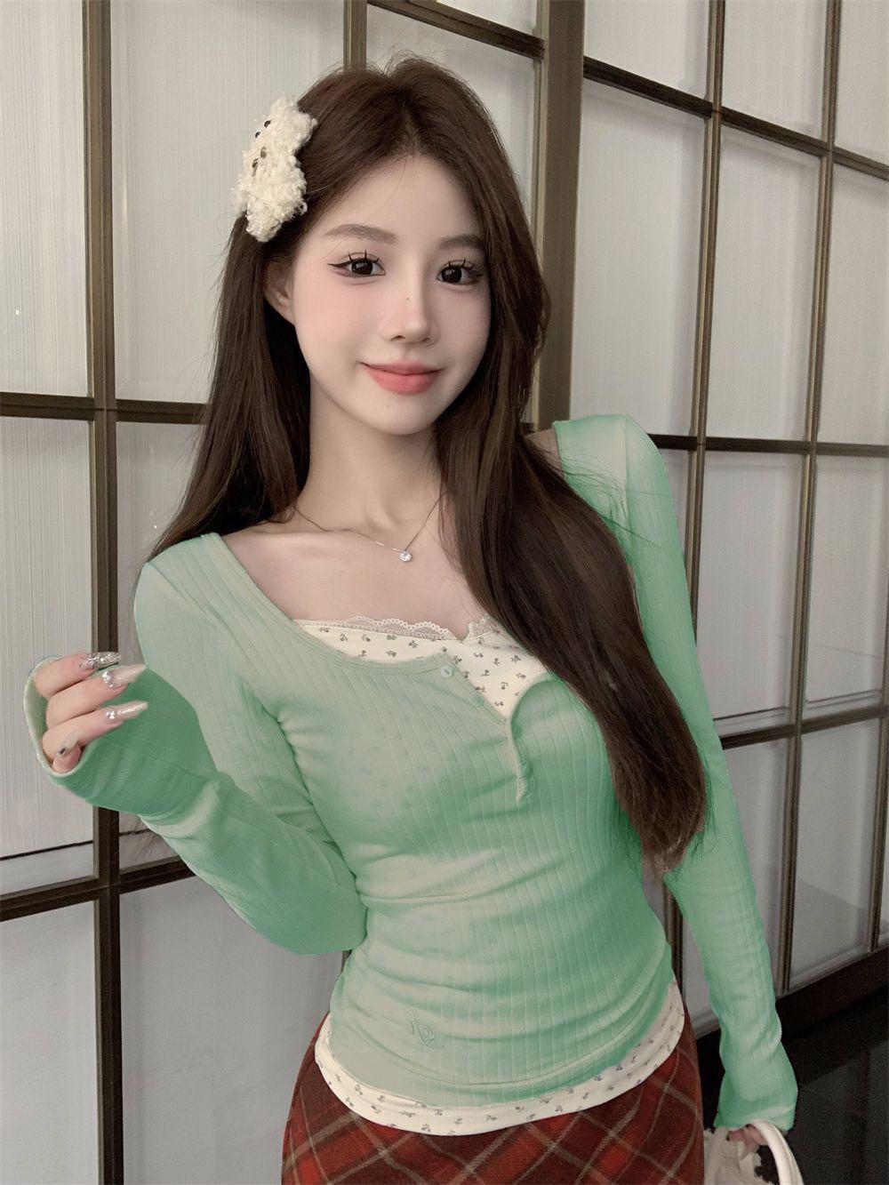 Camisa Base Floral de Encaje Dulce y Picante Estilo Francés Diseño Otoño e Invierno Estilo Puro Deseo Corte Ajustado Falso Top Base Interior de Dos Piezas