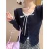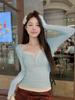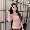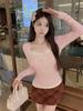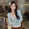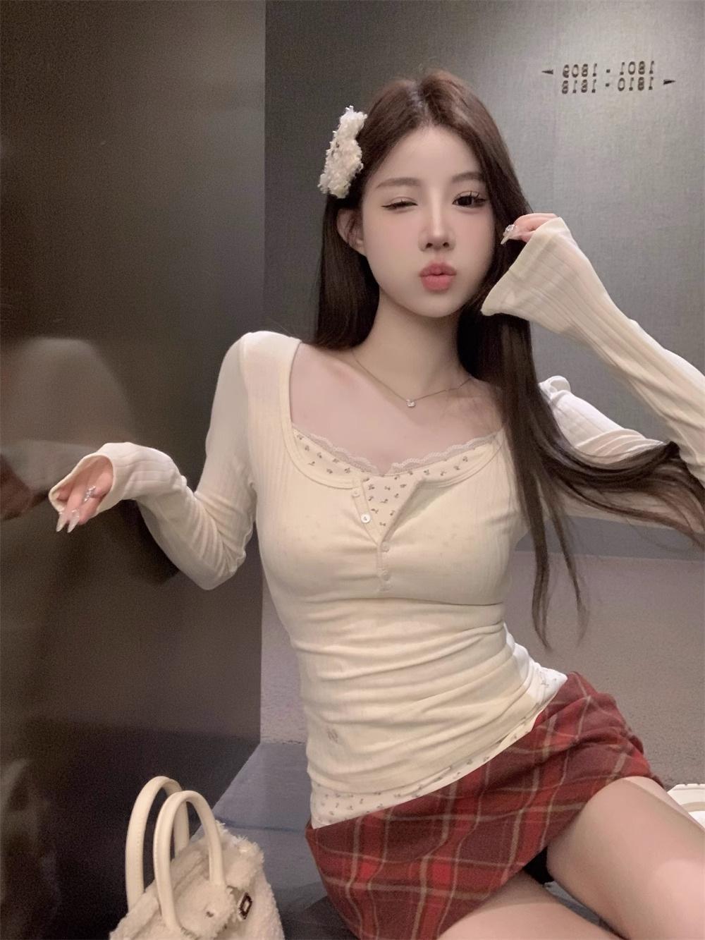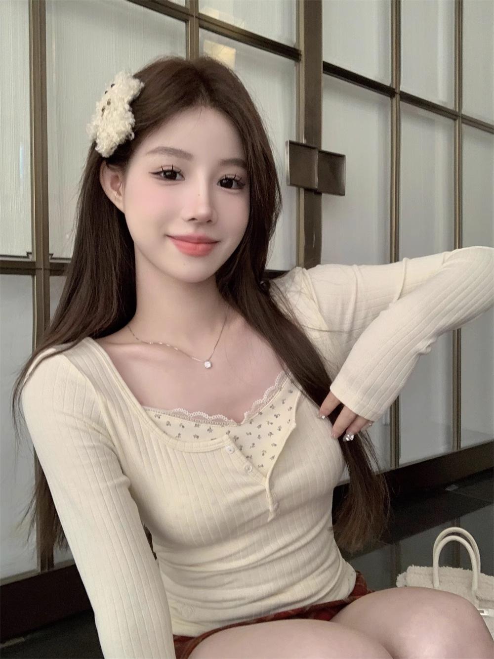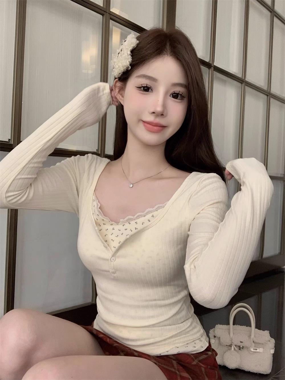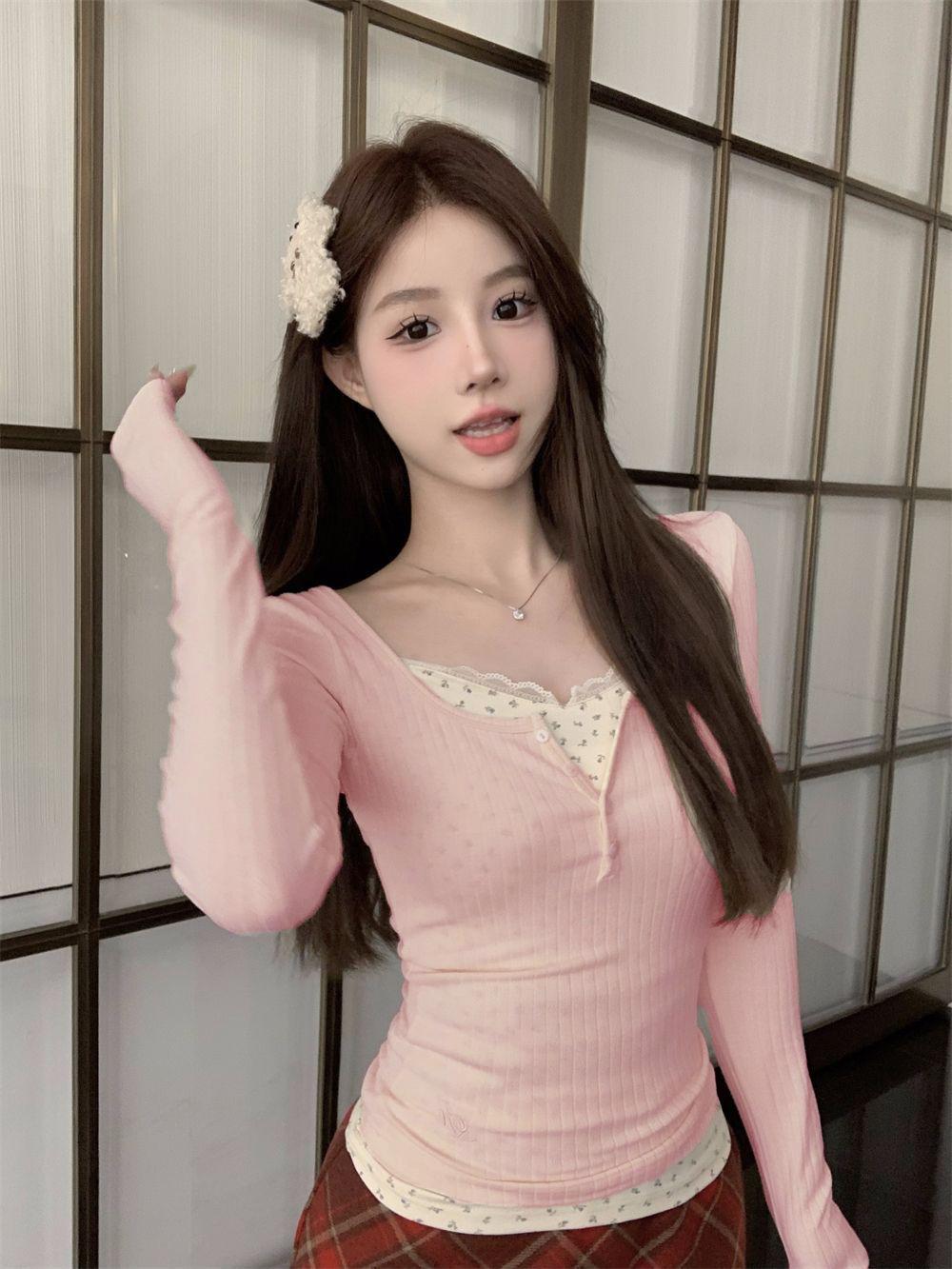 Camiseta básica floral de encaje dulce y picante francés diseño de otoño e invierno estilo puro deseo corte ajustado top básico falso de dos piezas