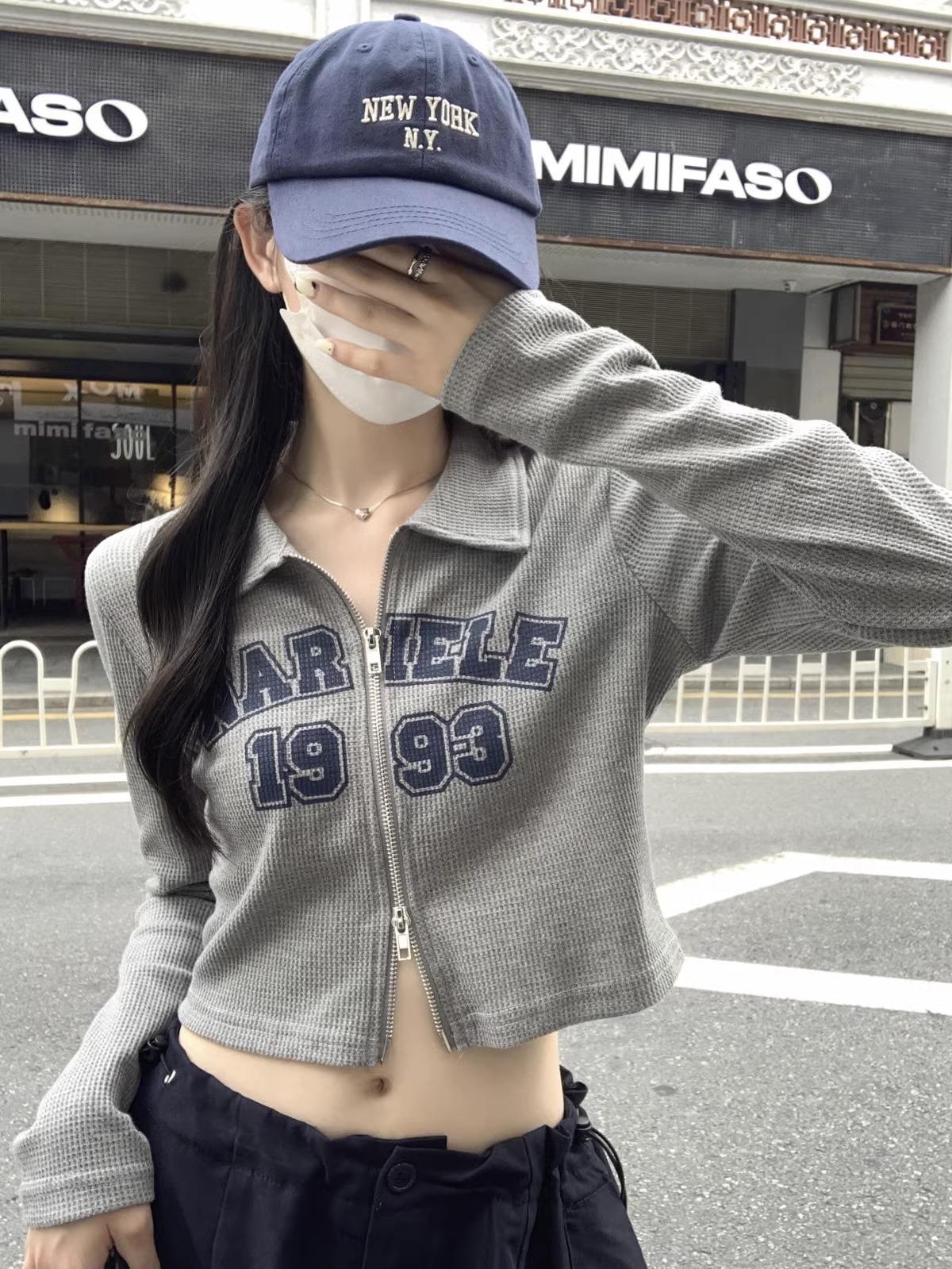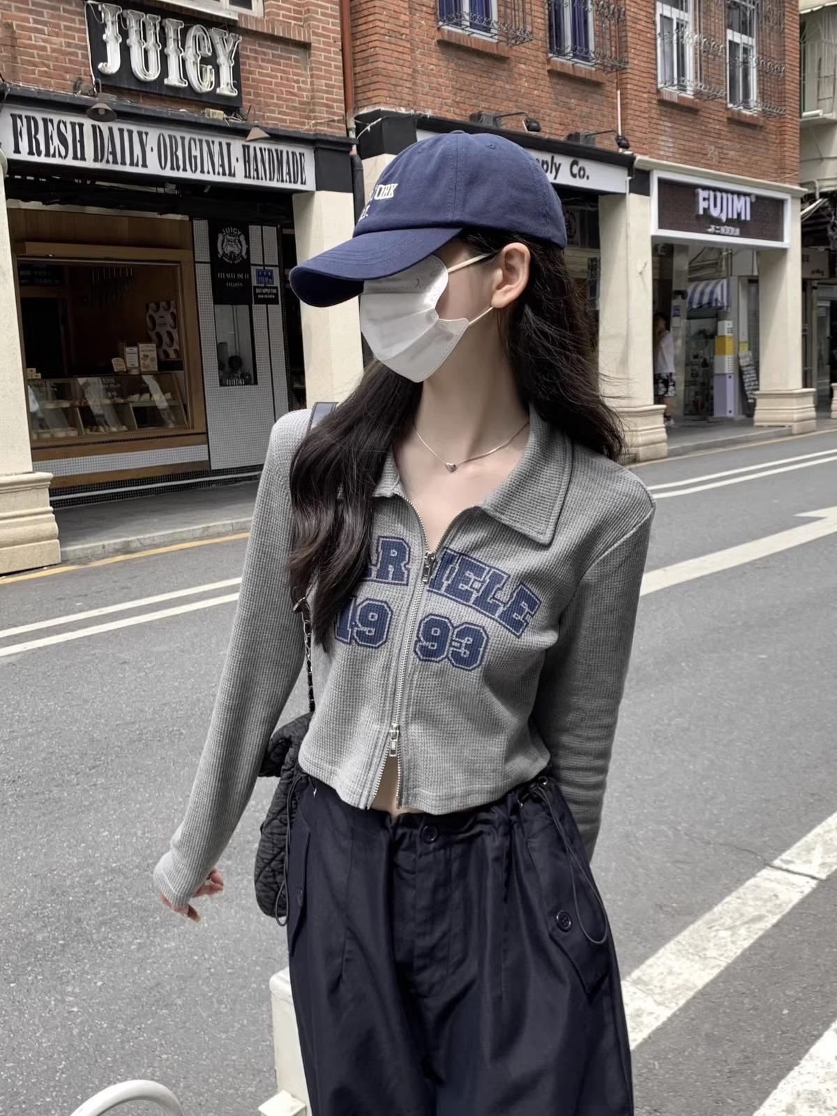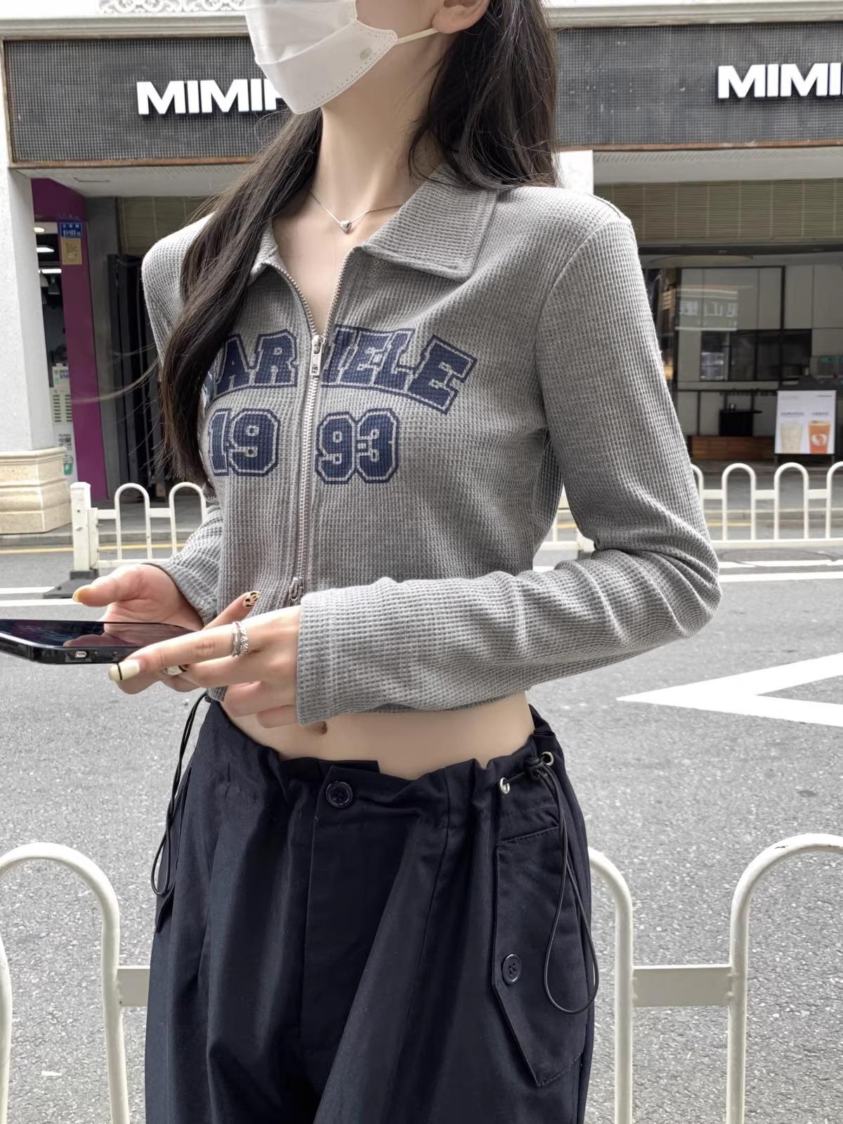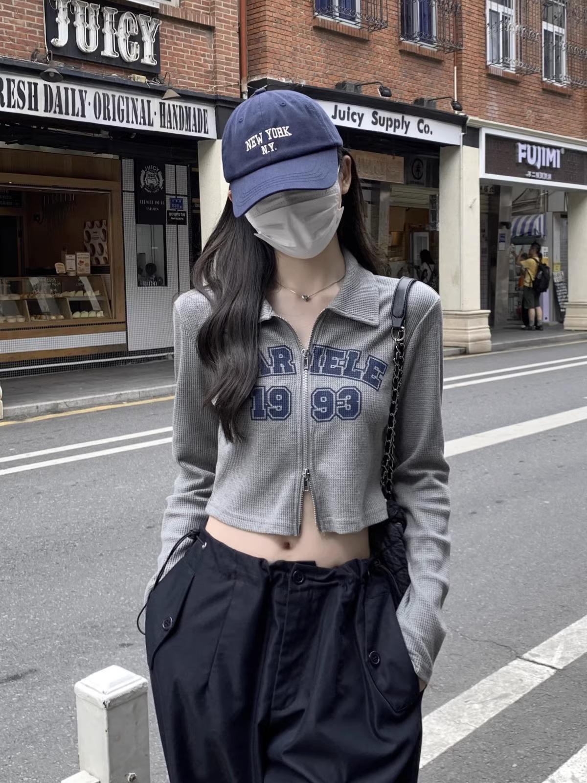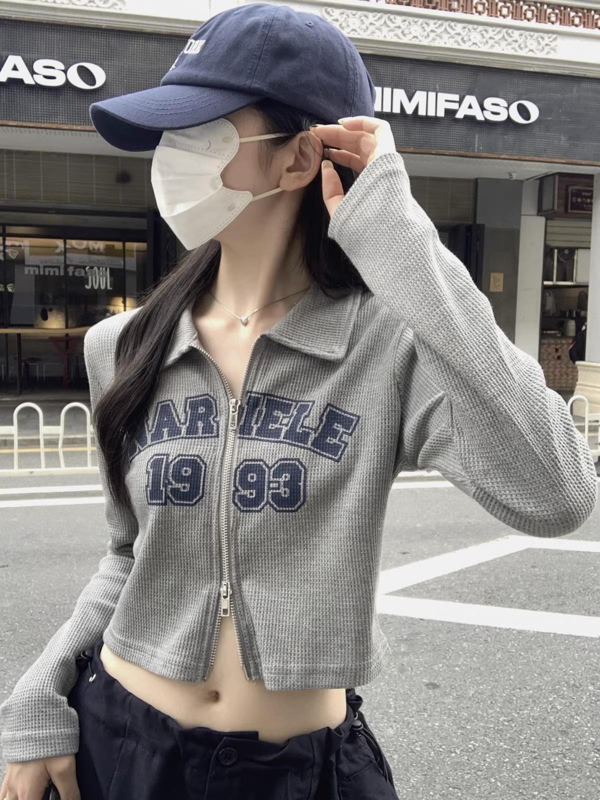 Camiseta Lapp de Hombro Manga Larga Principios de Otoño Slim Ajustada Cárdigan Estampado de Doble Cremallera Corto Estilo Americano Retro Trendy Top