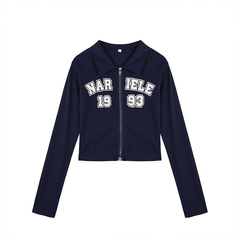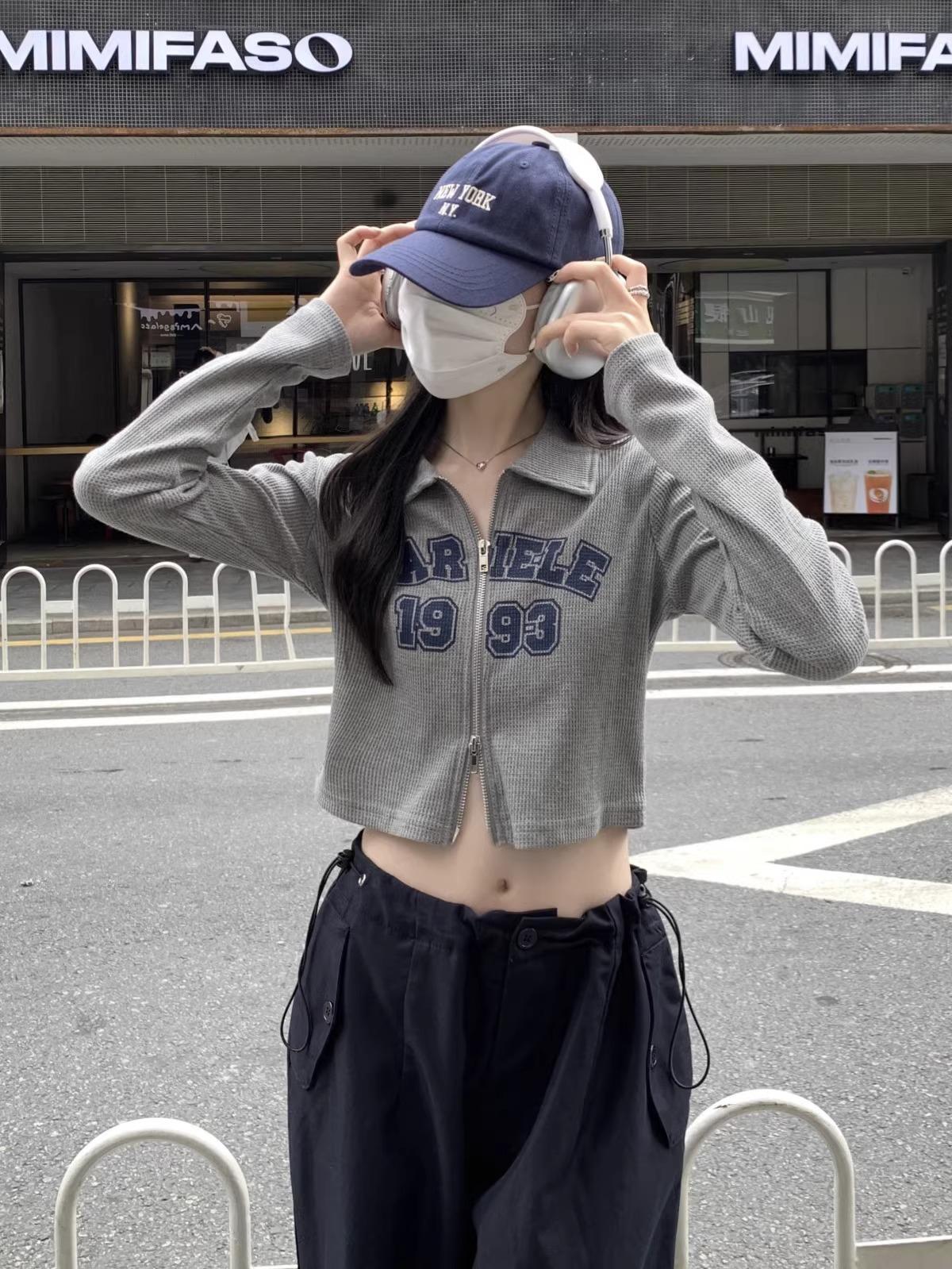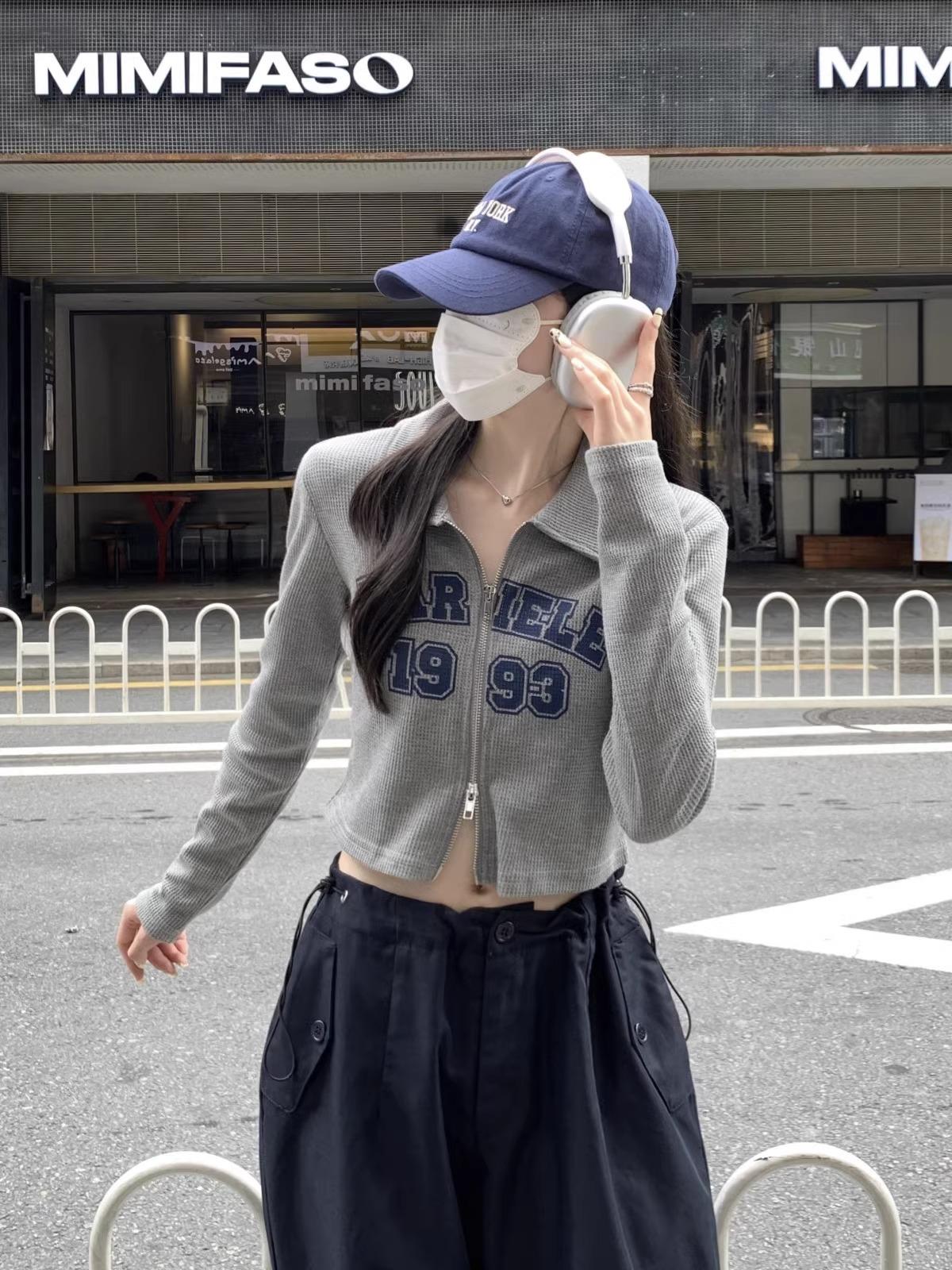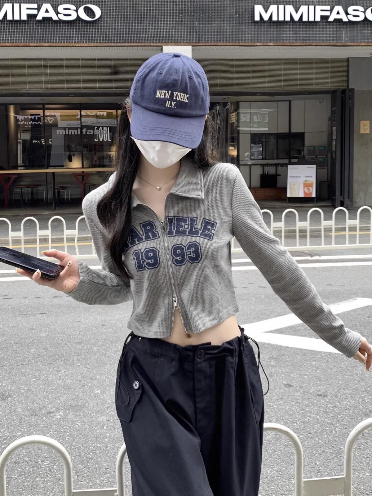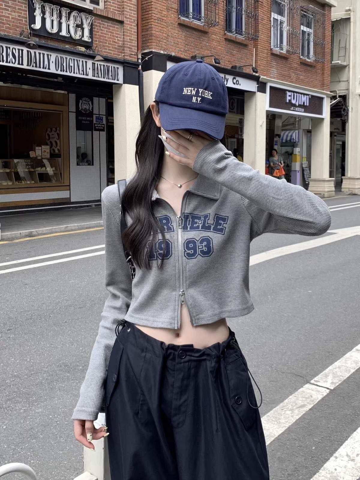 Camiseta Lapp de Hombro Manga Larga Principios de Otoño Slim Ajustada Cárdigan Estampado de Doble Cremallera Corto Estilo Americano Retro Trendy Top