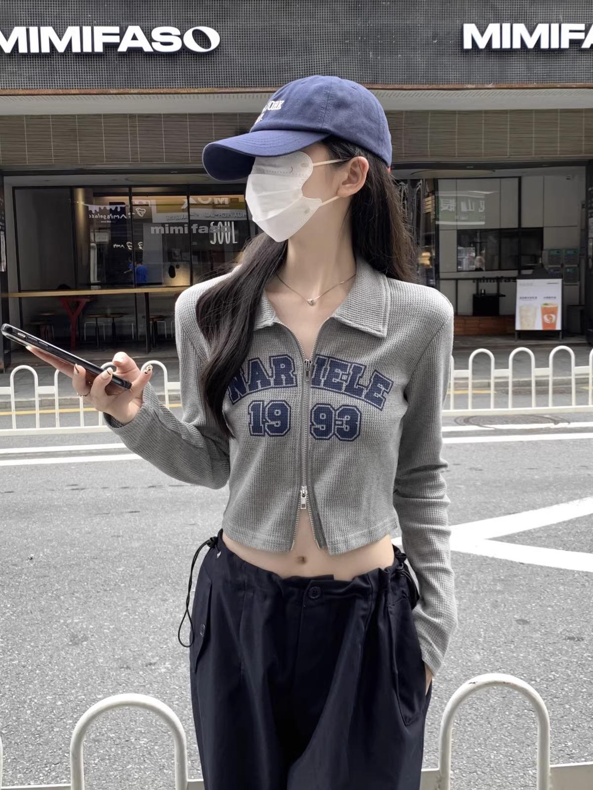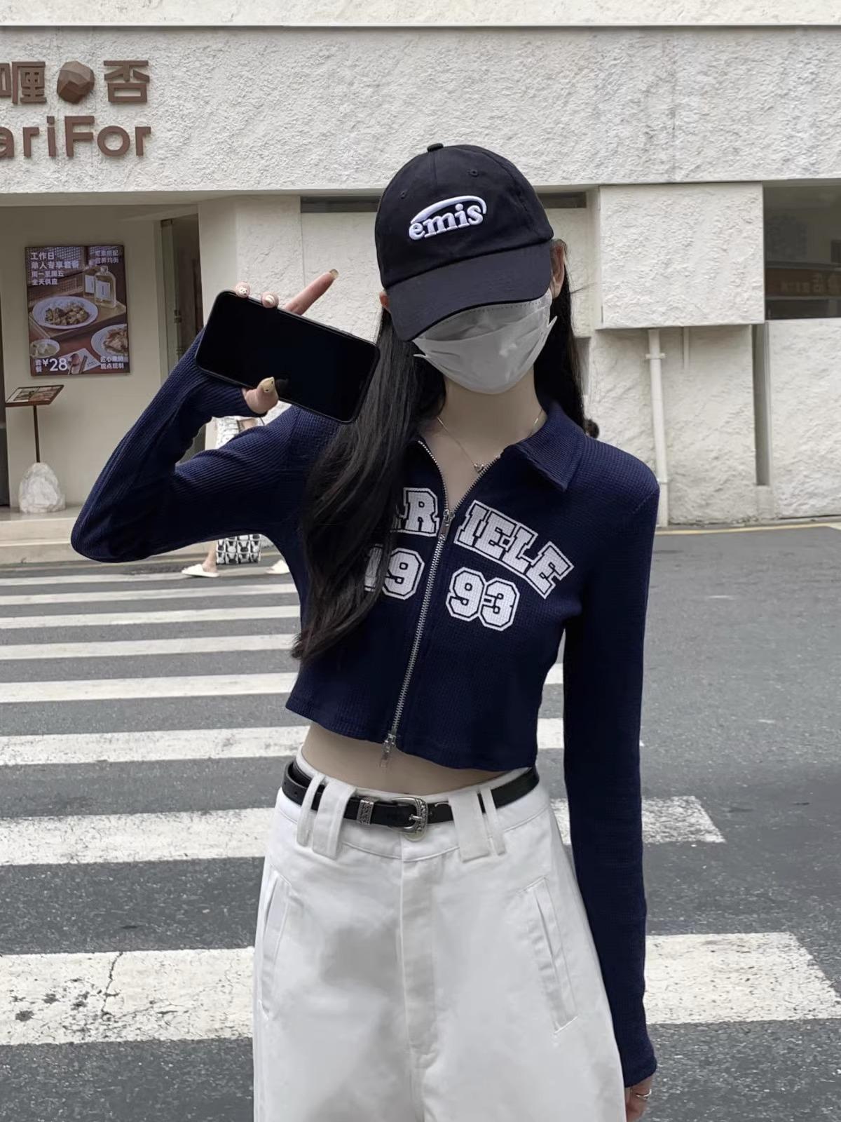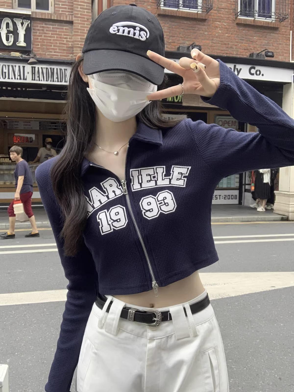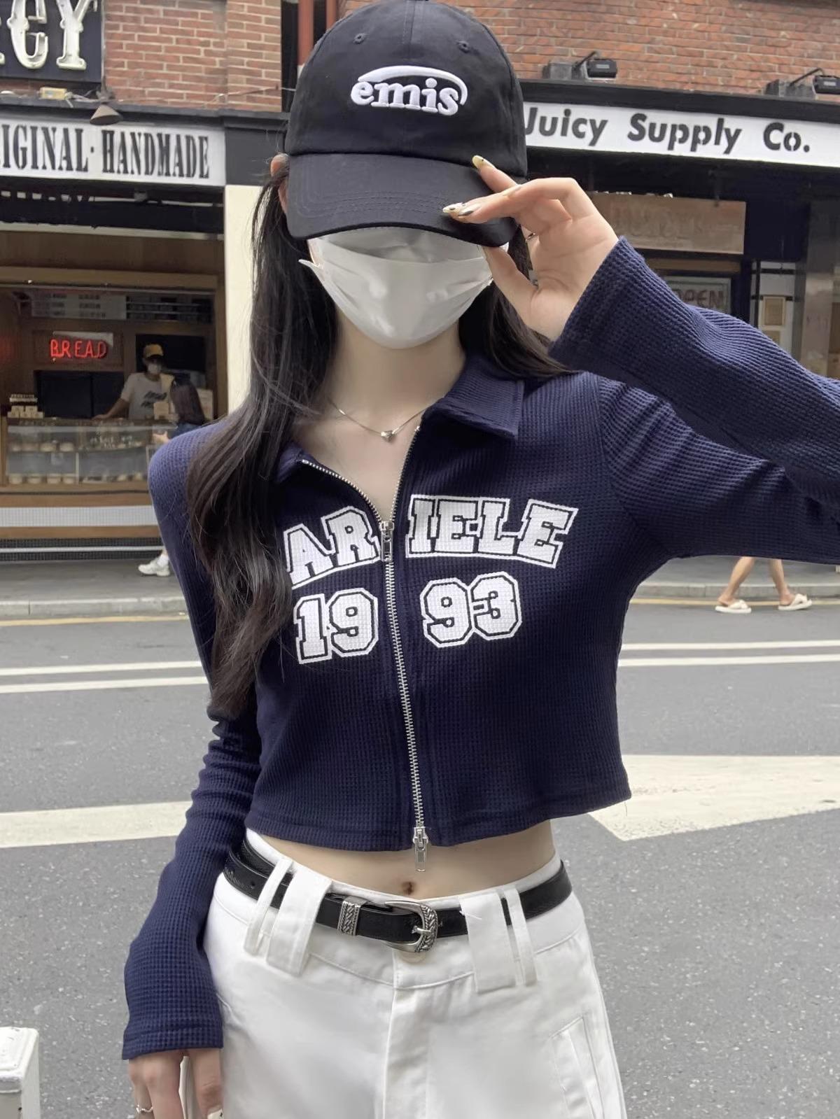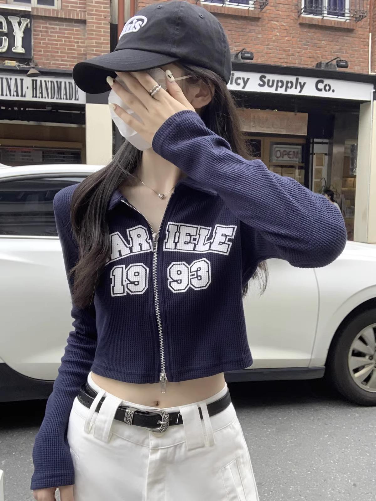 Camiseta Lapp de Hombro Manga Larga Principios de Otoño Slim Ajustada Cárdigan Estampado de Doble Cremallera Corto Estilo Americano Retro Trendy Top