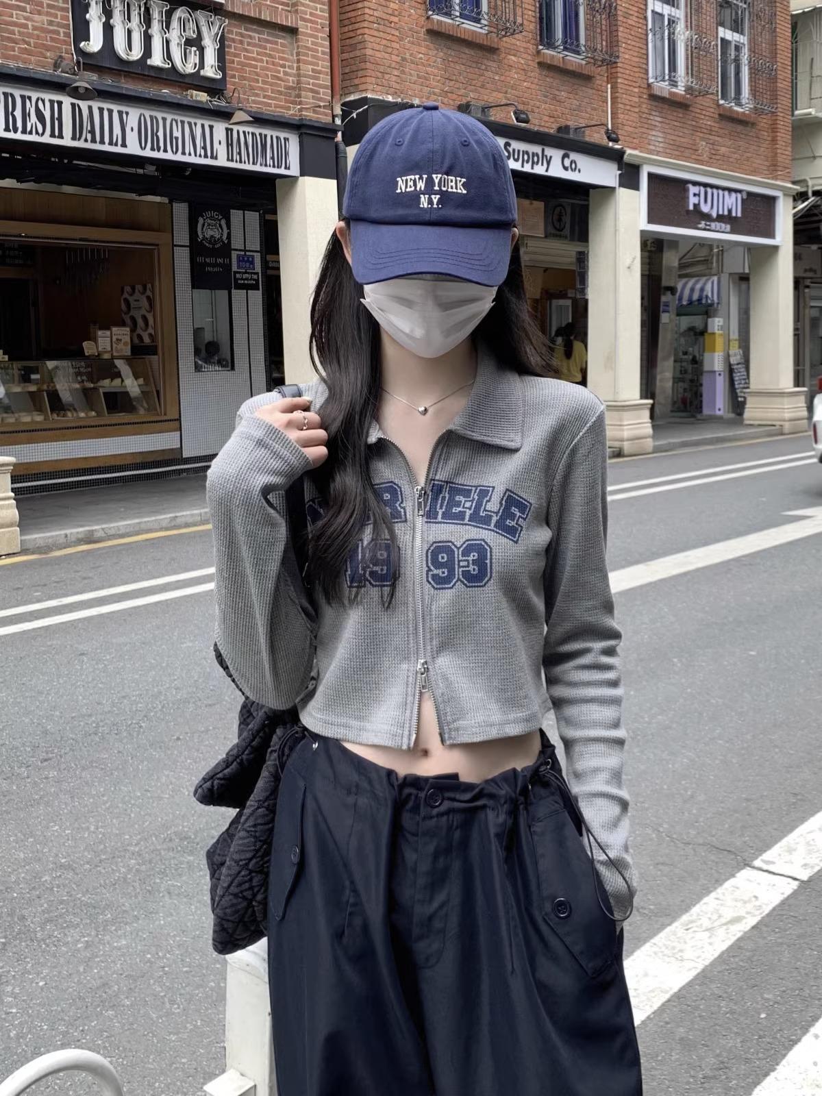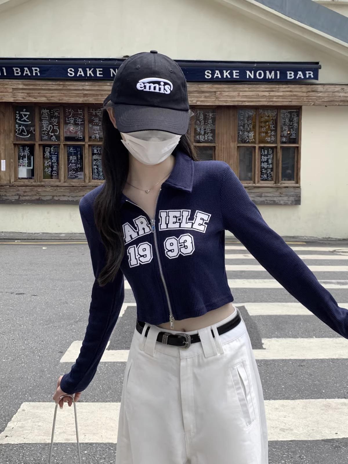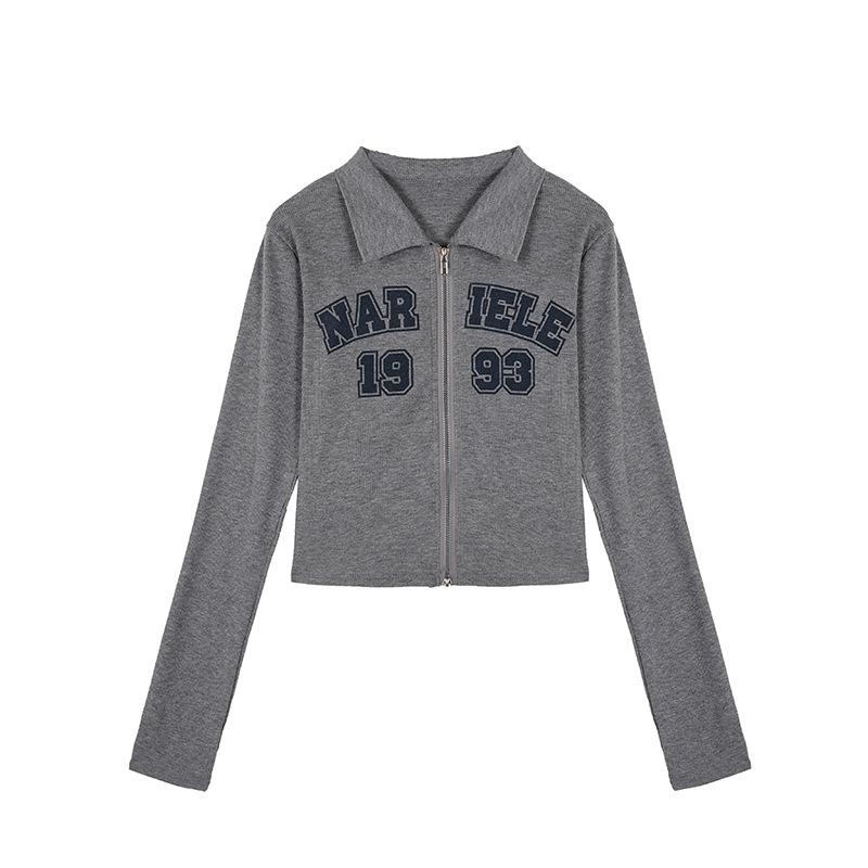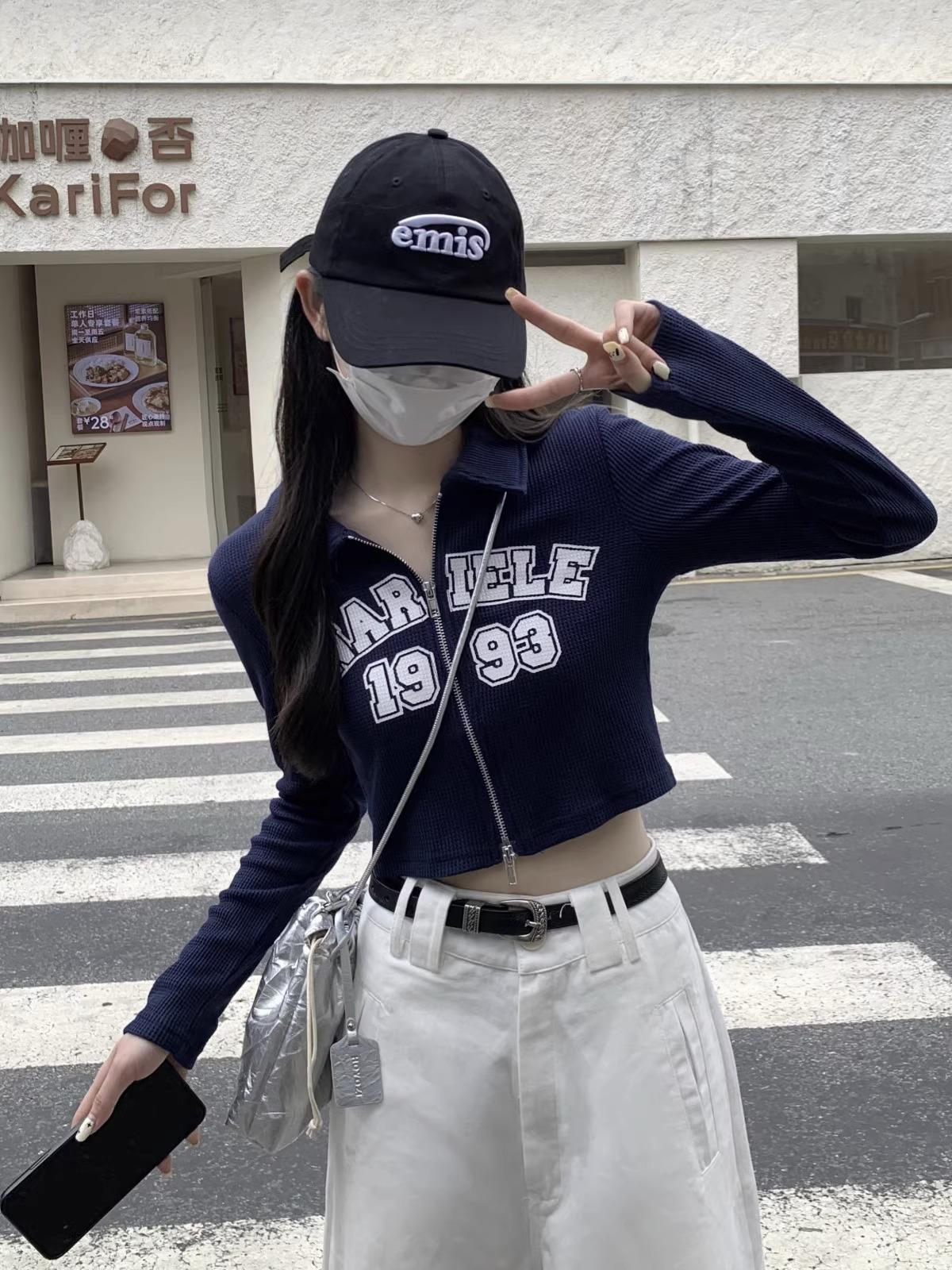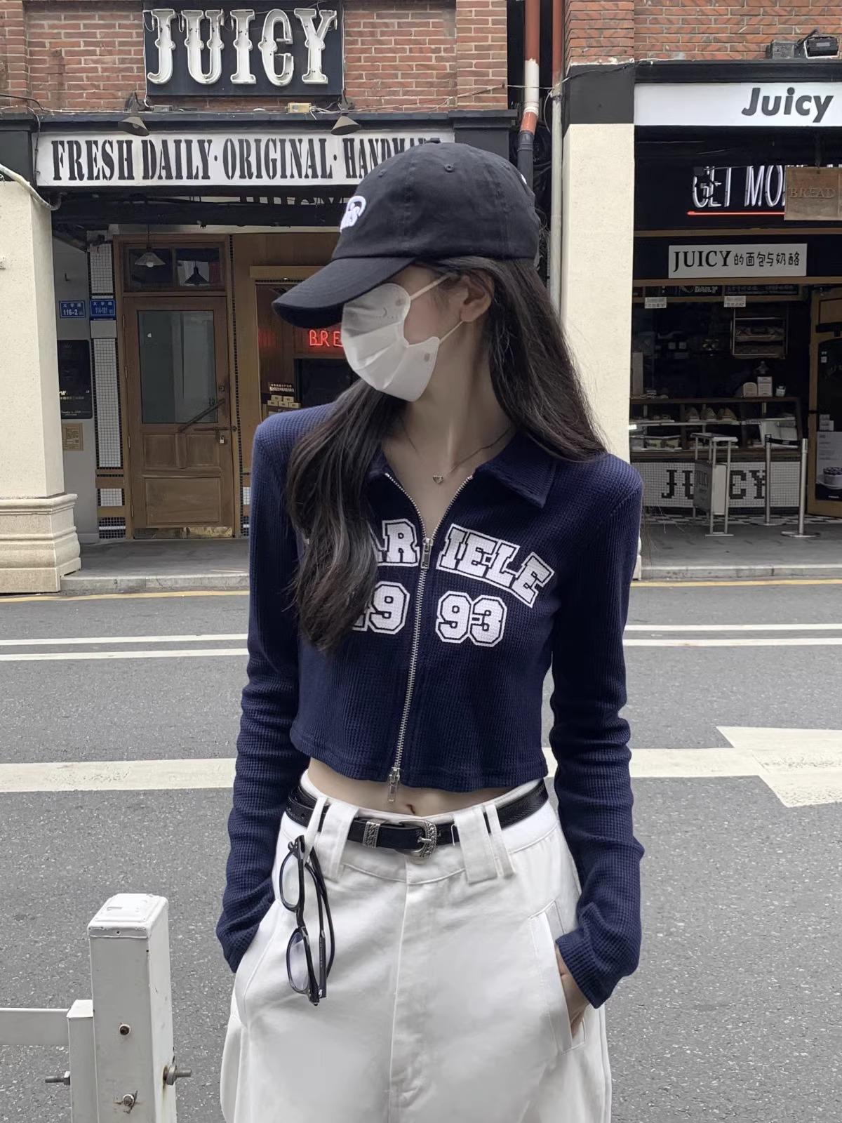Camiseta Lapp de Hombro Manga Larga Principios de Otoño Slim Ajustada Cárdigan Estampado de Doble Cremallera Corto Estilo Americano Retro Trendy Top