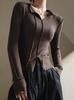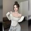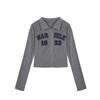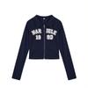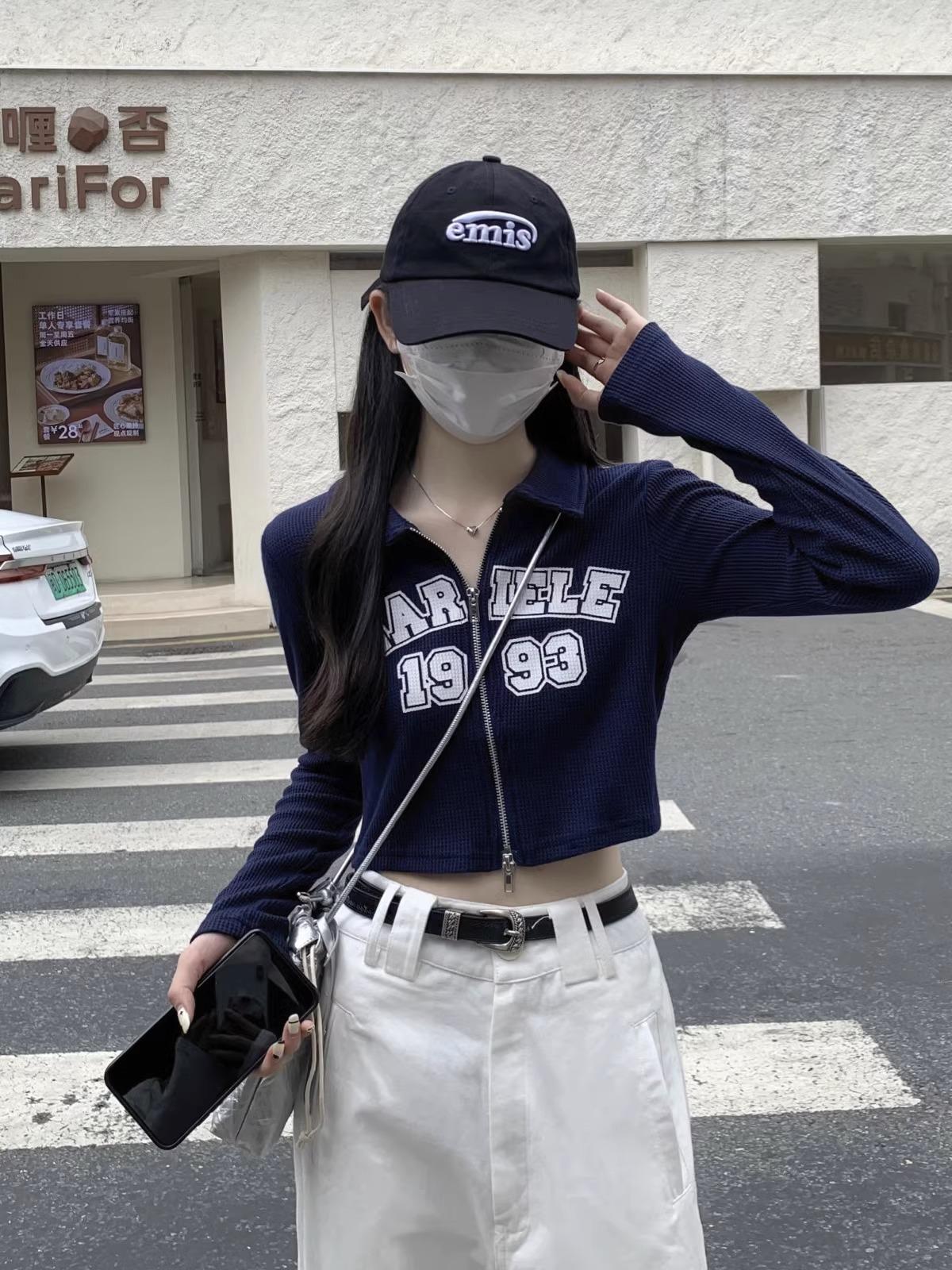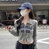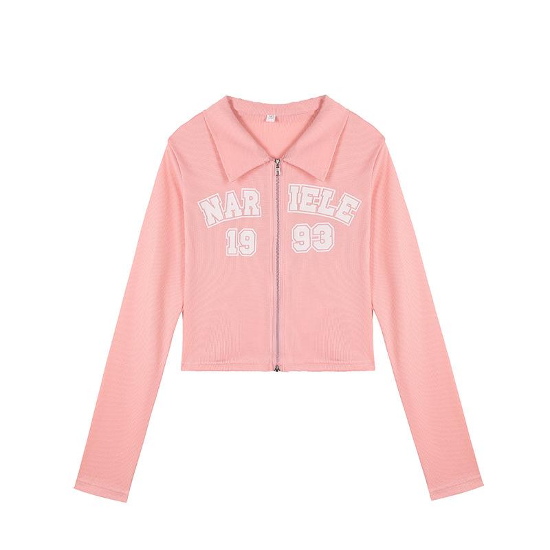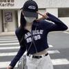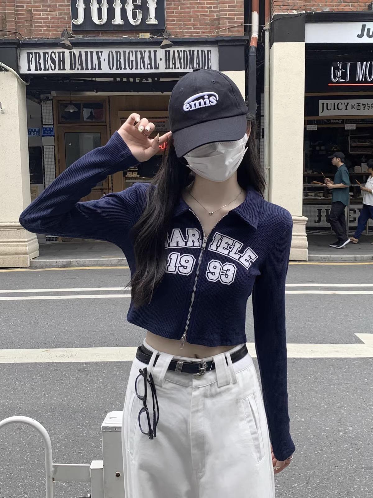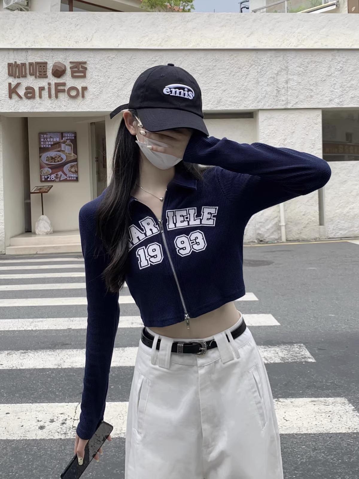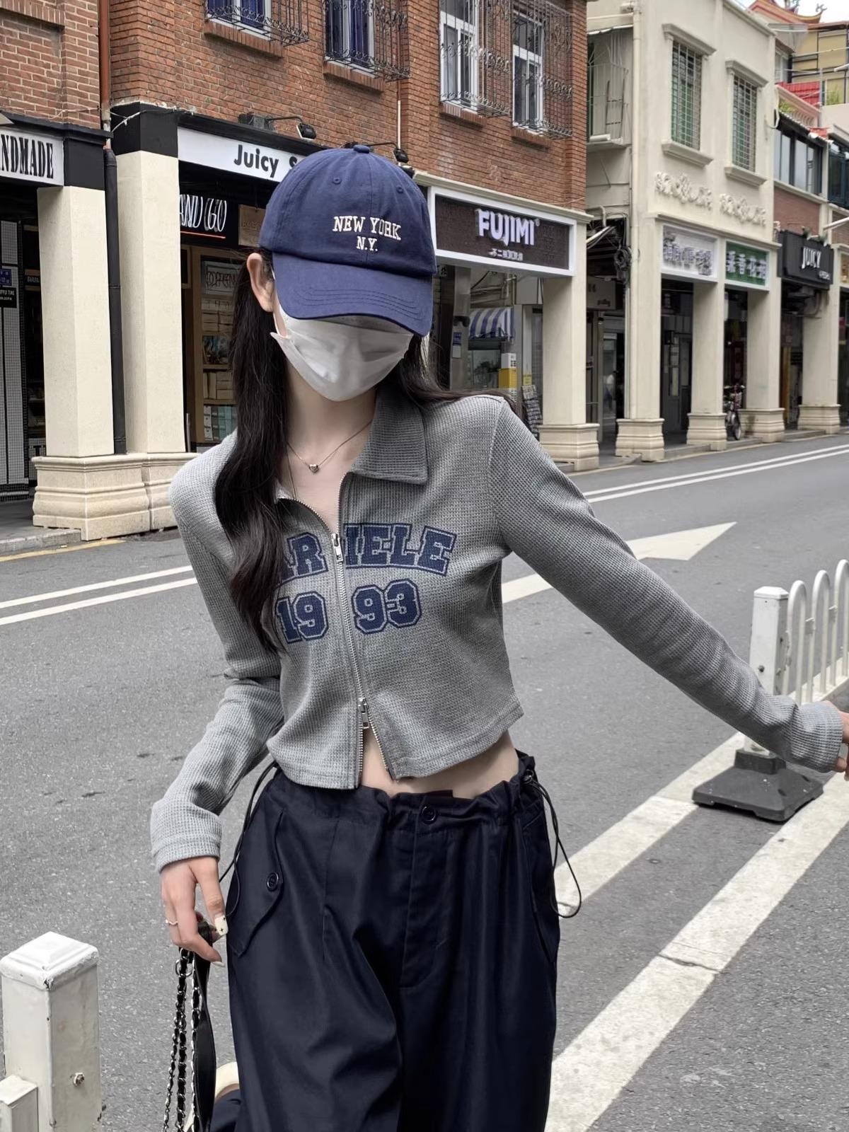 Camiseta Lapp de Hombro Manga Larga Principios de Otoño Slim Ajustada Cárdigan Estampado de Doble Cremallera Corto Estilo Americano Retro Trendy Top