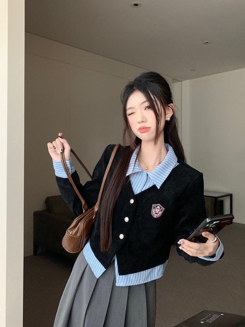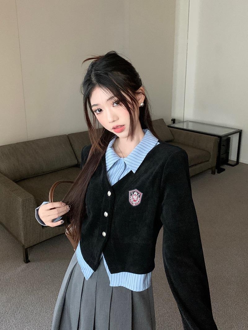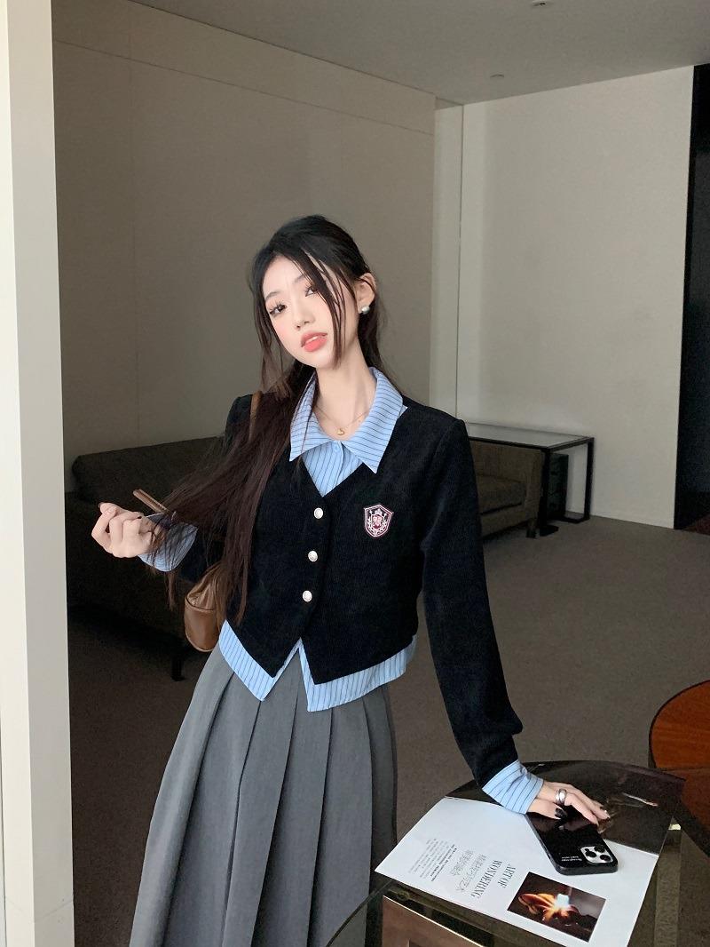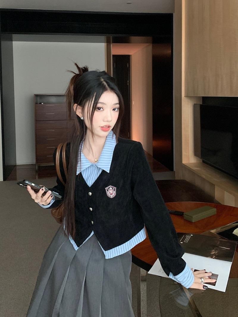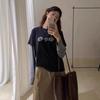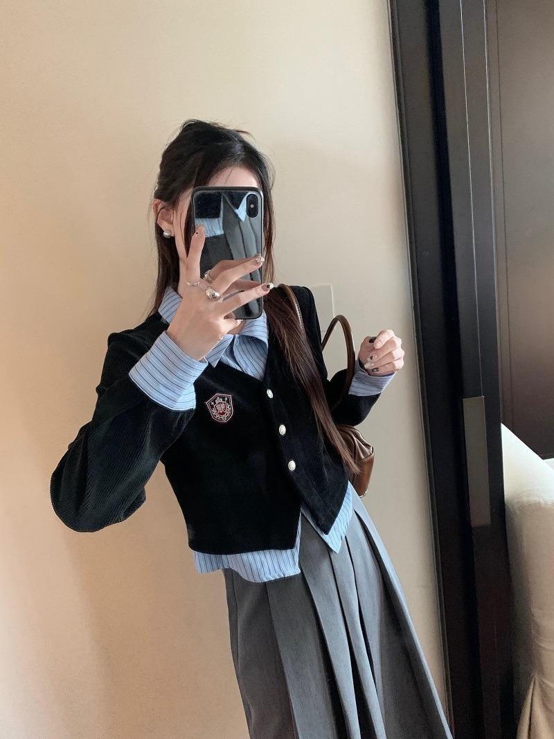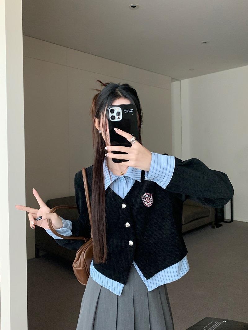 Tops coreanos de estilo preppy de dos piezas falsas para mujer 2025 Diseño Nicho Otoño e Invierno Nuevo Estilo Estilo Occidental Camiseta Básica Reductora de Edad