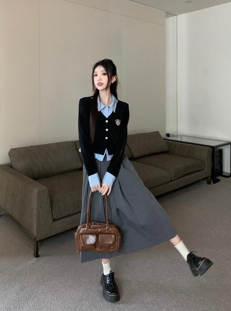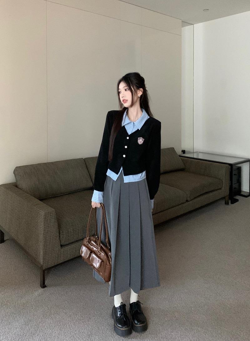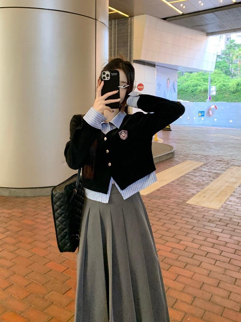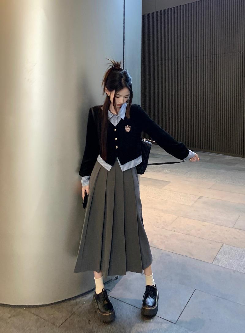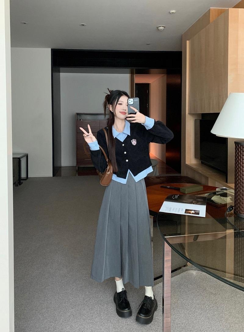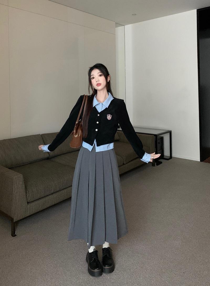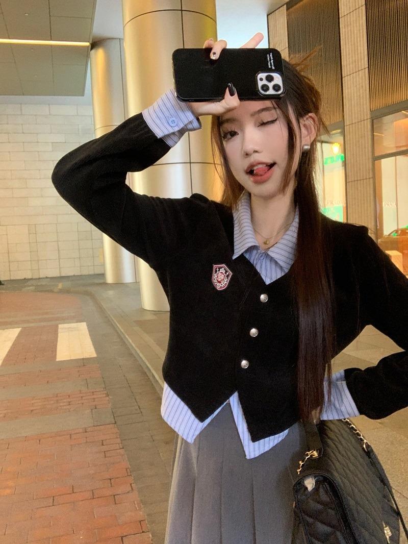 Tops coreanos de estilo preppy de dos piezas falsas para mujer 2025 Diseño Nicho Otoño e Invierno Nuevo Estilo Estilo Occidental Camiseta Básica Reductora de Edad
