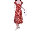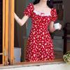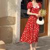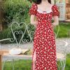 2025 Nuevo Verano para Mujer Estilo Francés Cintura Manga Abullonada Largo Medio Falda para la Hora del Té Vestido Floral Rojo