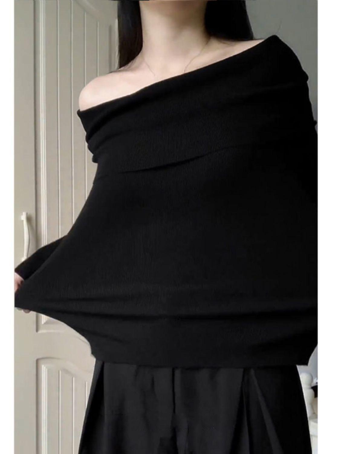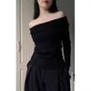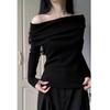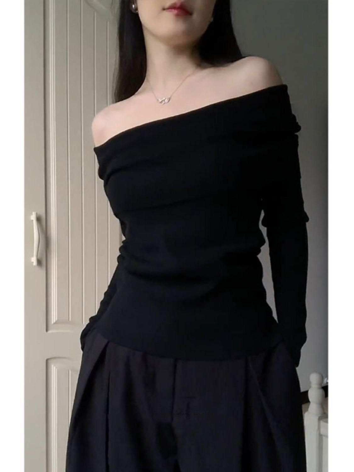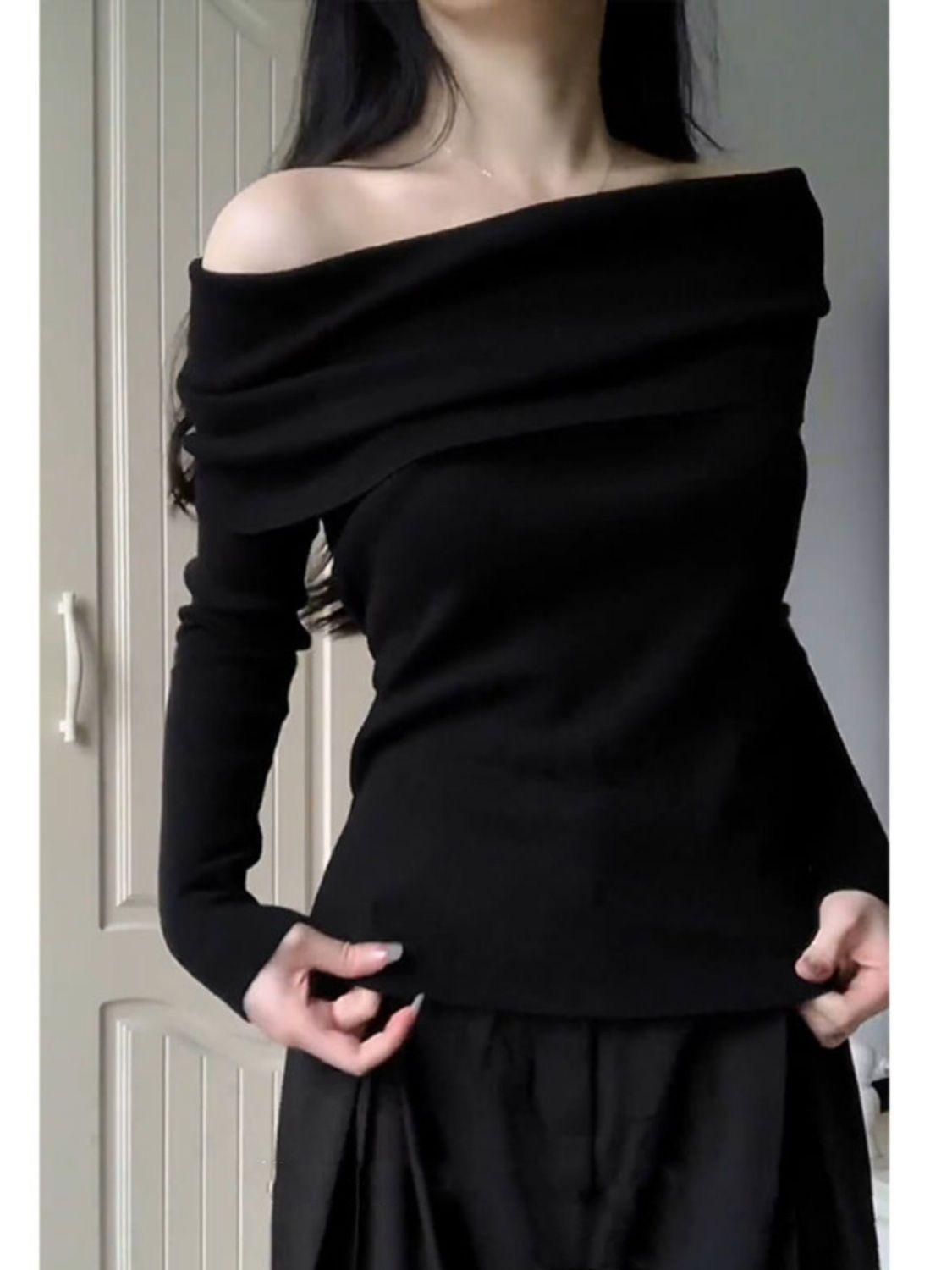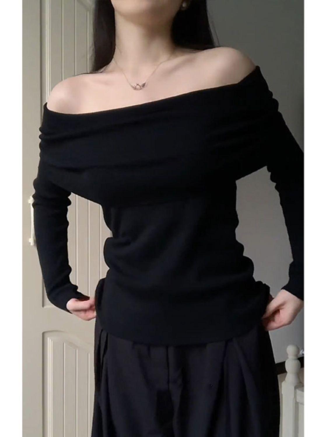 Suéter de manga larga interior ajustado con diseño de hombros descubiertos en color negro francés para mujer, otoño e invierno, con sentido de nicho