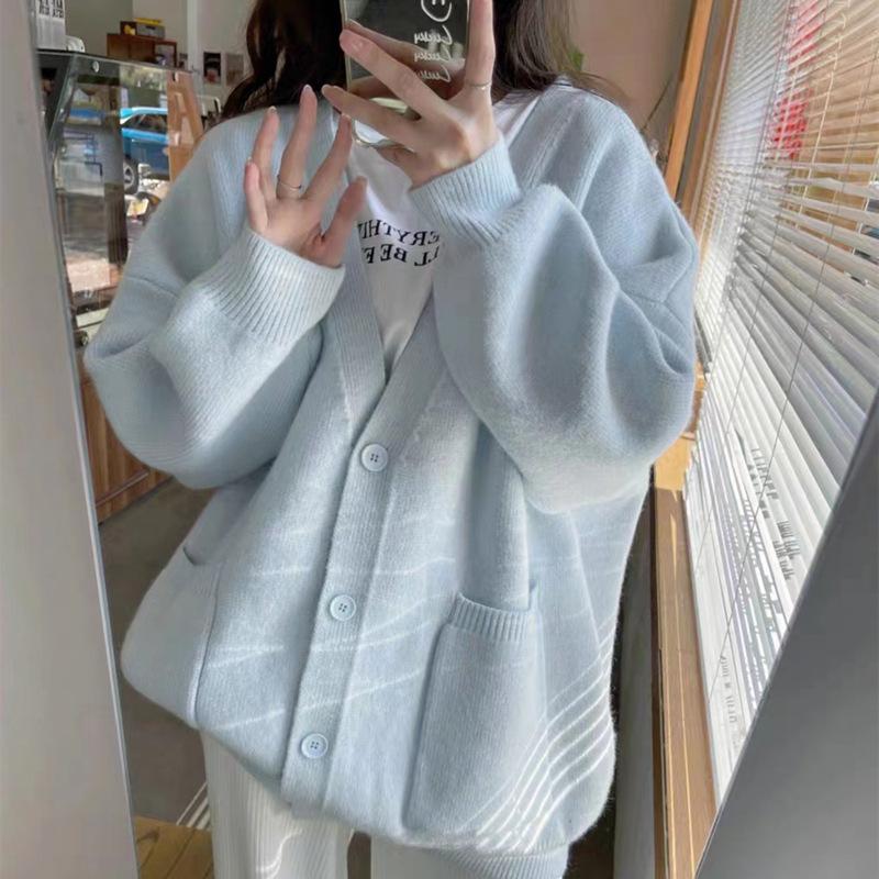 |  | Suéter de punto de color sólido estilo suave serie leche azul con cuello en V para mujer 2023 nuevo estilo holgado perezoso chaqueta cárdigan de punto a la modaGran precio:¥45 |