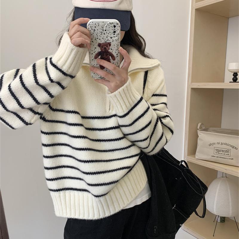 |  | Suéter pulóver de medio cierre estilo coreano con solapa a rayas de color contrastante para mujer otoño e invierno nuevo estilo holgado perezoso versátil suéter tejidoGran precio:¥50 |