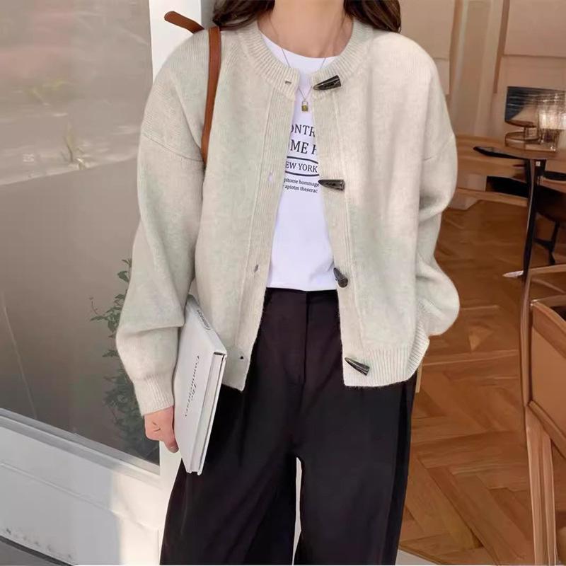 | |  | Cárdigan suéter de temperamento con botón de cuerno de alta calidad estilo japonés para mujer primavera y otoño 2024 nuevo suelto versátil chaqueta de puntoGran precio:¥45 |