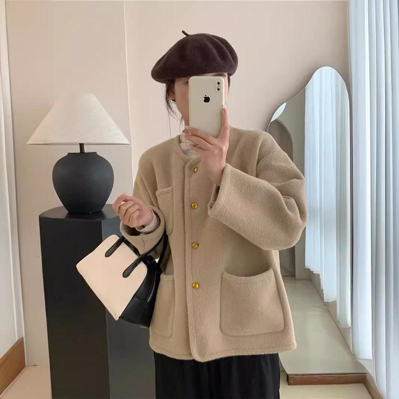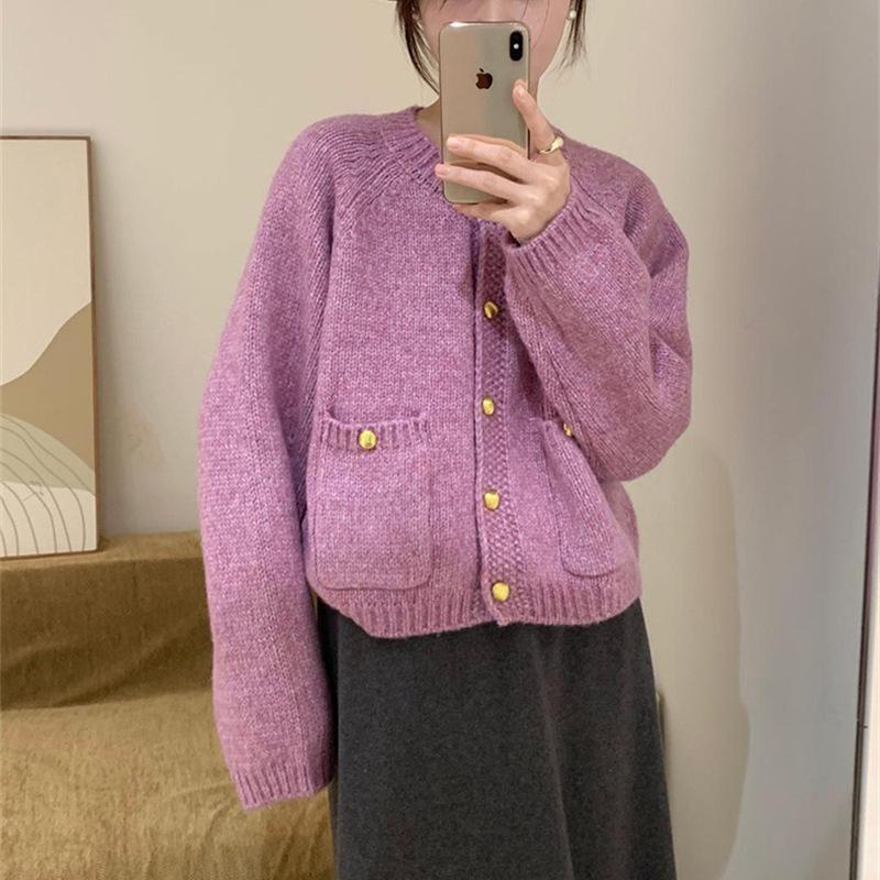 | |  | Cárdigan de punto para mujer de alta gama con cuello redondo y botones dorados en color caramelo de otoño 2024 de Dongdaemun, Corea del Sur, chaqueta suéter versátilGran precio:¥42 |