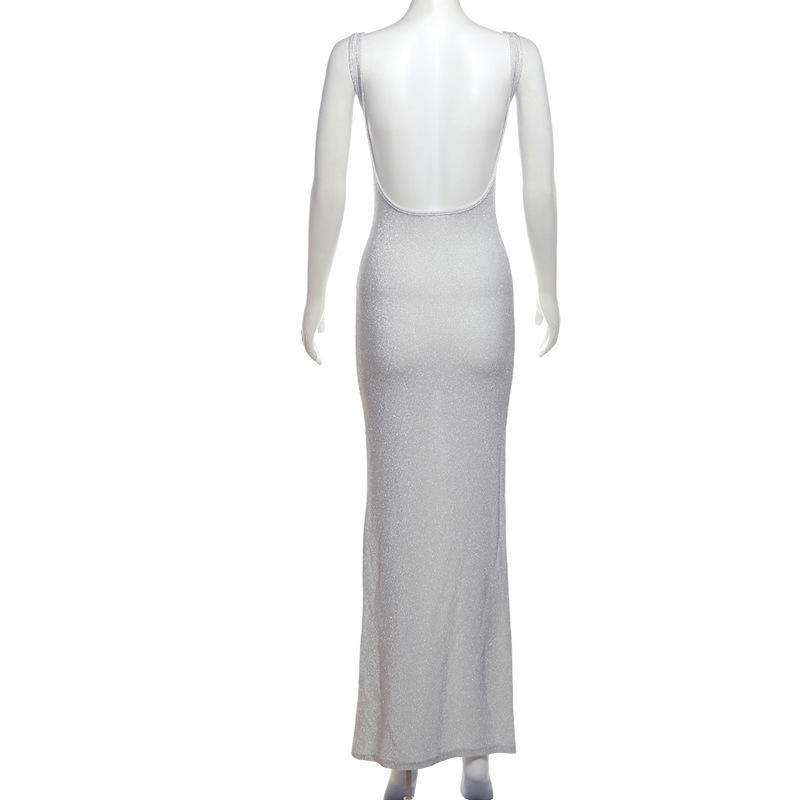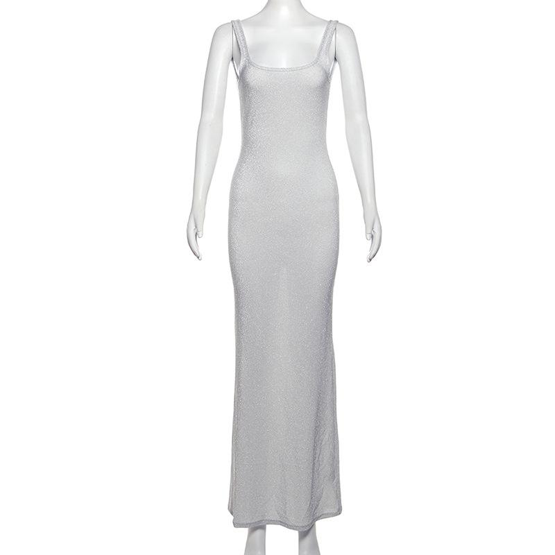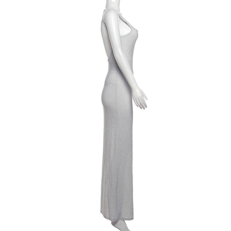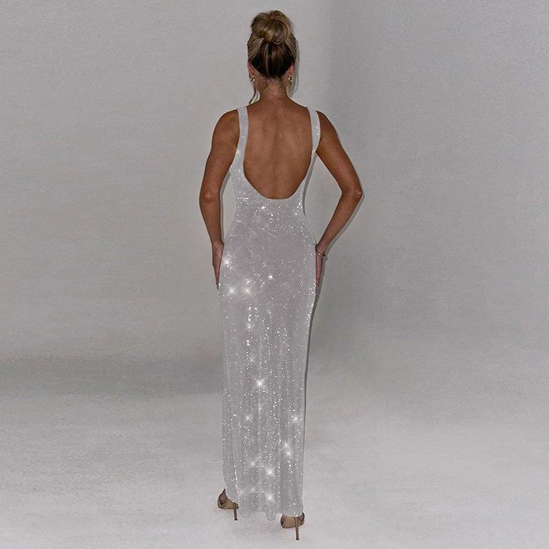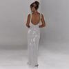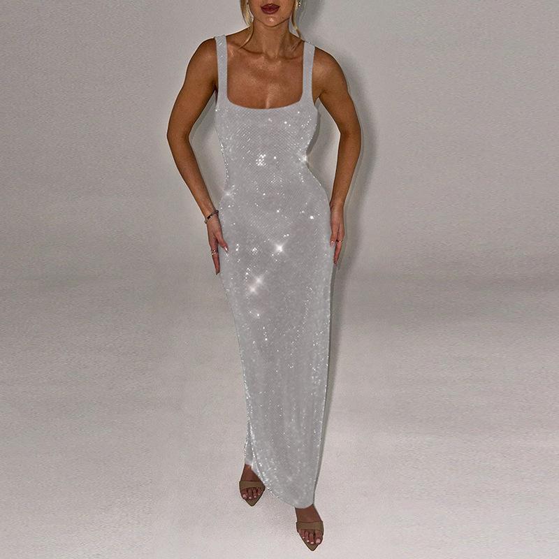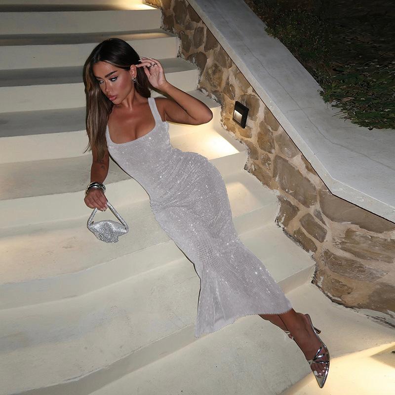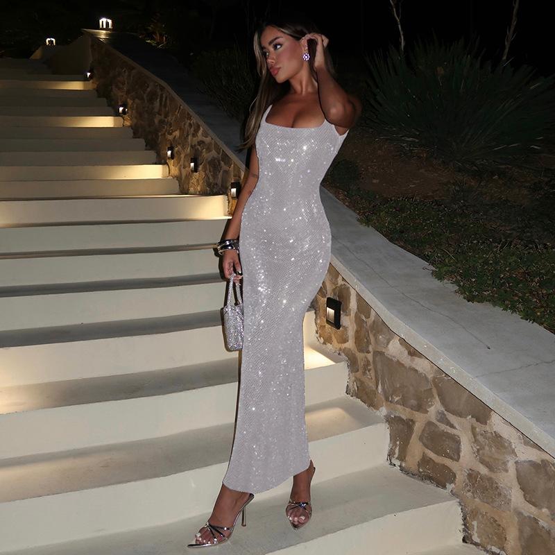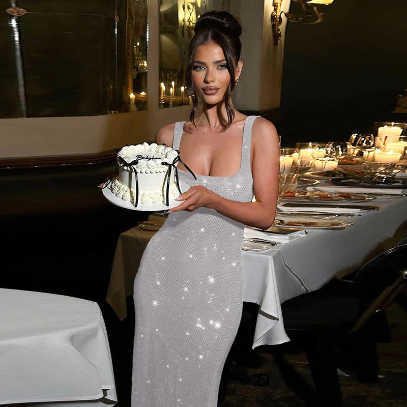 Vestido elegante ajustado a la cadera con lentejuelas de color sólido y cuello de un solo personaje para mujer de otoño 2024 de estilo europeo y americano