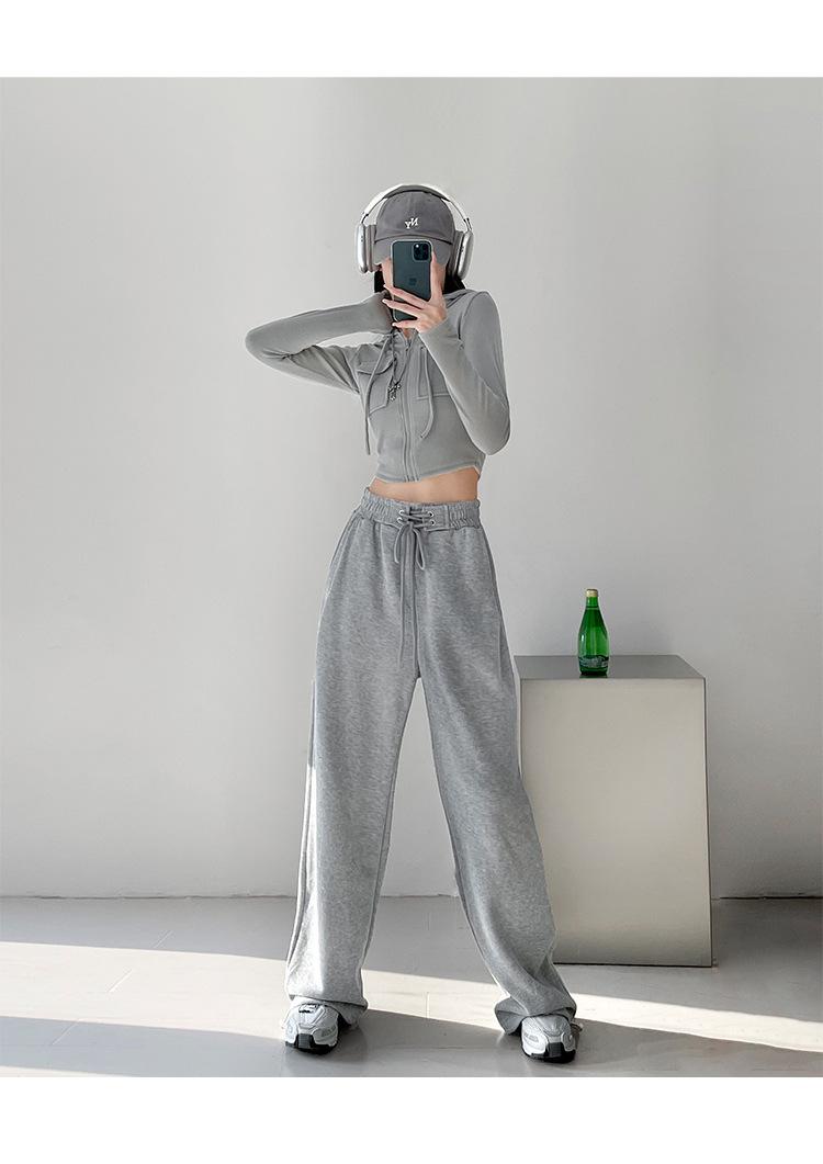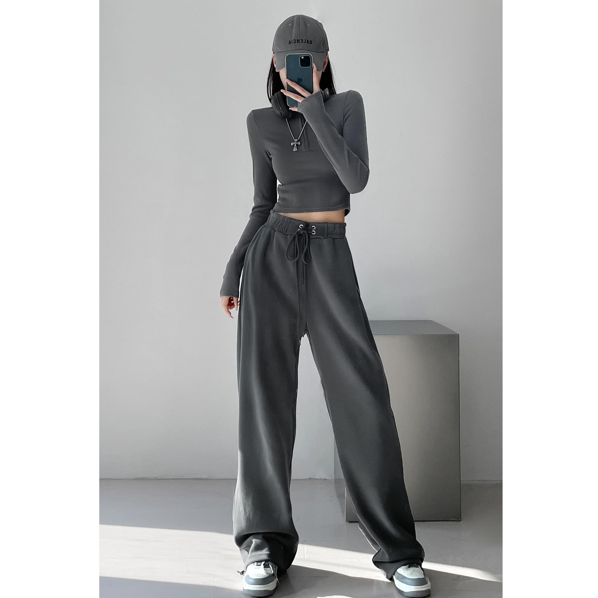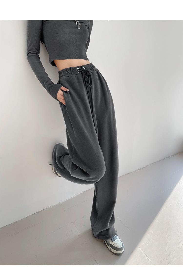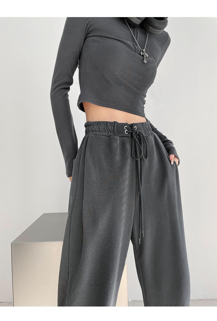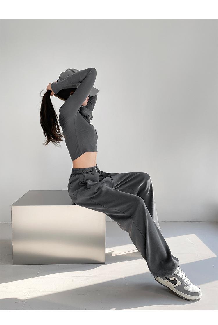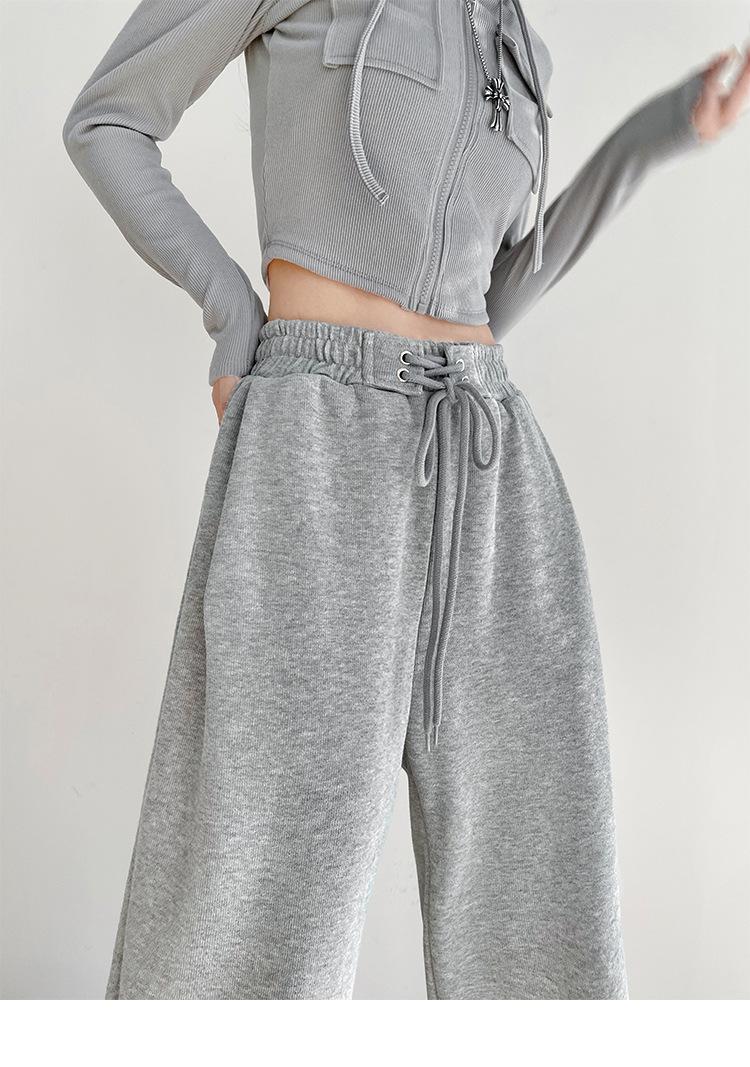 Pantalones deportivos ajustados grises de estilo americano para mujer, con cordón, para primavera y otoño, holgados, rectos y anchos.