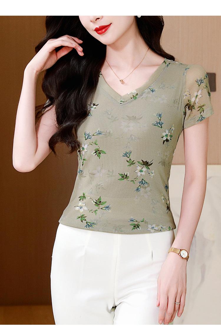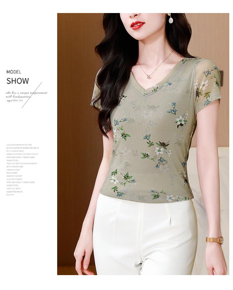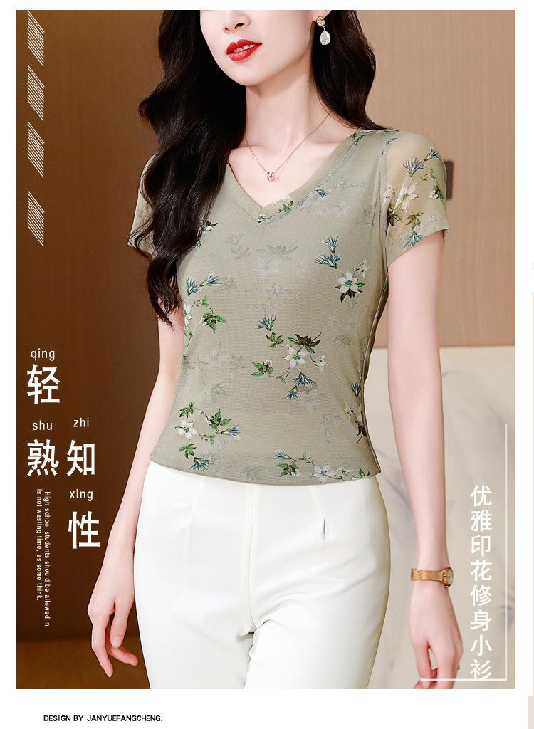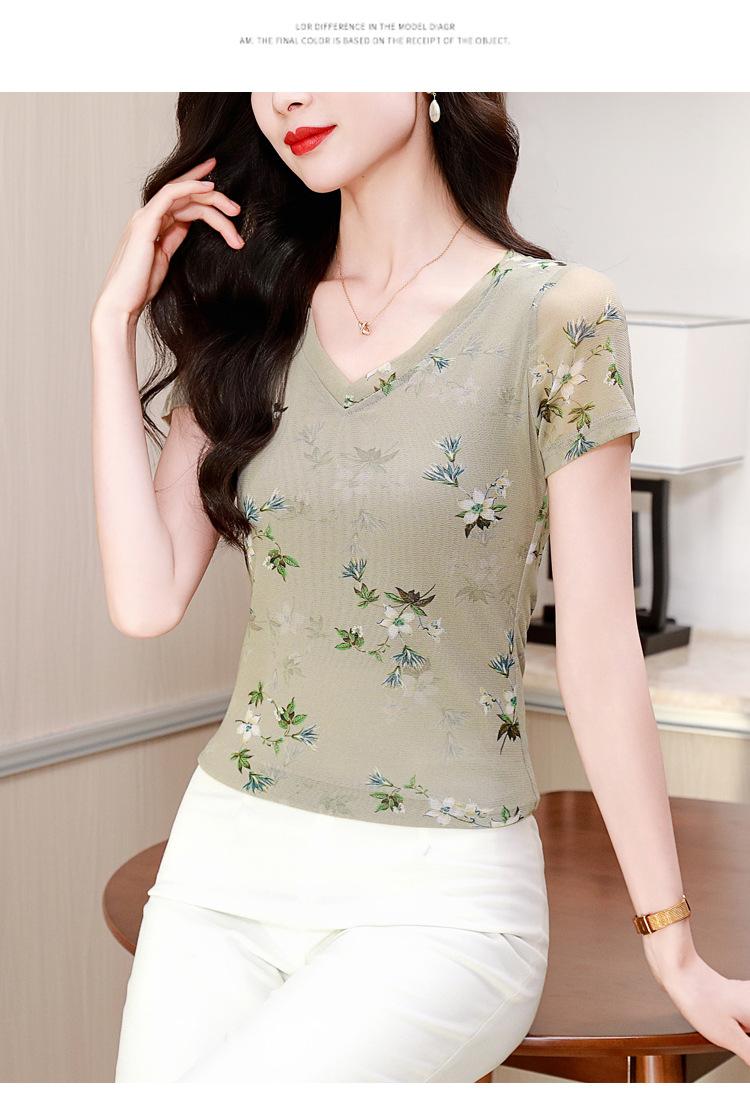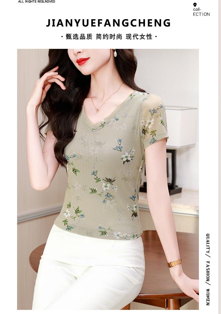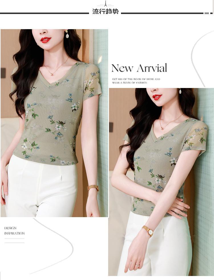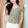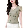 Camiseta de Moda de Malla Estampada de Manga Corta con Cuello en V Verano 2025 Jersey Combinable Ajustado Adelgazante Top de Moda para Mujer