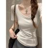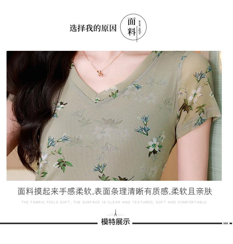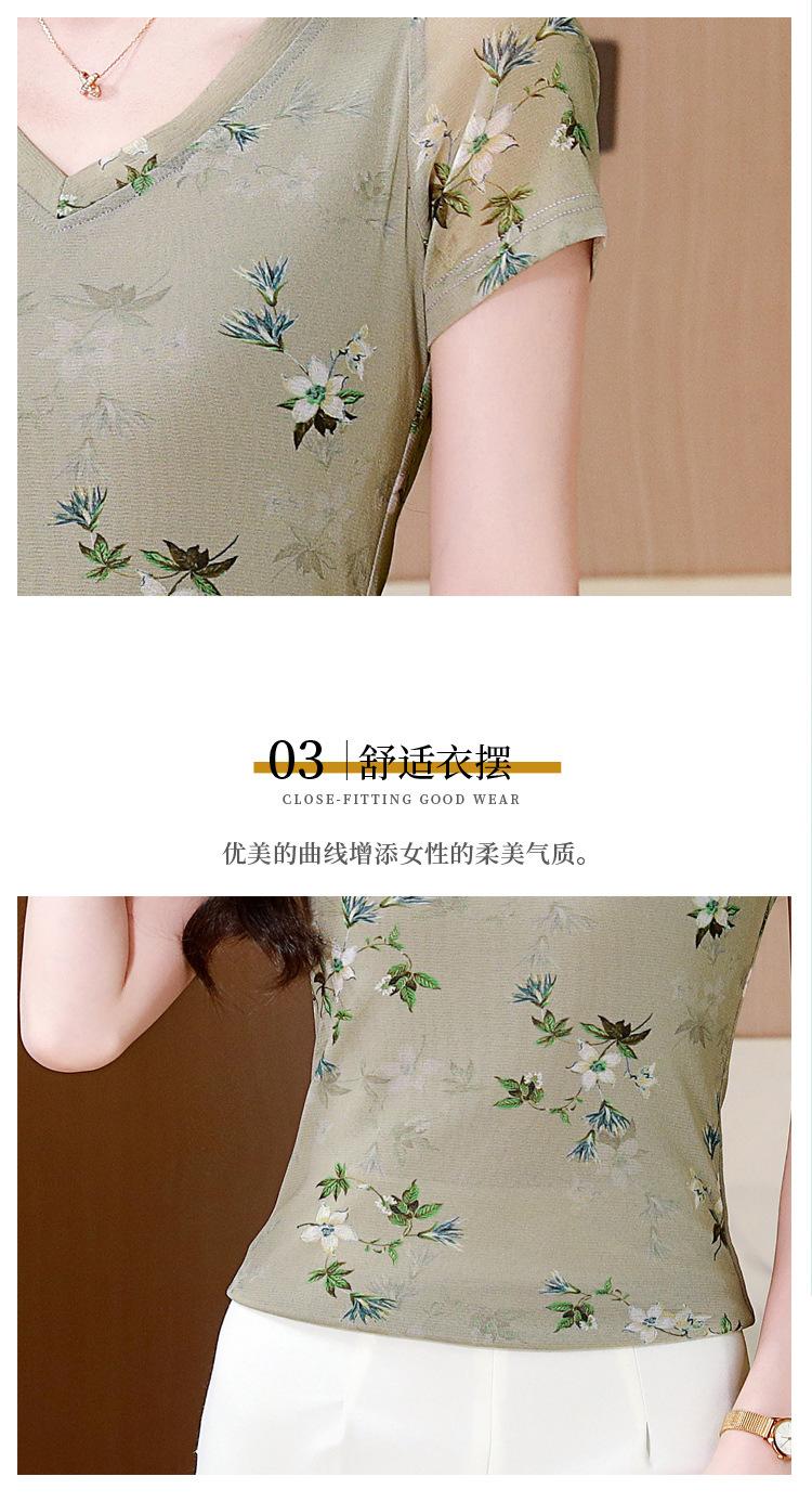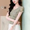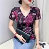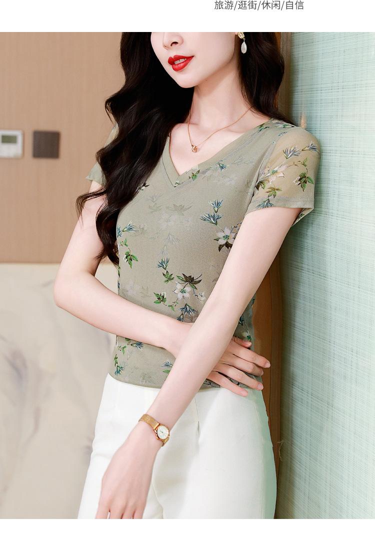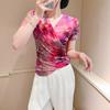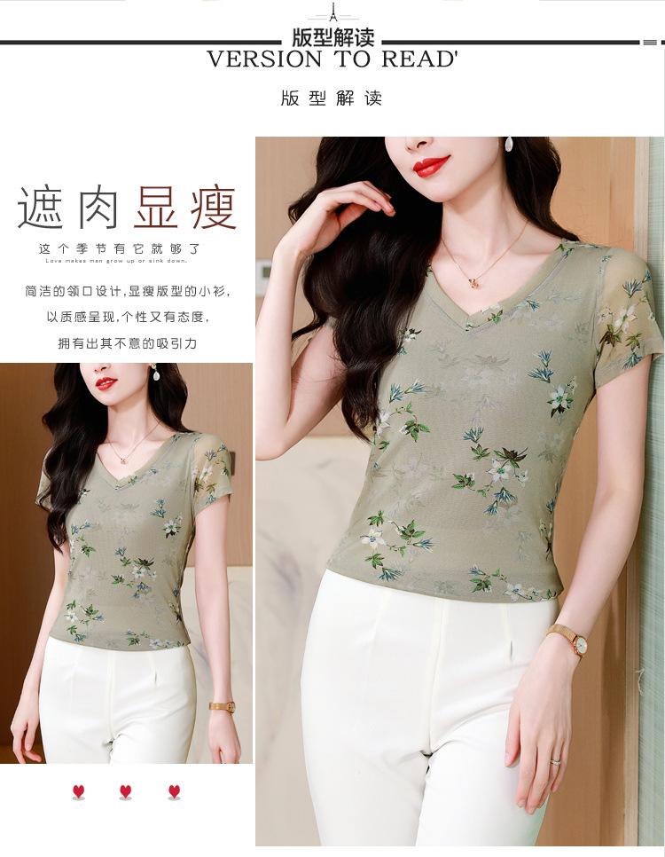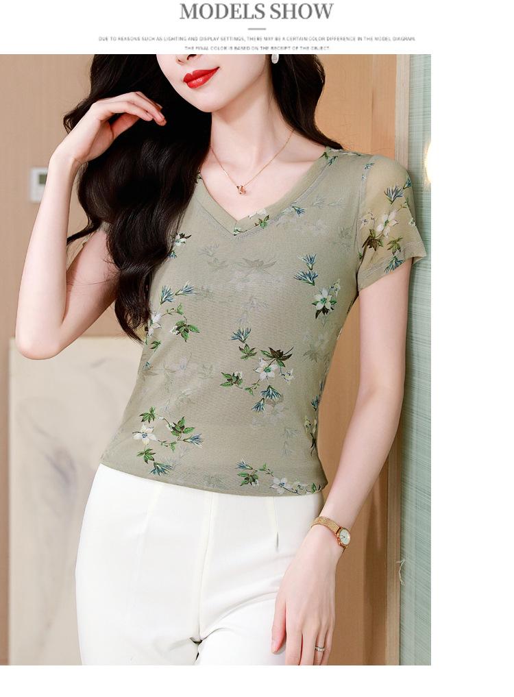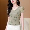 Camiseta de Moda de Malla Estampada de Manga Corta con Cuello en V Verano 2025 Jersey Combinable Ajustado Adelgazante Top de Moda para Mujer