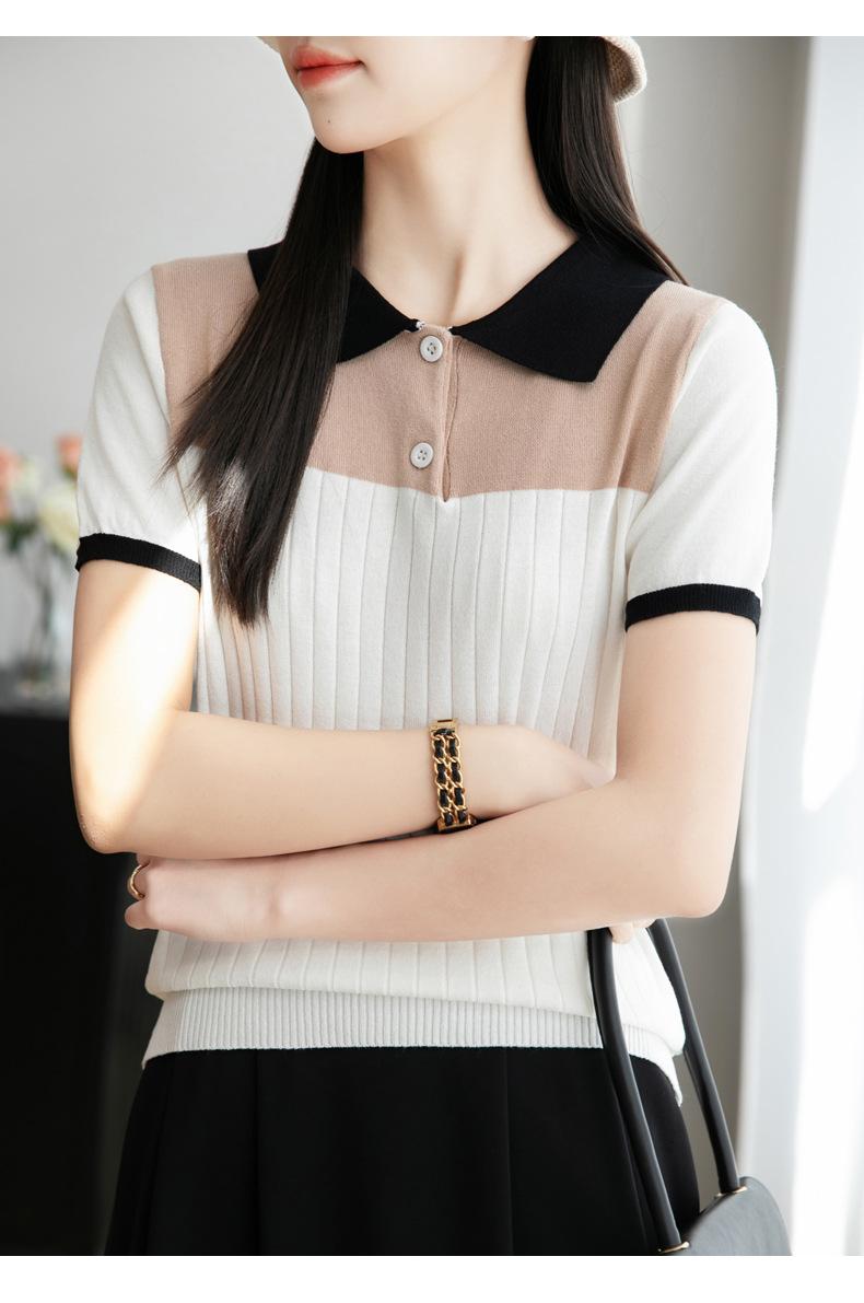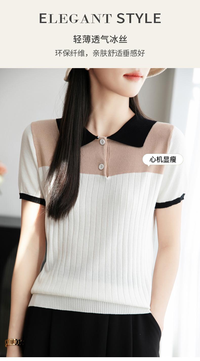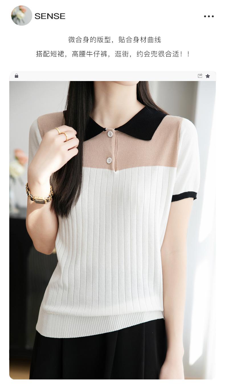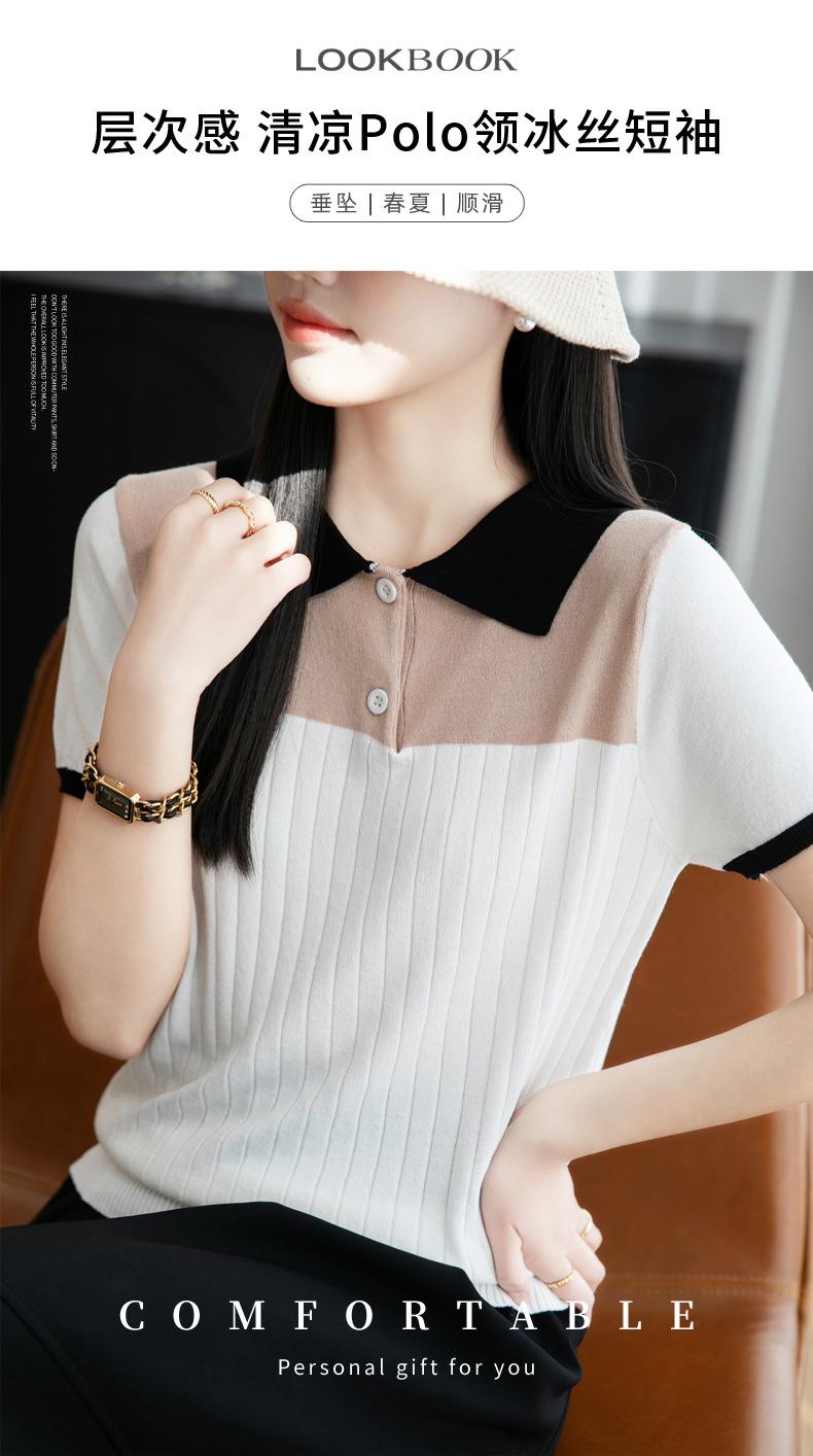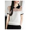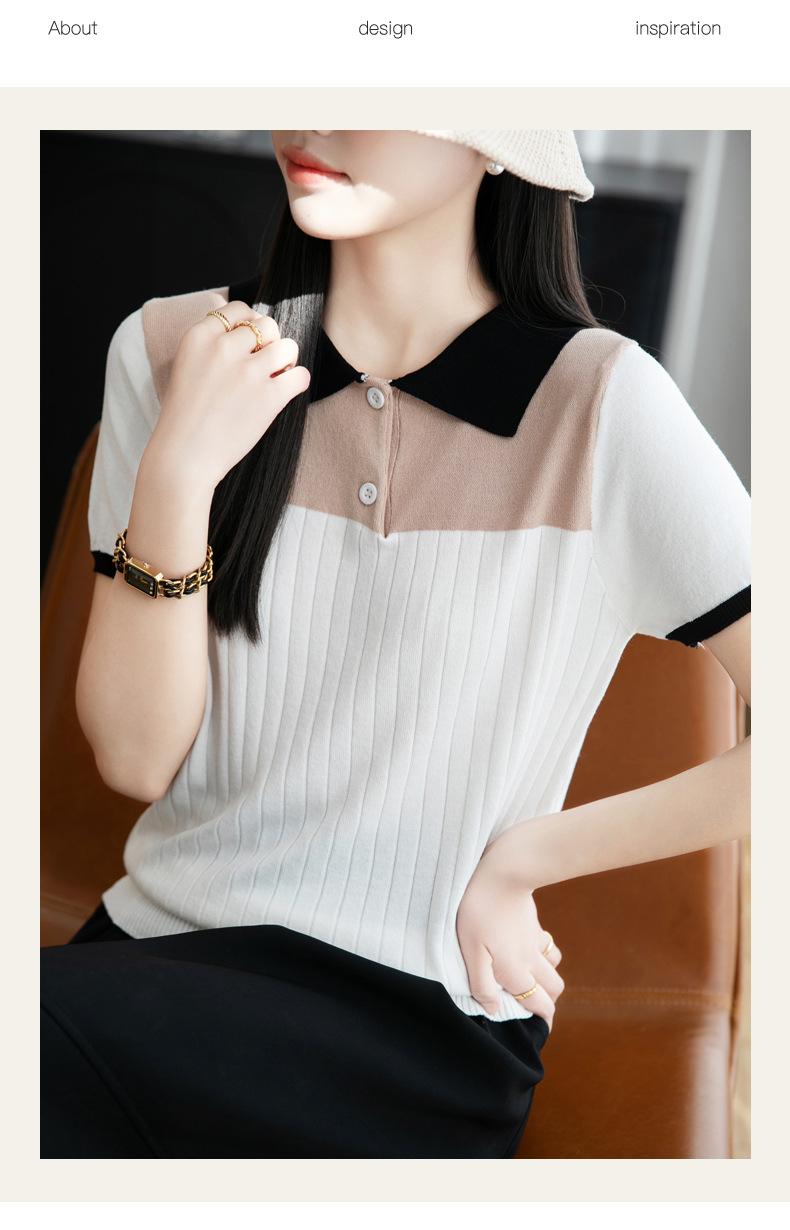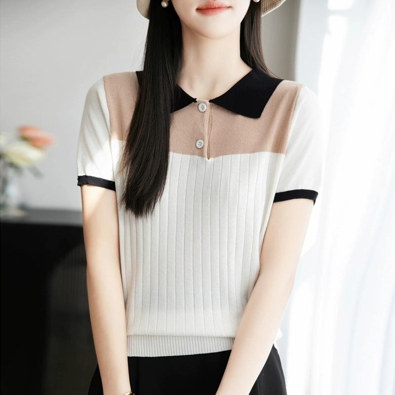 2025 Estilo Coreano Hermosa Camiseta de Punto de Manga Corta con Cuello Polo para Mujer Verano para Ir al Trabajo Combinación Versátil Camiseta de Punto Camiseta Top de Seda Helada