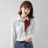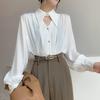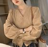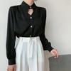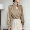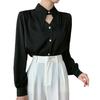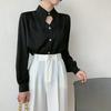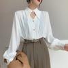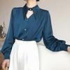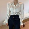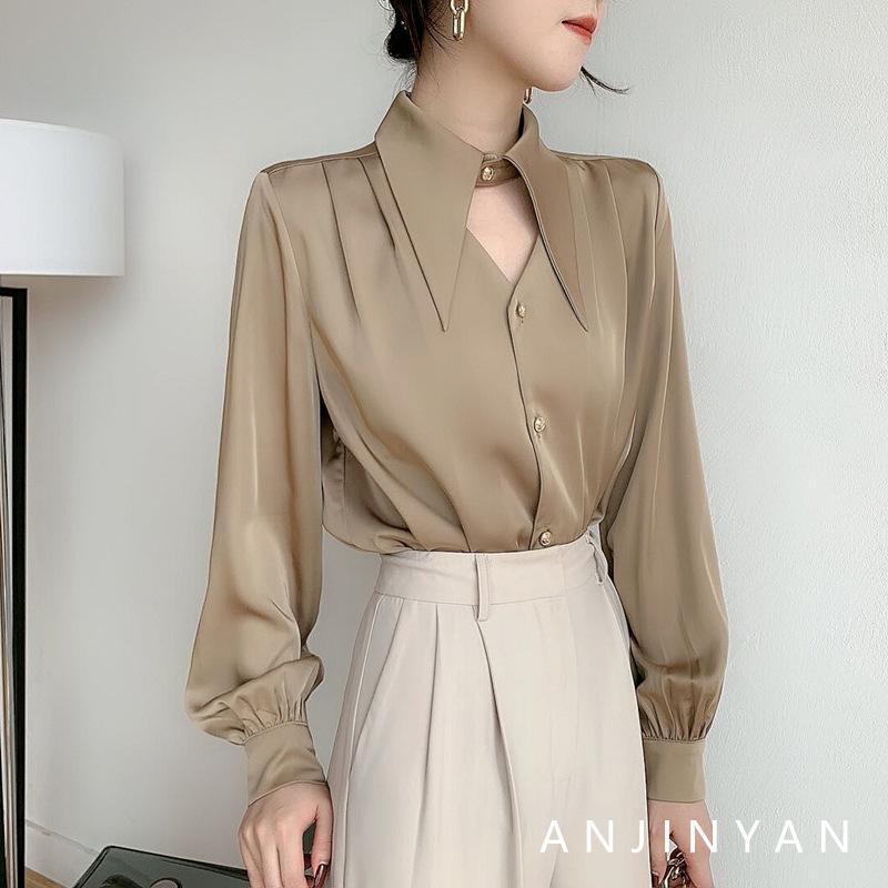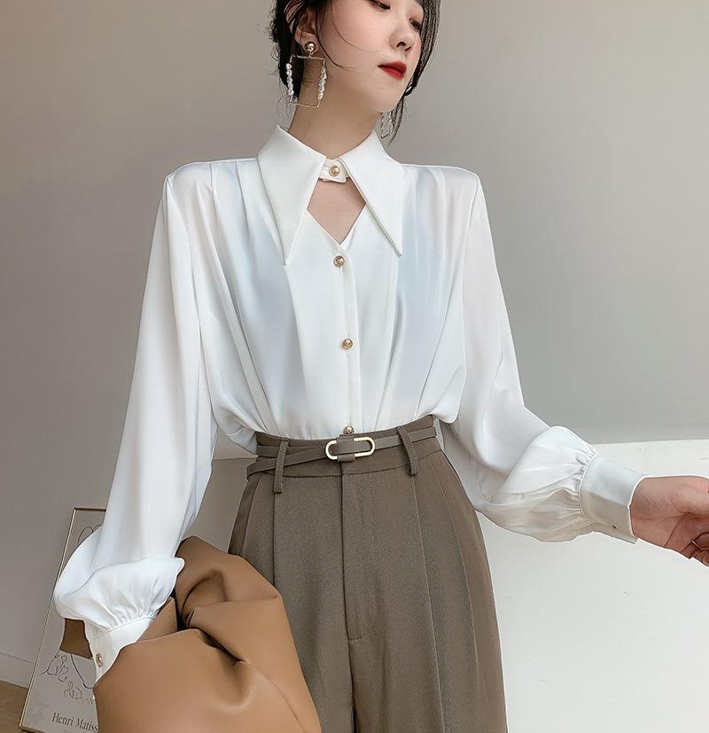2021 Primavera y Otoño Nuevo Diseño Sentido Moda Calado Un Solo Botón Satén Manga Larga Drapeado Elegante Estilo Coreano Camisa para Mujer